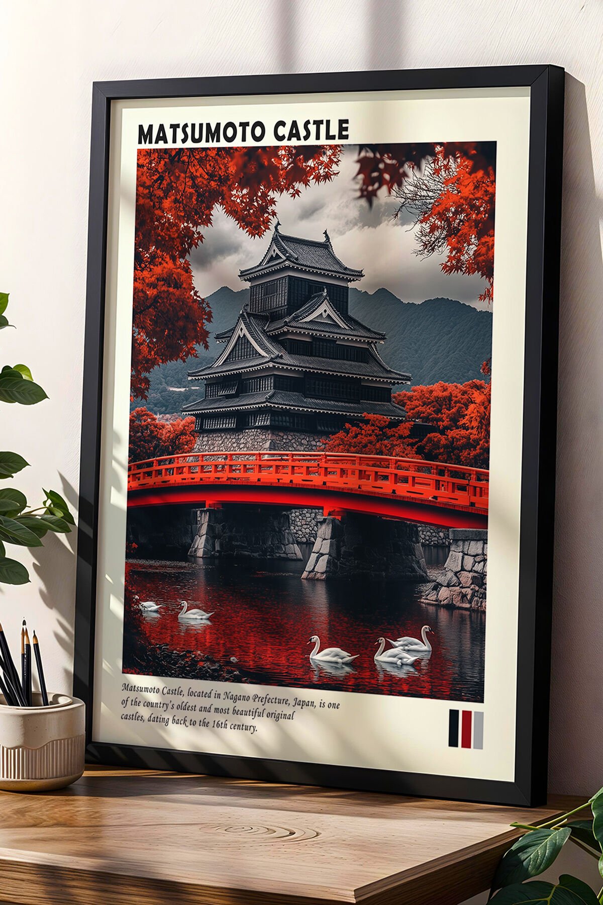 SİYAH - Japonya Matsumoto Kalesi Sonbahar Manzarası Doğal Ahşap Çerçeveli Duvar Tablosu