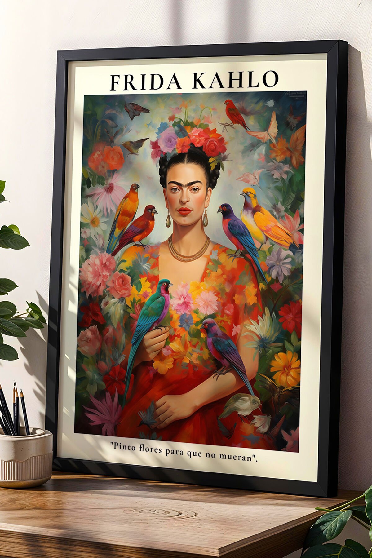 SİYAH - Kahlo Stili Çiçekler ve Kuşlar Temalı Doğal Ahşap Çerçeveli Duvar Tablosu