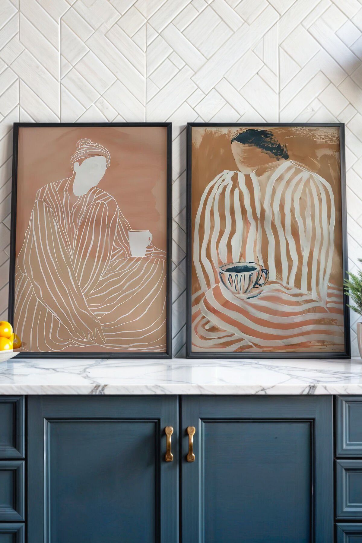 SİYAH - Kahve Keyfi Minimalist Çizim 2'li Doğal Ahşap Çerçeveli Mutfak Duvar Tablosu