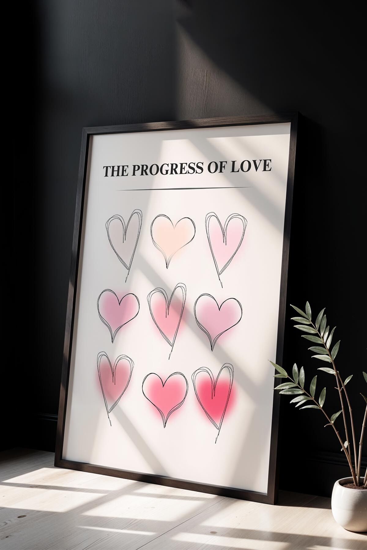 SİYAH - Kalp Harita Minimal Desen Trendy Maksimalist Sanatı Ahşap Çerçeveli Duvar Tablosu