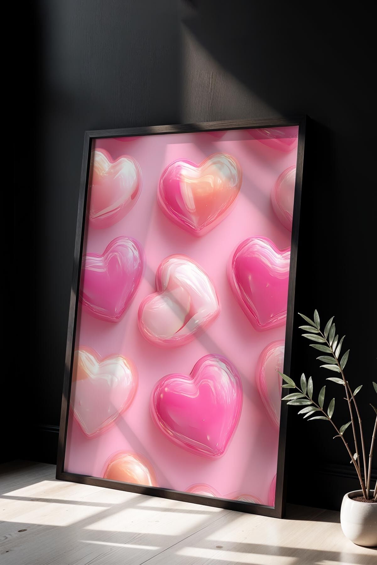 SİYAH - Kalpli Desen Pembe Maksimalist Sanatı Ahşap Çerçeveli Duvar Tablosu