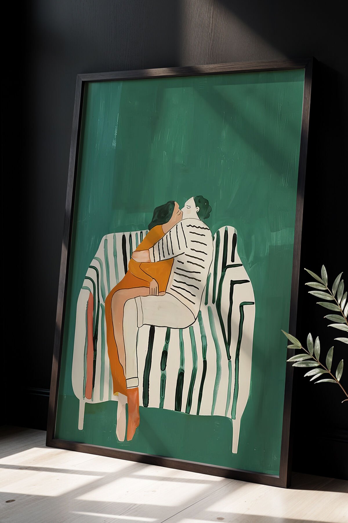 SİYAH - Kanepede romantik çift baskısı Ahşap Çerçeveli Duvar Tablosu