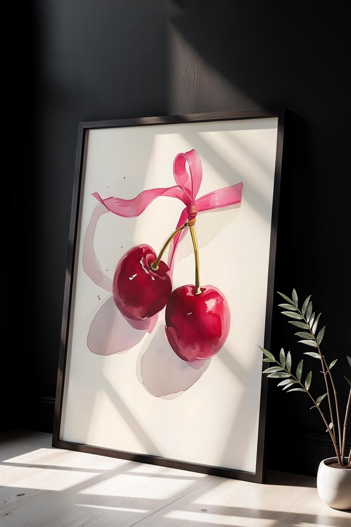 SİYAH - Kiraz Temalı Pembe Maksimalist Sanatı Ahşap Çerçeveli Duvar Tablosu