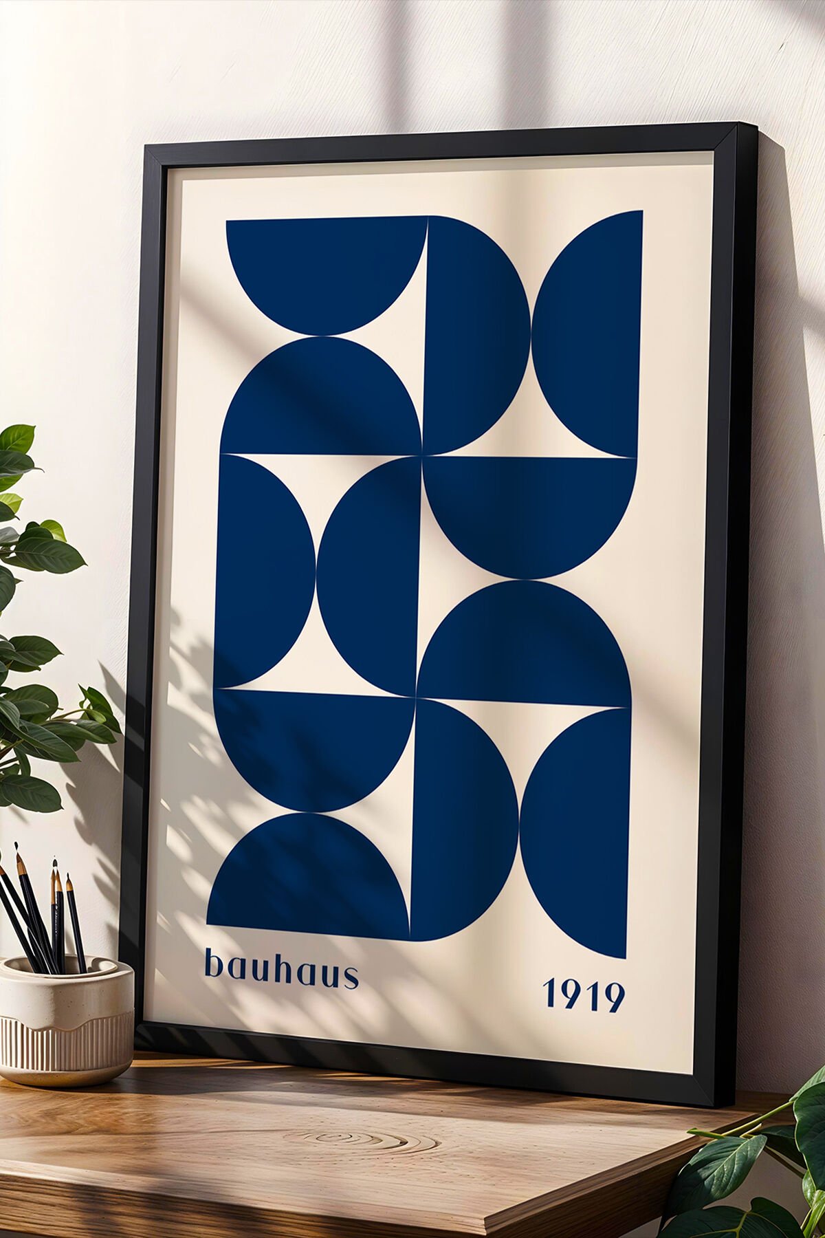 SİYAH - Mavi Bauhaus Stili Vintage Geometrik Sanat Bohem Ahşap Çerçeveli Duvar Tablosu