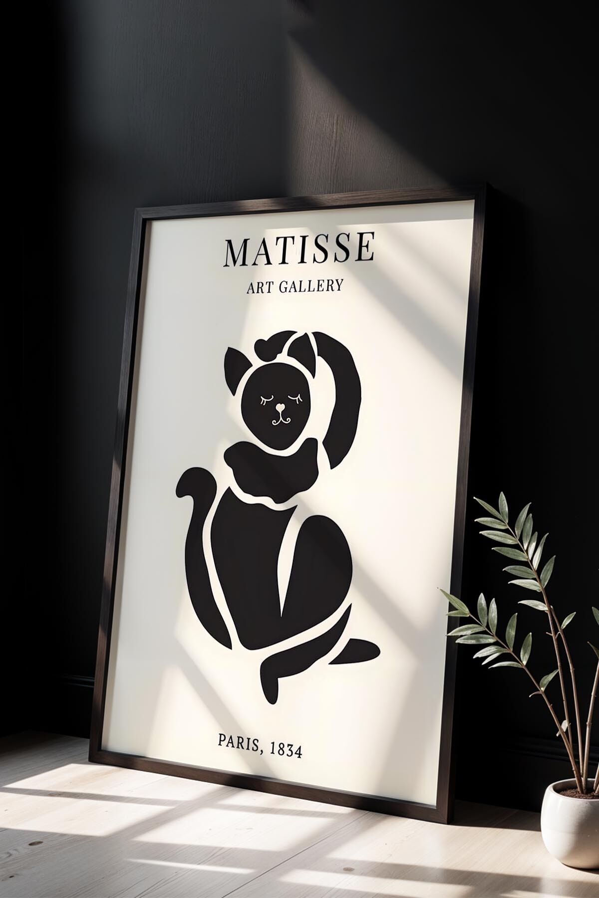 SİYAH - Minimalist Siyah Kedi Bohem Tarzı Soyut Sanat Matisse Doğal Ahşap Çerçeveli Duvar Tablosu