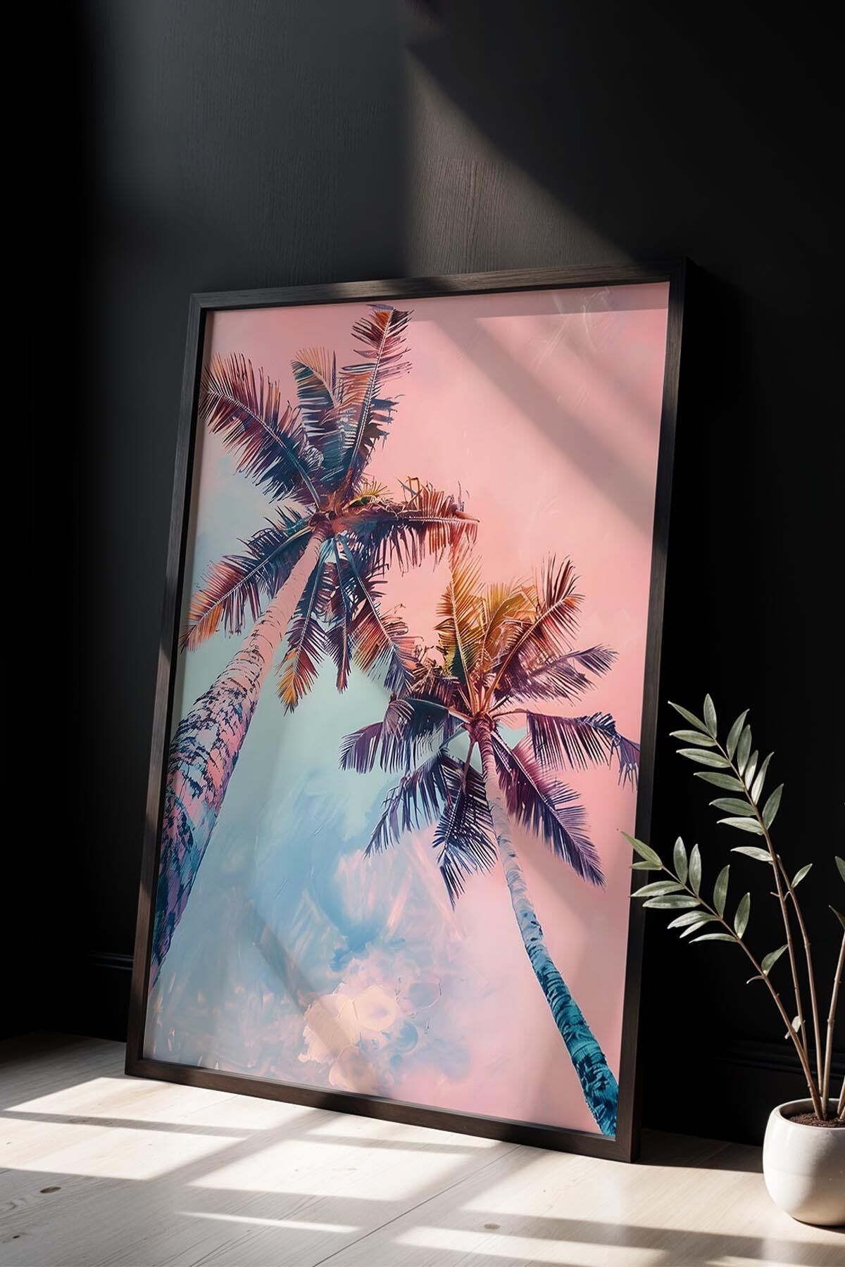 SİYAH - Palmiye Temalı Turuncu Maksimalist Sanatı Ahşap Çerçeveli Duvar Tablosu