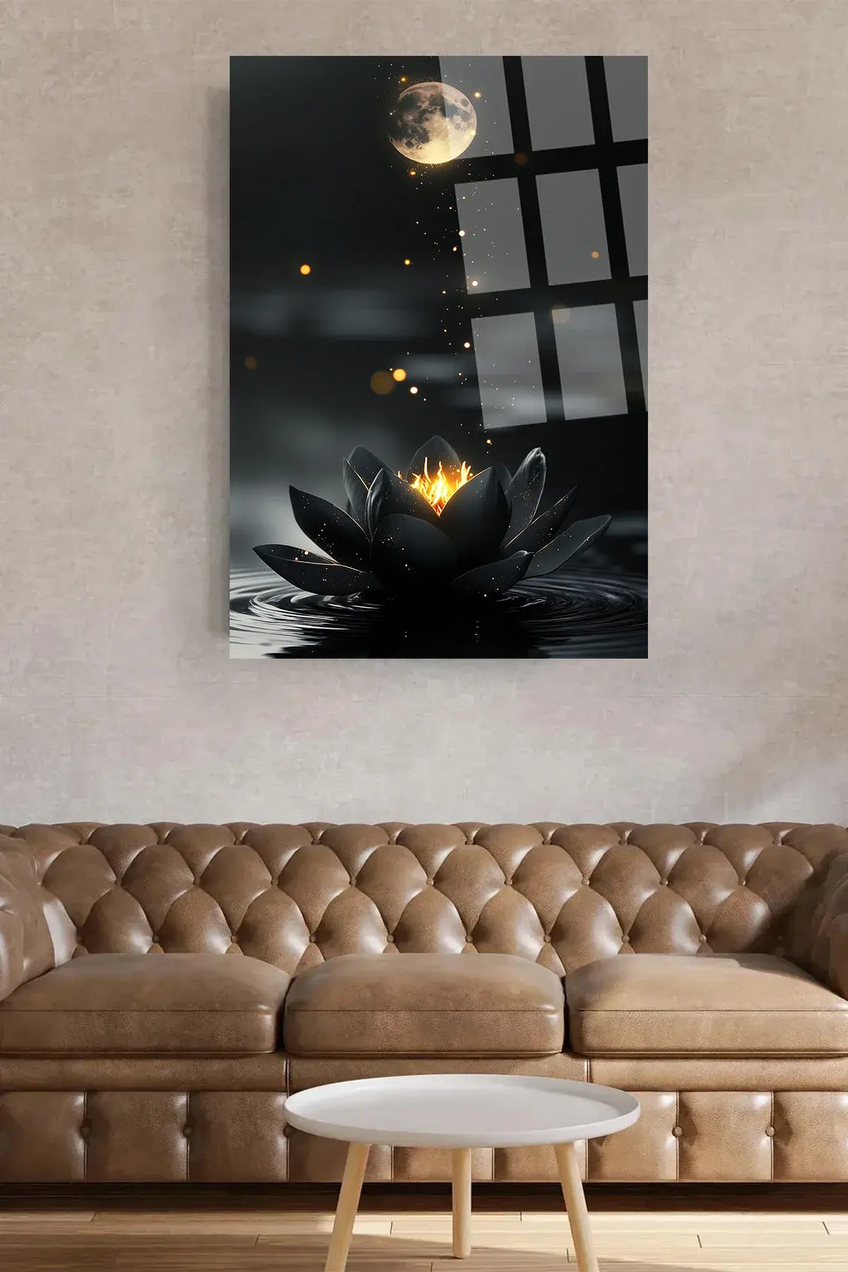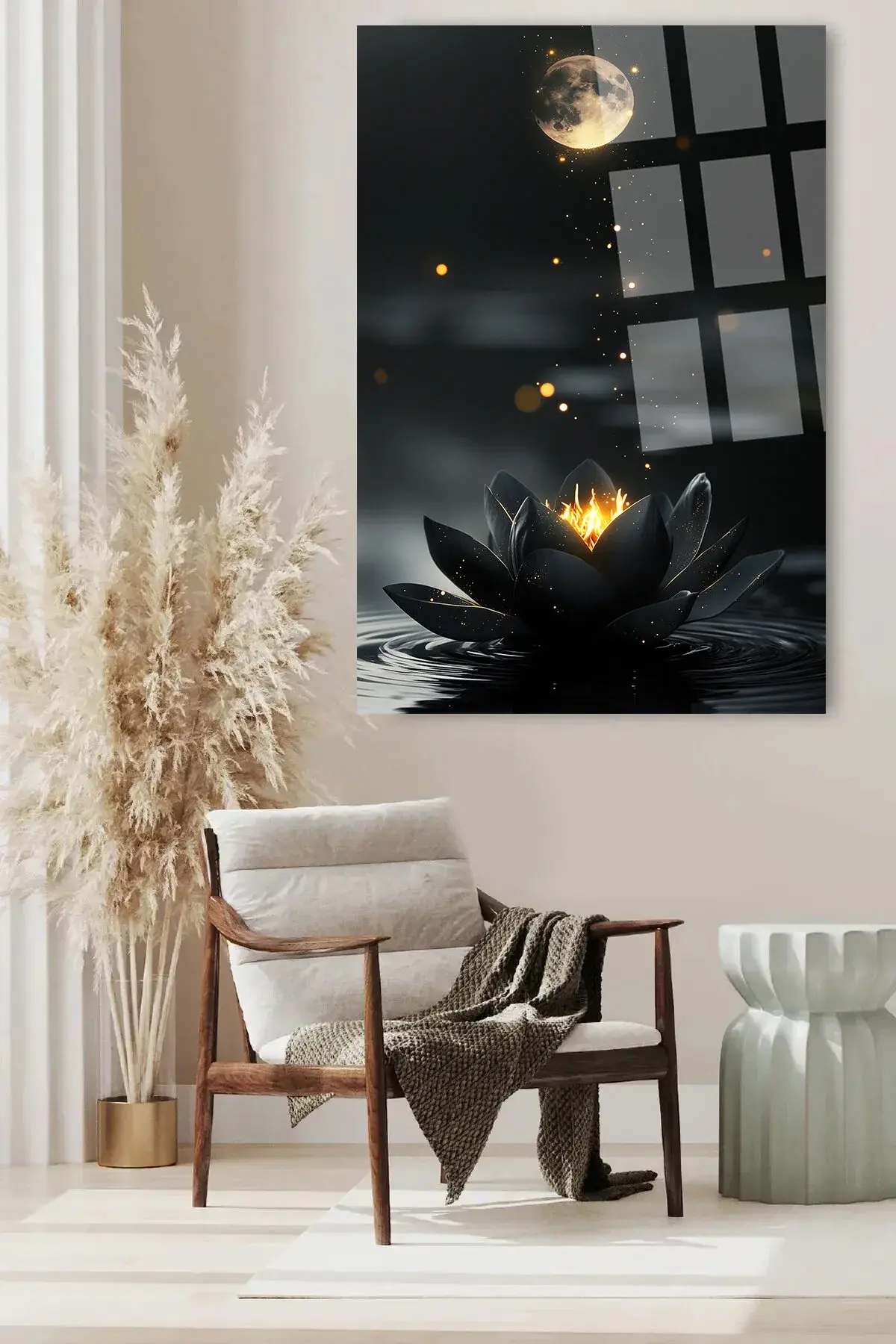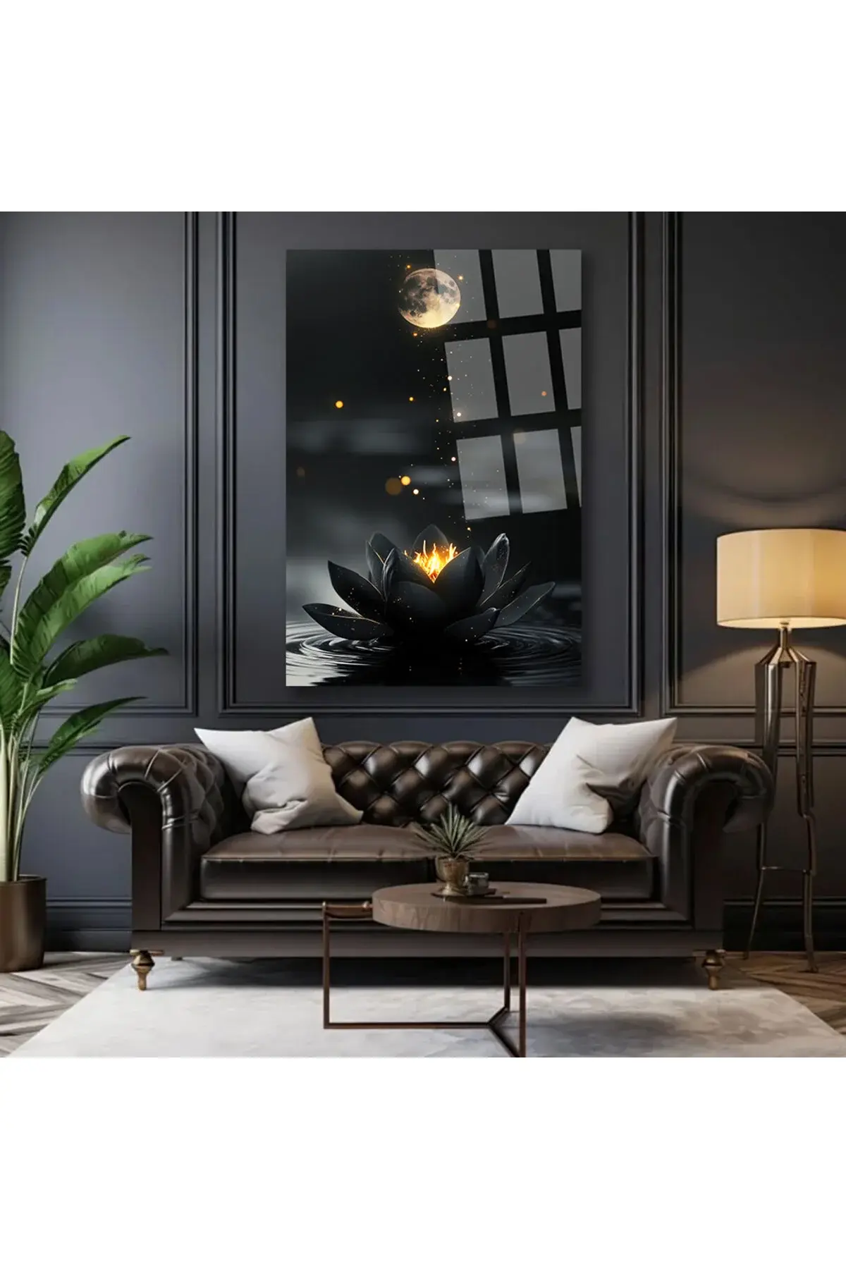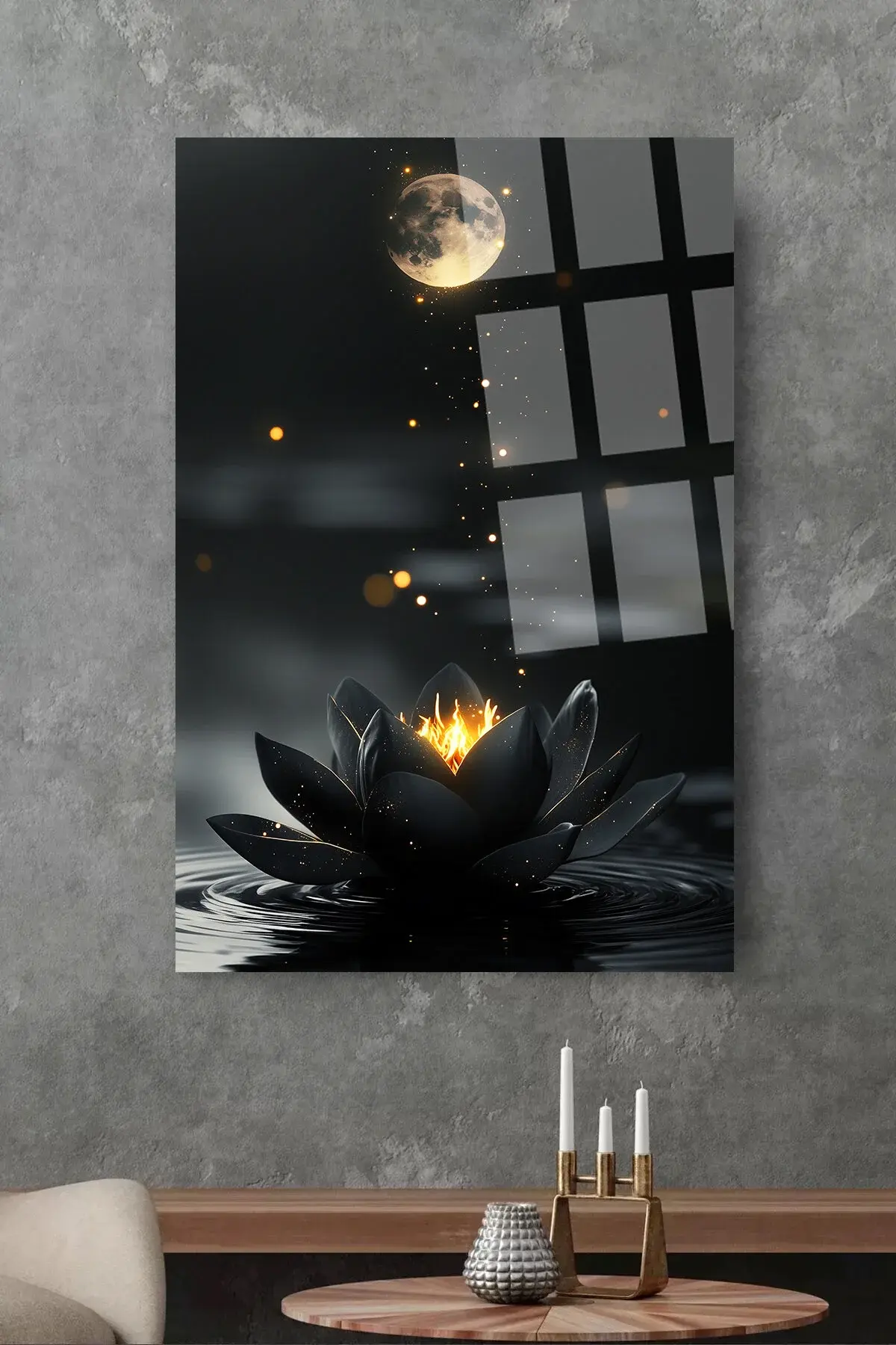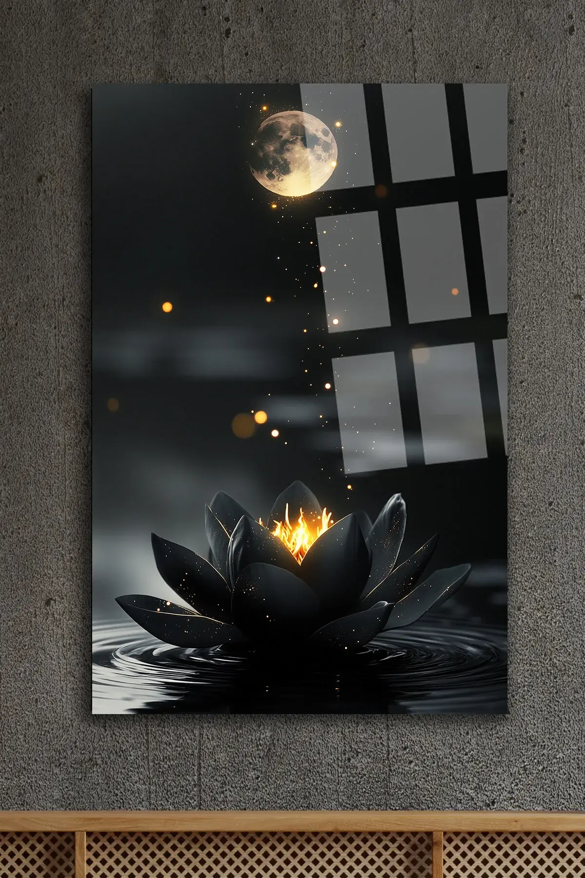 SİYAH PARILDAYAN HARİKA LOTUS ÇİÇEĞİ TABLOSU ULRTA CANLI RENKİ CAM TABLO EV HEDİYESİ KIRILMAZ CAM Siyah