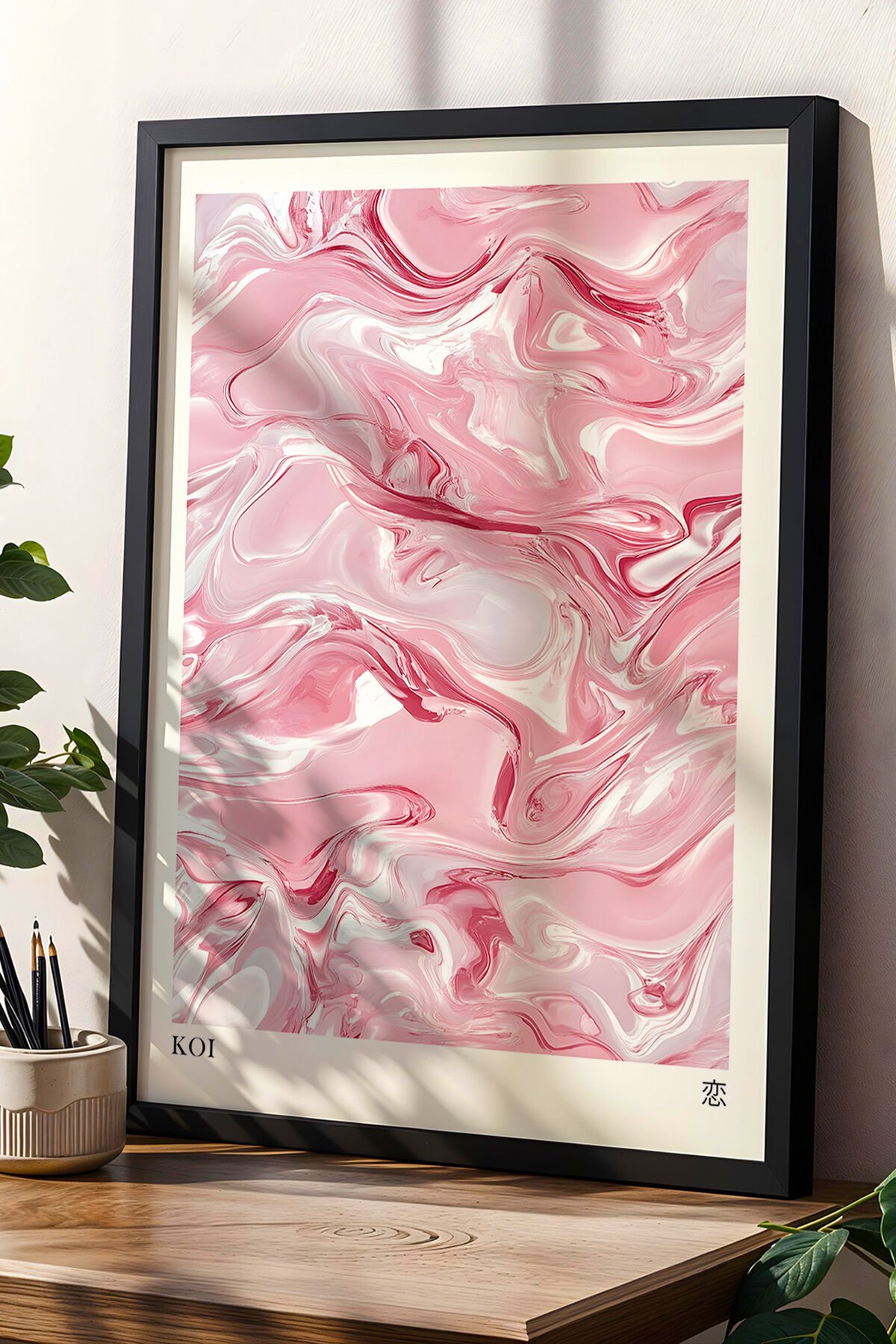SİYAH - Pastel Pembe Tonlarda Soyut Dalga Desenli Japandi Ahşap Duvar Tablosu