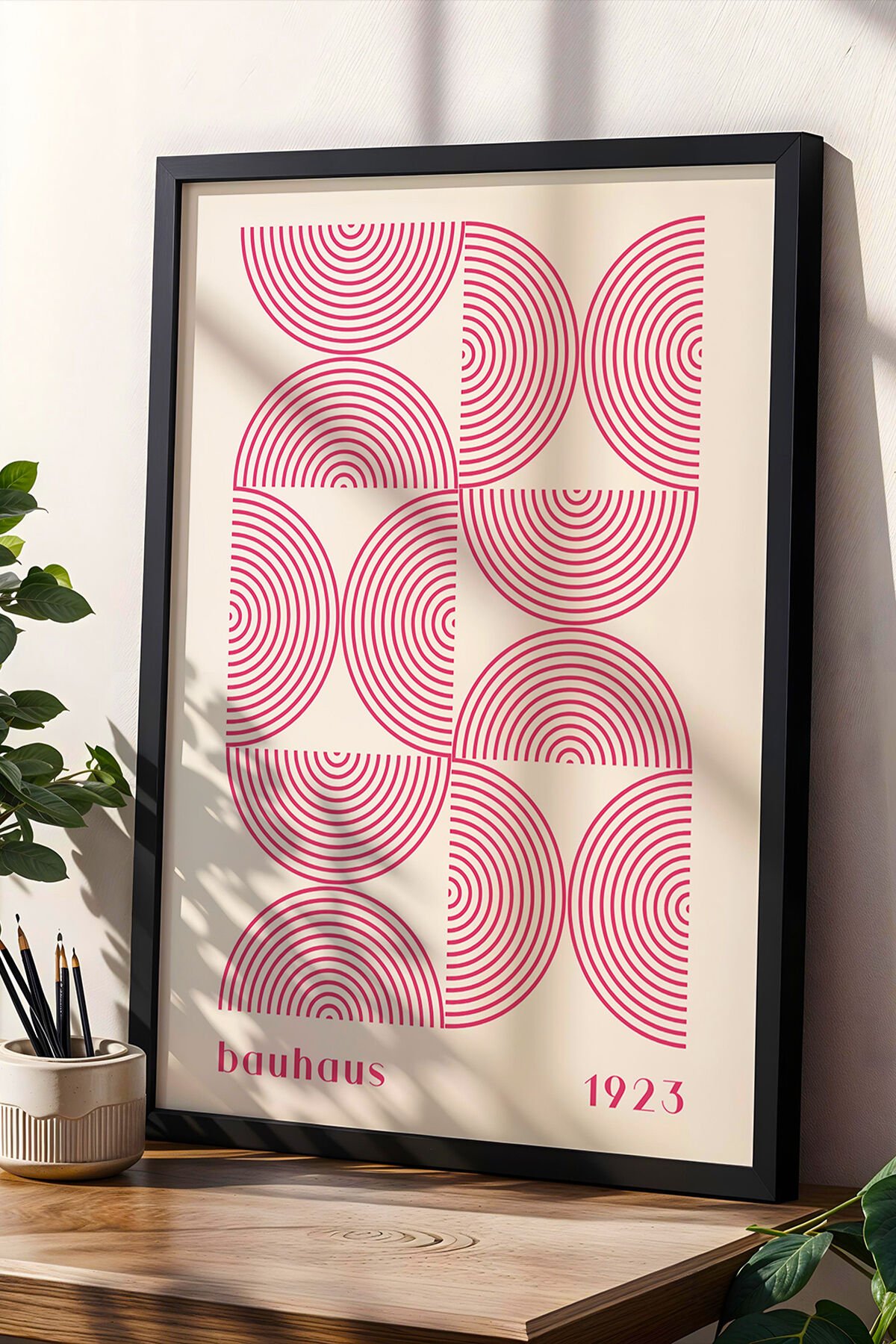 SİYAH - Pembe Bauhaus Stili Minimalist Vintage Geometrik Sanat Ahşap Çerçeveli Duvar Tablosu