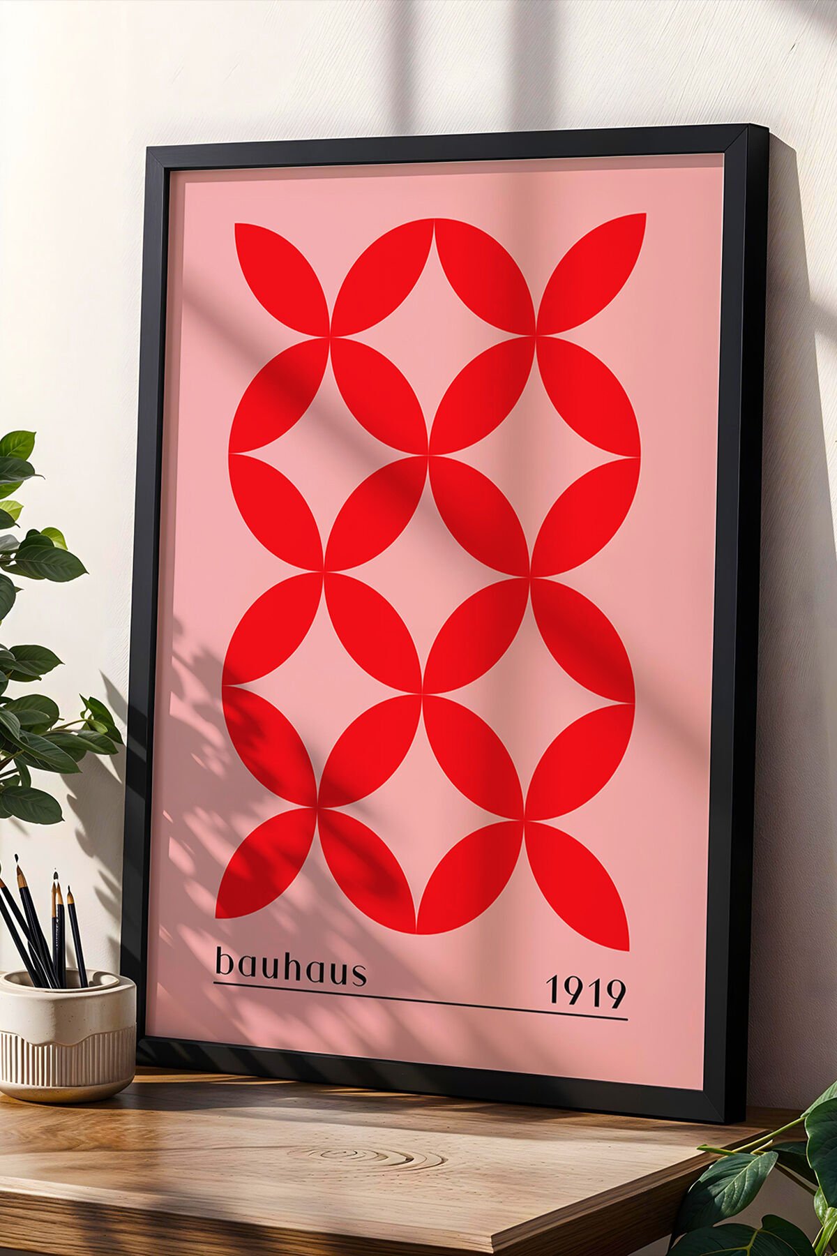 SİYAH - Pembe Bauhaus Stili Vintage Geometrik Sanat Ahşap Çerçeveli Duvar Tablosu
