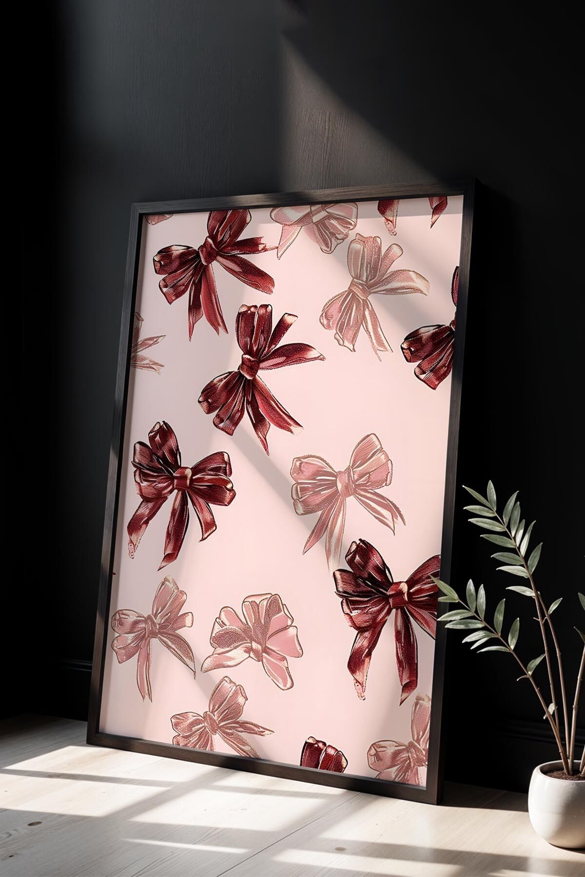 SİYAH - Sakura Ağacı Deseni Pembe Maksimalist Sanatı Ahşap Çerçeveli Duvar Tablosu