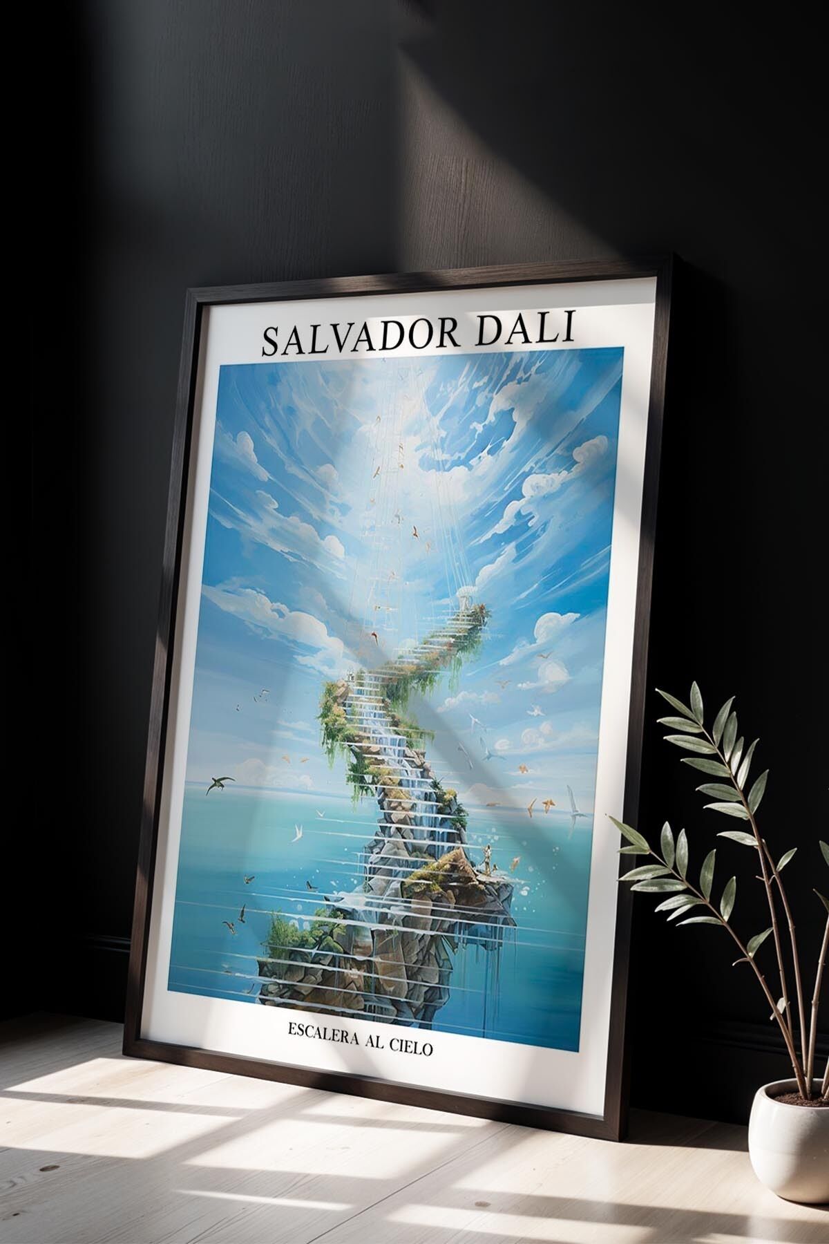 SİYAH - Salvador Dali Bulut Merdiveni ve Kuşlar Ahşap Çerçeveli Duvar Tablosu