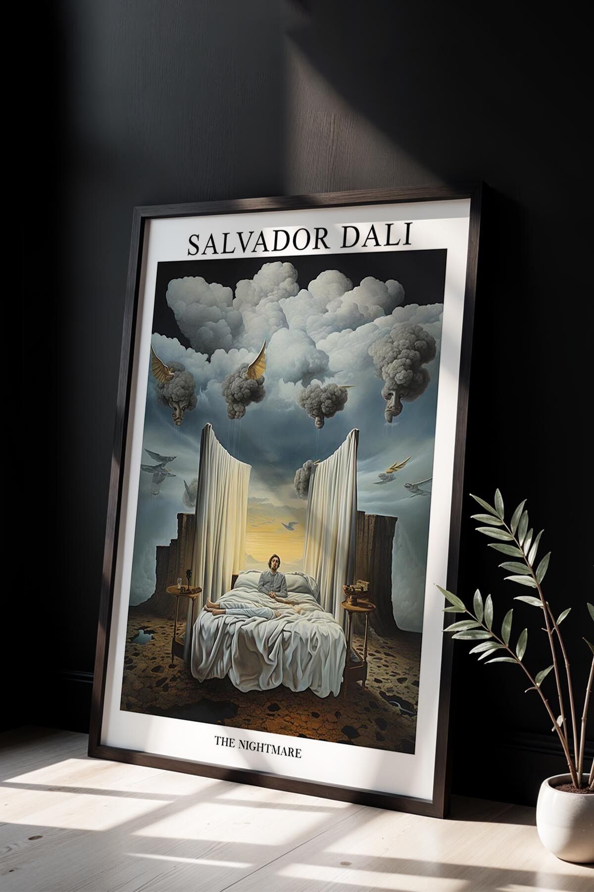 SİYAH - Salvador Dali Kabus Sahnesi ve Yatak Figürü Ahşap Çerçeveli Duvar Tablosu