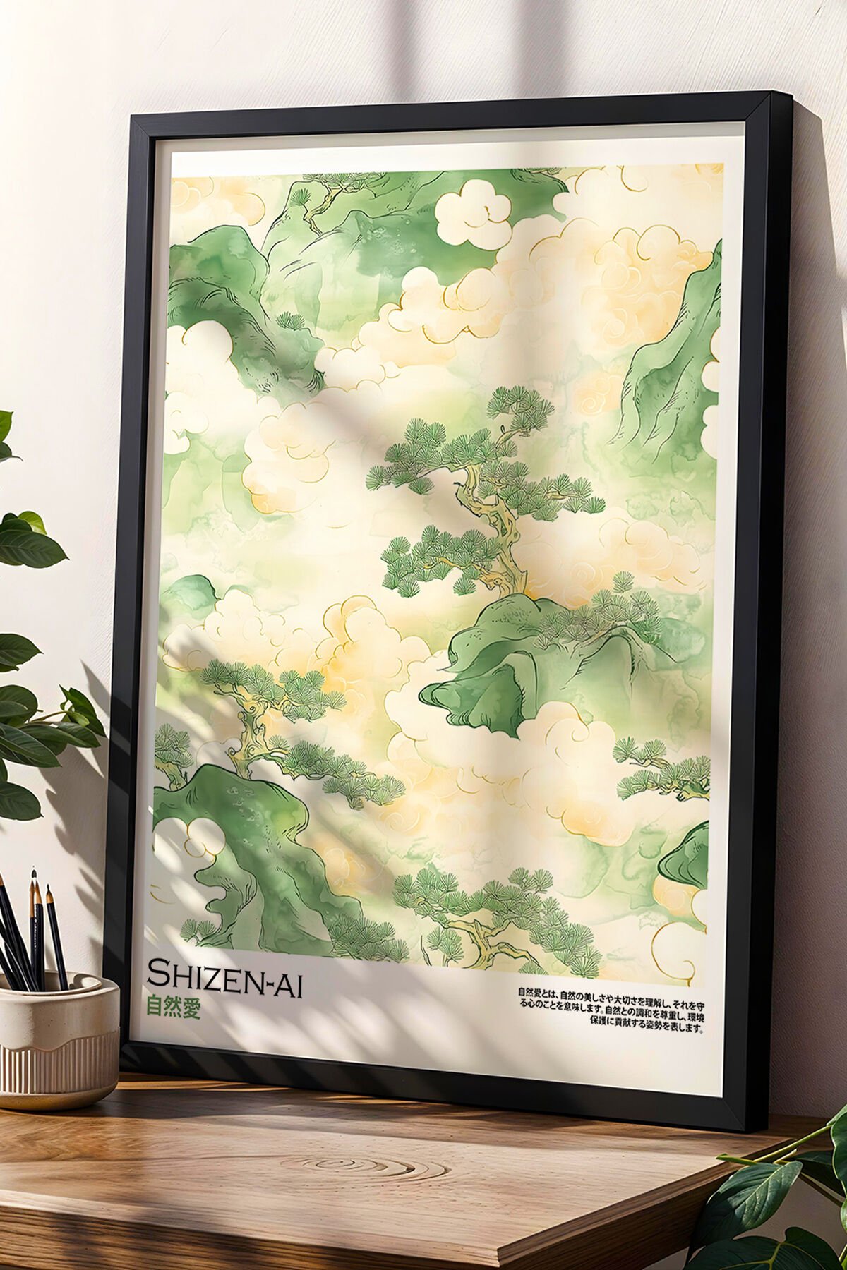 SİYAH - Shizen-Ai Yeşil Tonlarda Japon Sanatından İlham Alan Ahşap Çerçeveli Duvar Tablosu