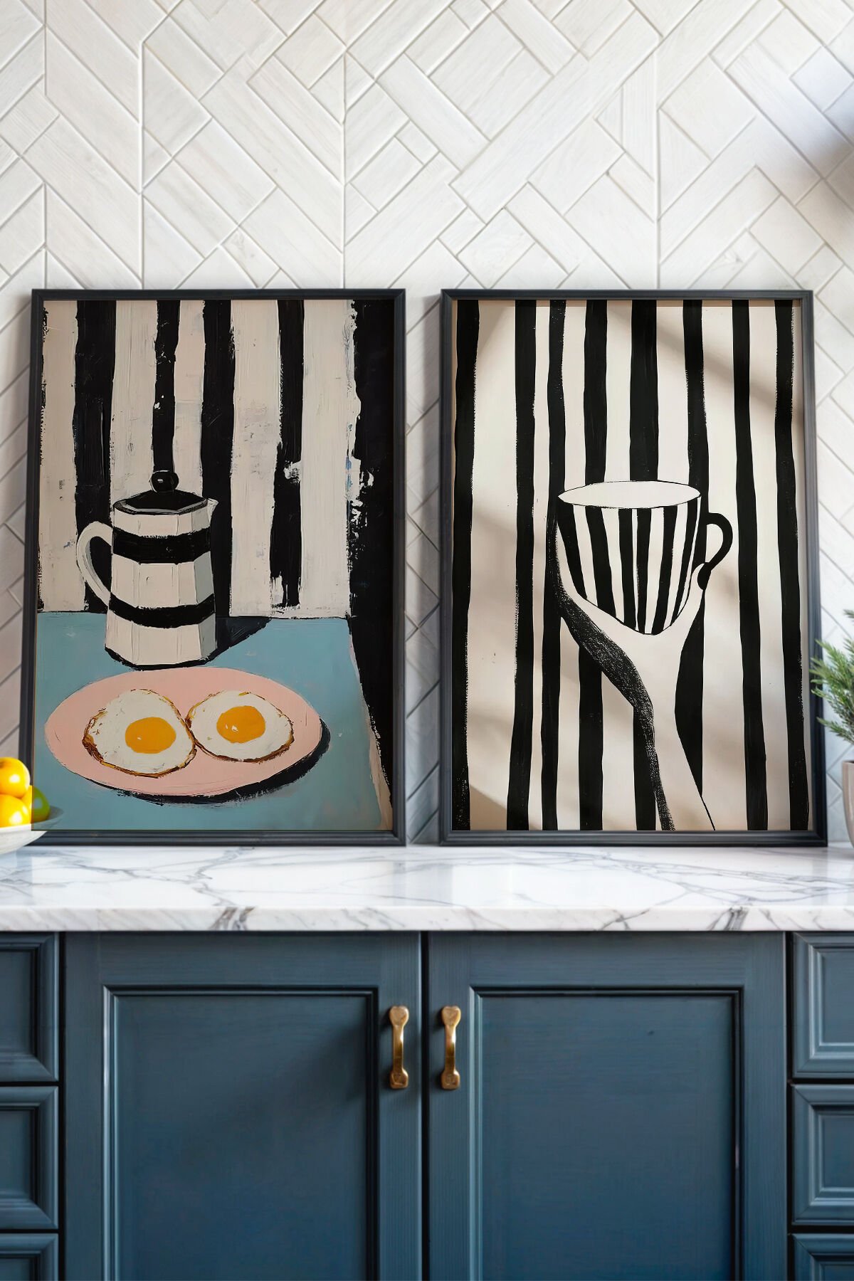 SİYAH - Siyah Beyaz Şeritli Kahvaltı 2'li Doğal Ahşap Çerçeveli Mutfak Duvar Tablosu