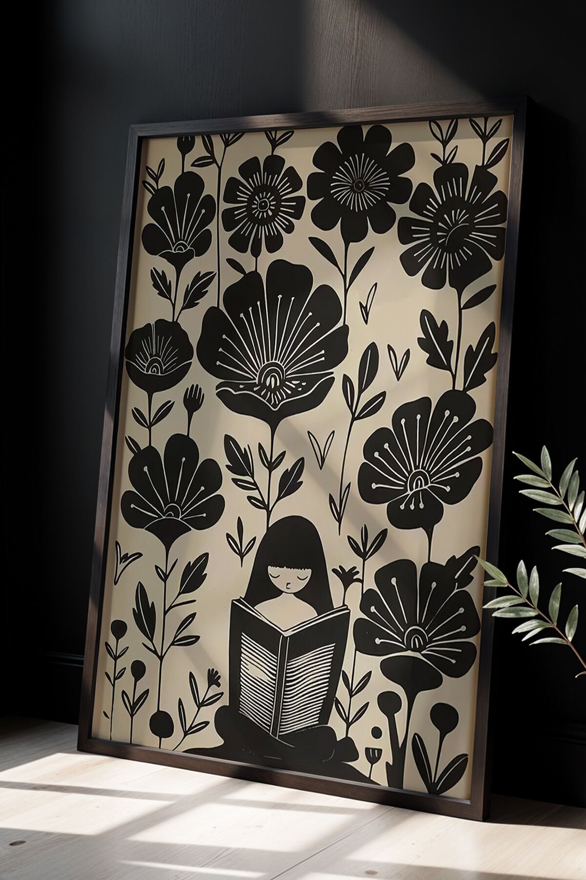 SİYAH - Soyut çiçek sanatı Ahşap Çerçeveli Duvar Tablosu