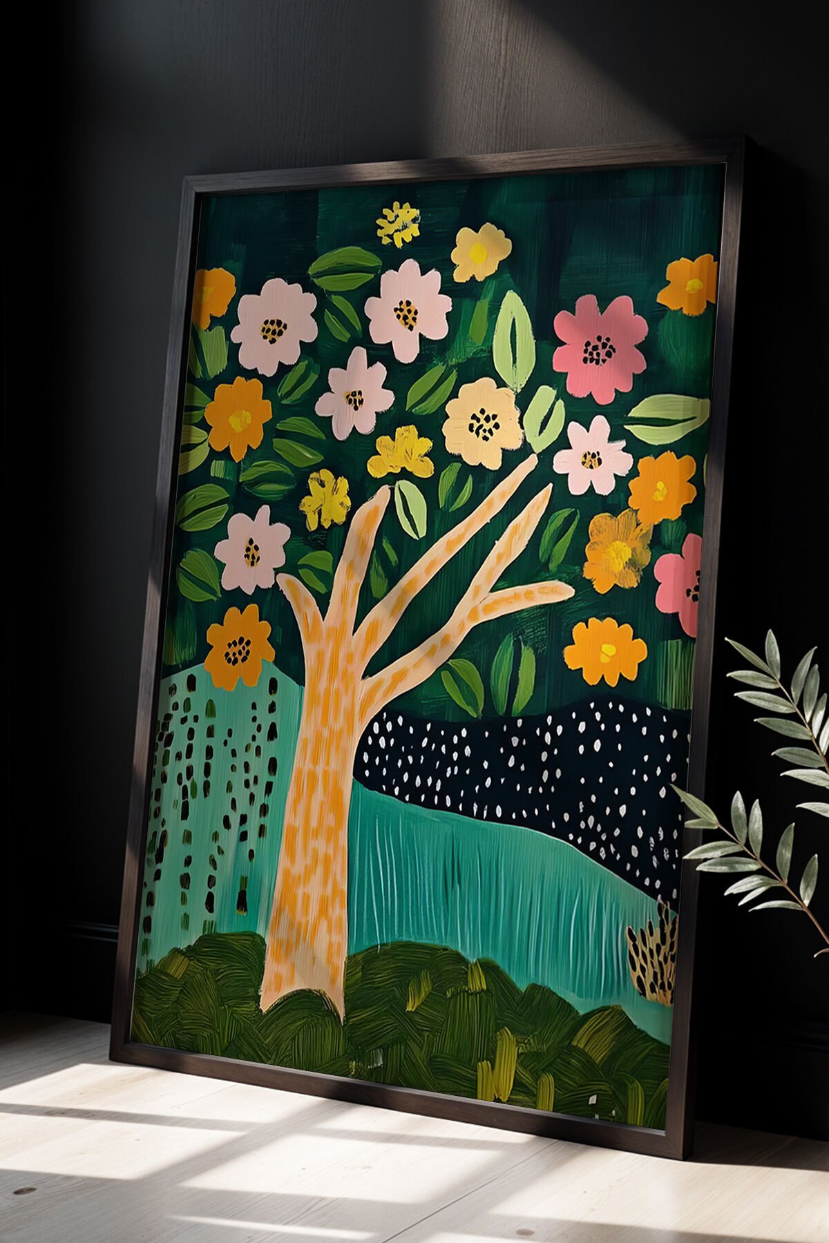 SİYAH - Soyut çiçek sanatı Ahşap Çerçeveli Duvar Tablosu