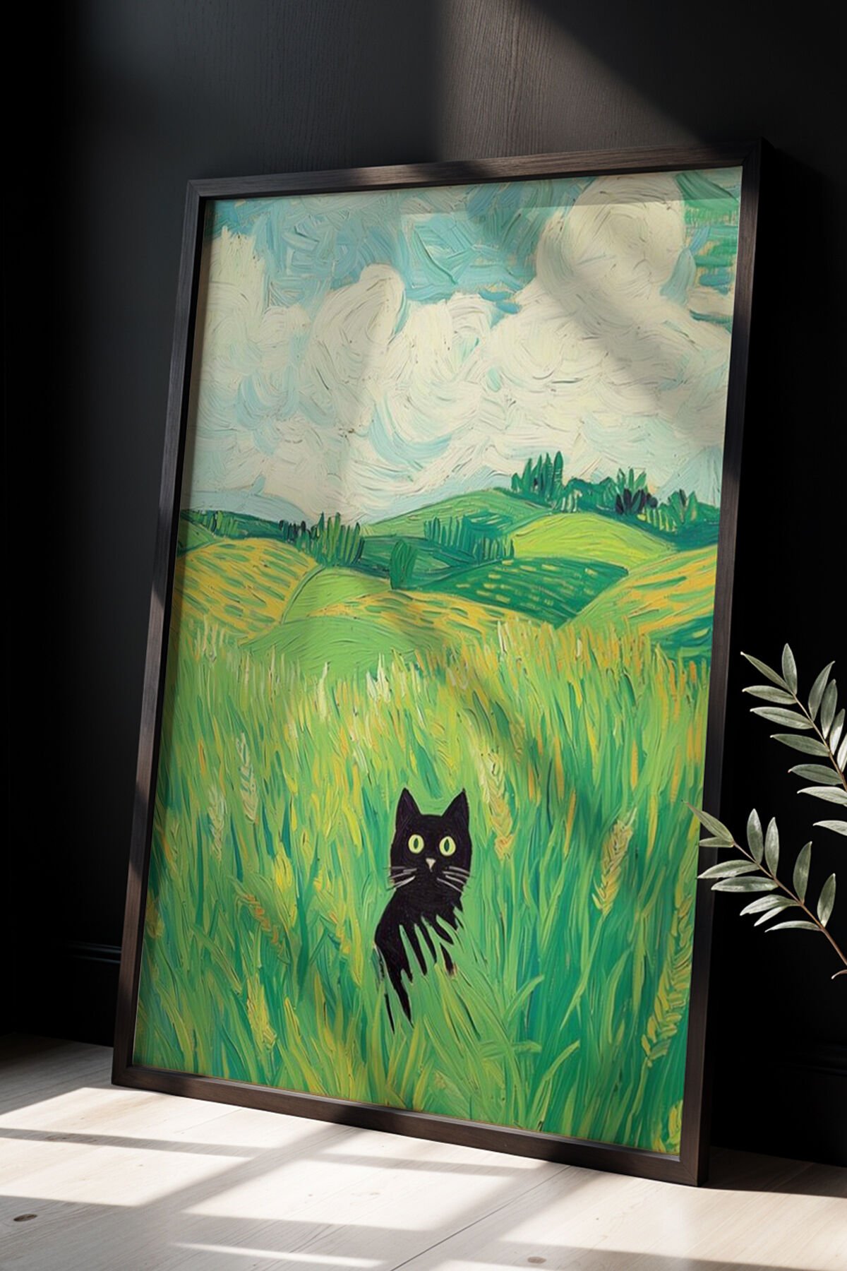 SİYAH - Soyut Kedi Sanatı Ahşap Çerçeveli Duvar Kedi Tablosu
