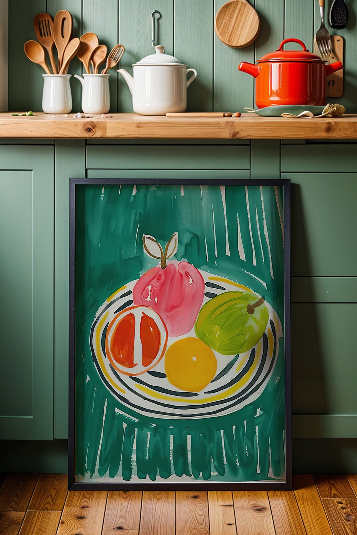 SİYAH - Soyut Meyve Kasesi Sanat Baskısı Ahşap Çerçeveli Mutfak Duvar Tablosu