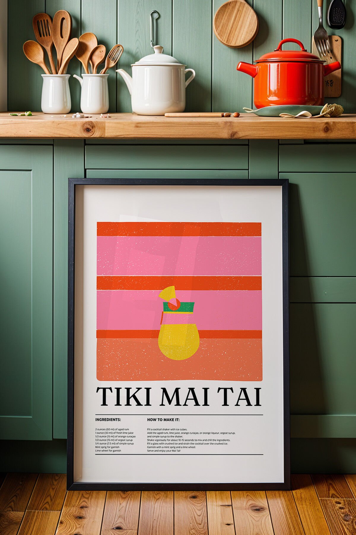 SİYAH - Tiki Mai Tai Egzotik Kokteyl Mutfak Dekoru Ahşap Çerçeveli Duvar Tablosu