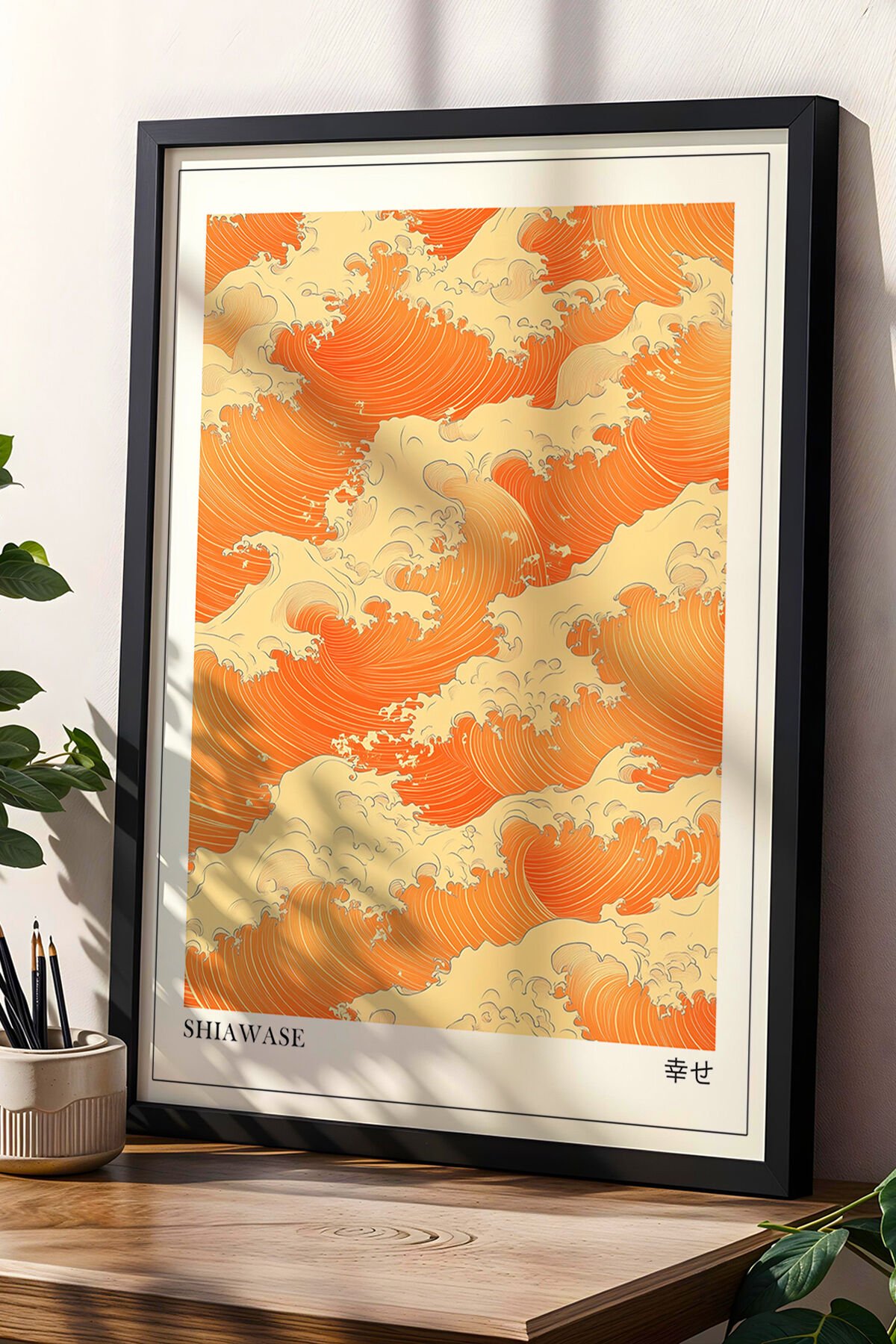SİYAH - Turuncu Tonlarda Soyut Dalga Japandi Ahşap Çerçeveli Duvar Tablosu