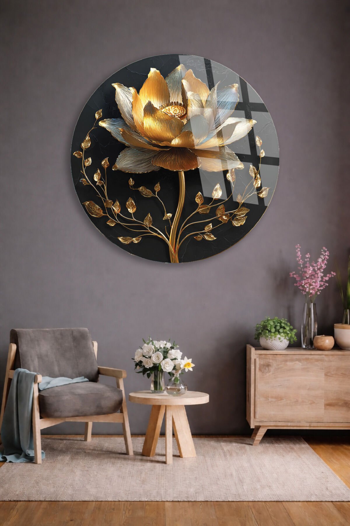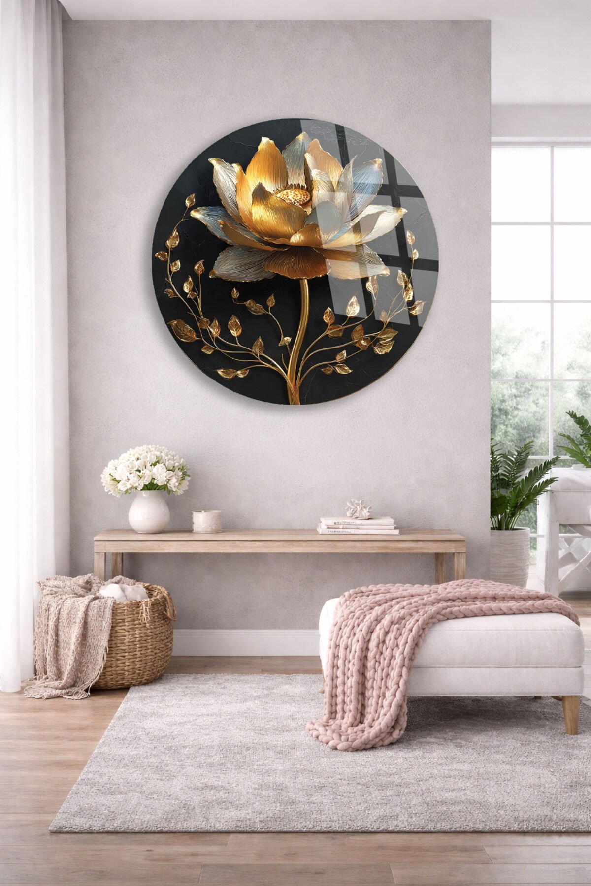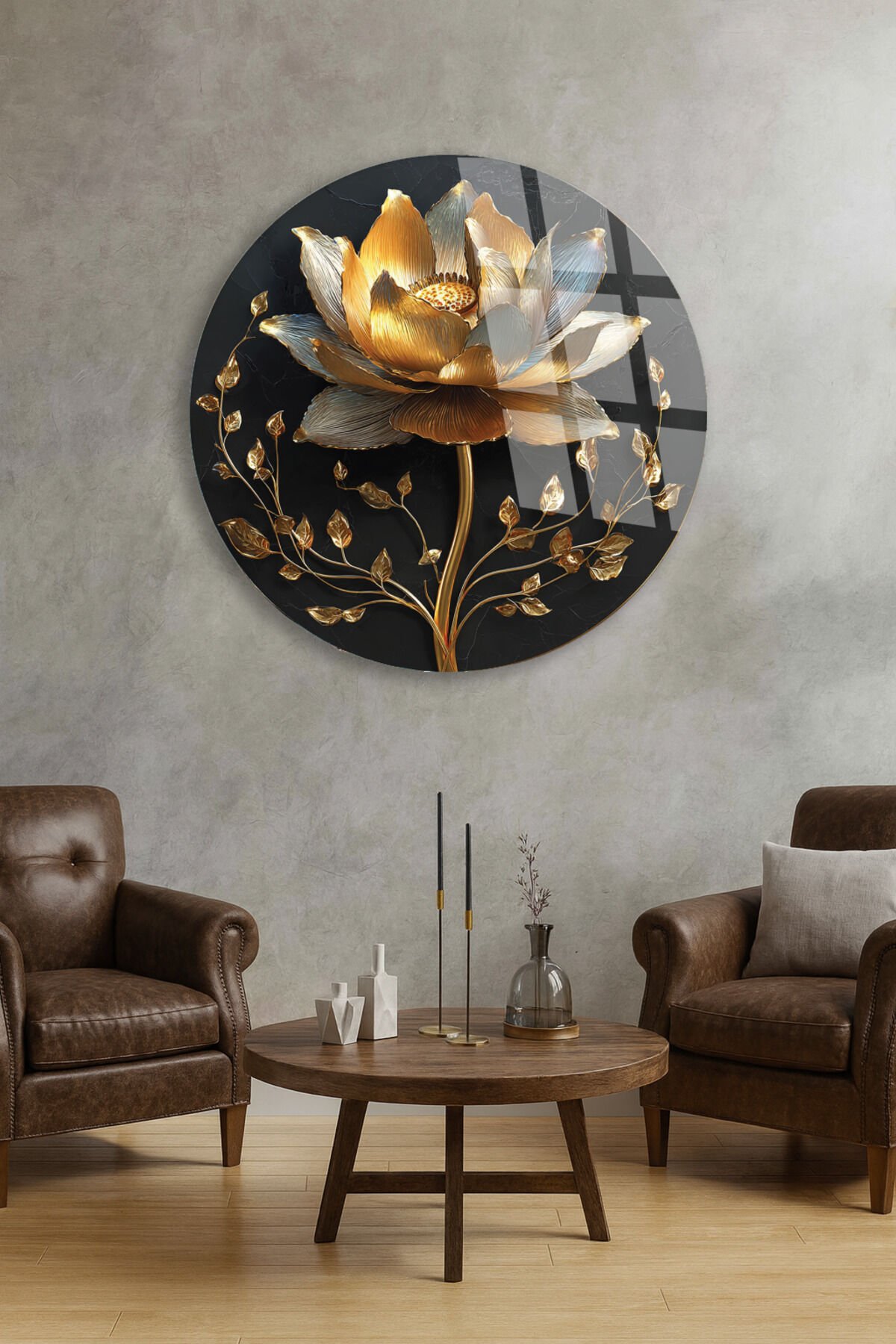 SİYAH VE ALTIN ÇİÇEK DESENİ DEKORATİF KIRILMAZ CAM TABLO Altın