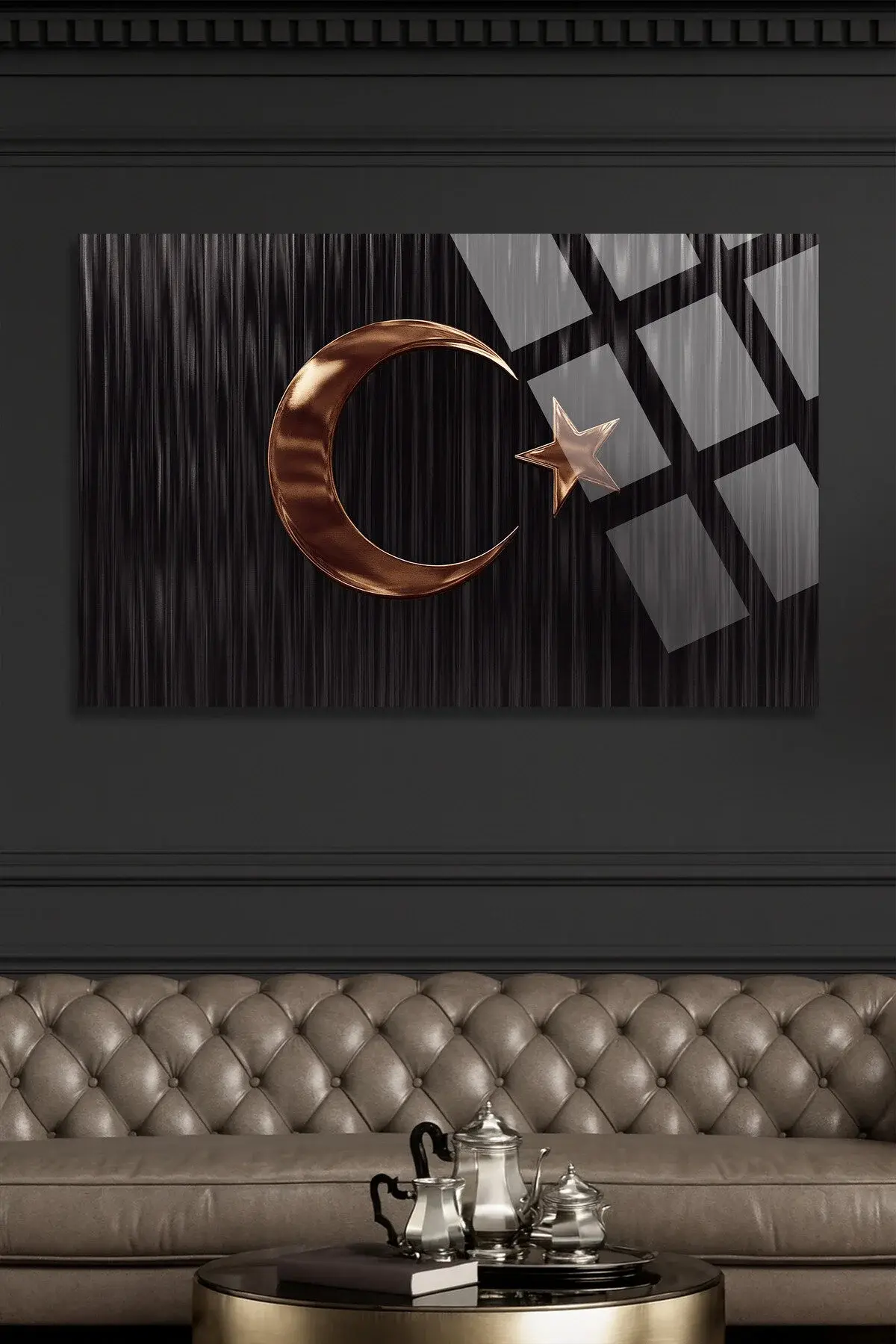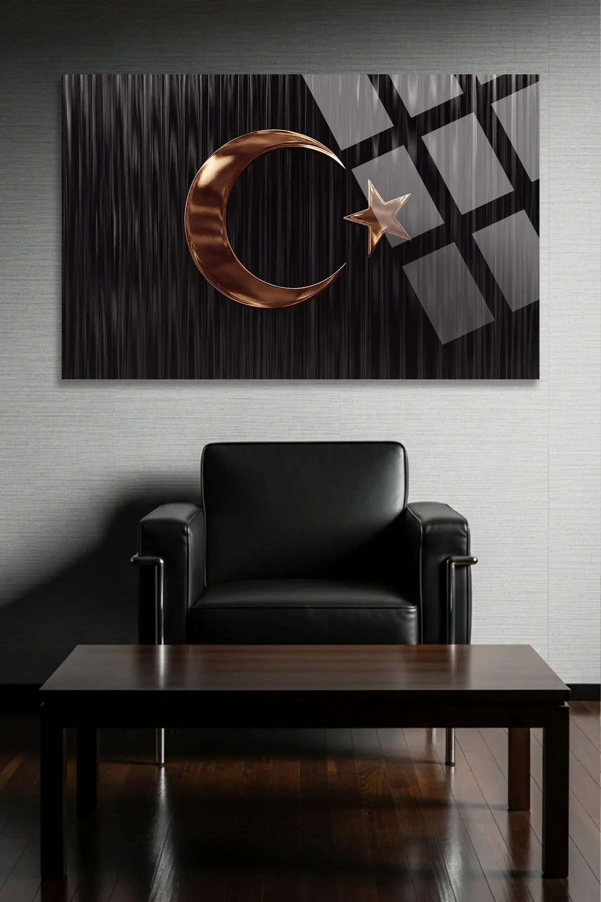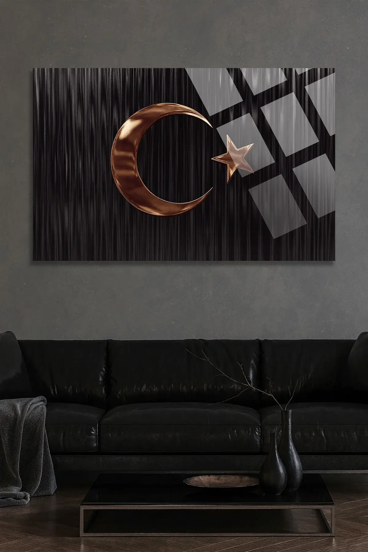 SİYAH VE BRONZ AY YILDIZLI TASARIM TÜRK BAYRAĞI CAM TABLO KIRILMAZ LÜKS MODERN TABLO OFİS HEDİYESİ Siyah