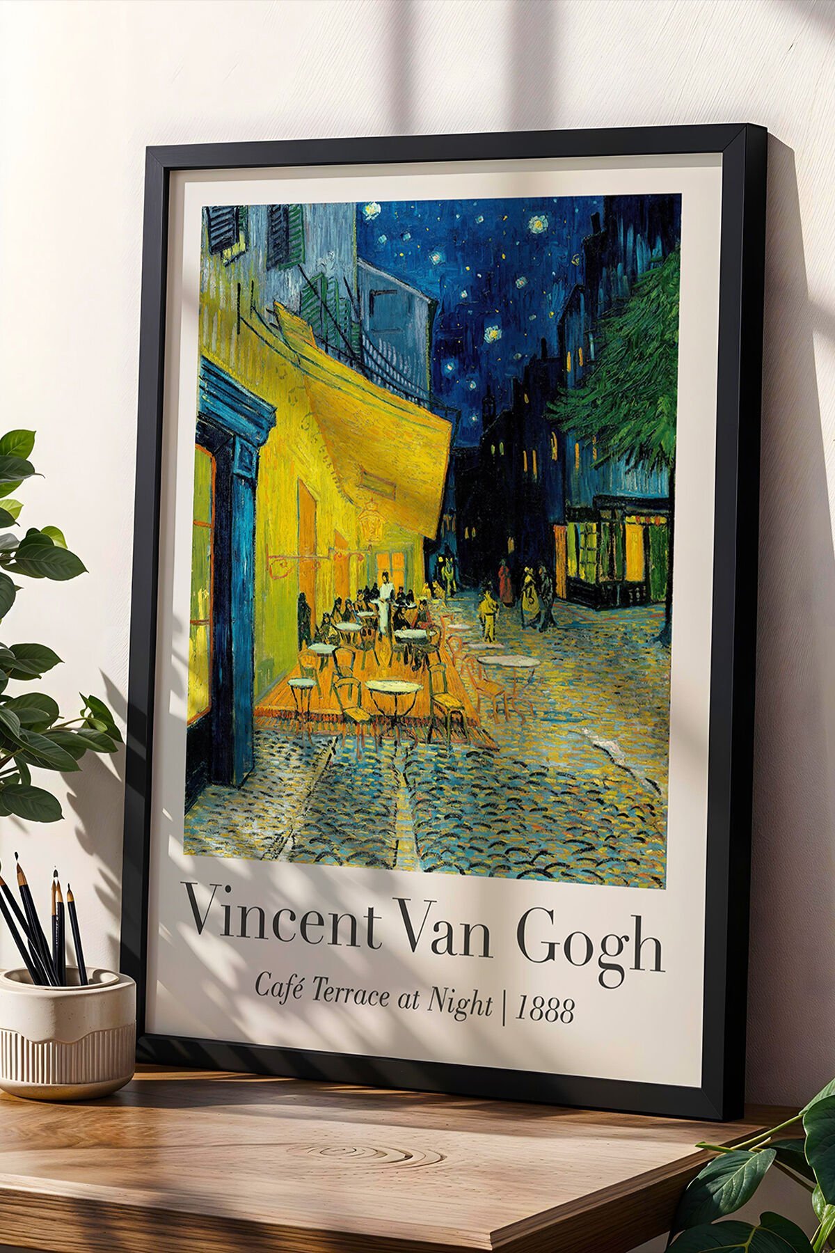 SİYAH - Vincent Van Gogh Geceleyin Kafe Terası 1888 Vintage Doğal Ahşap Çerçeveli Duvar Tablosu