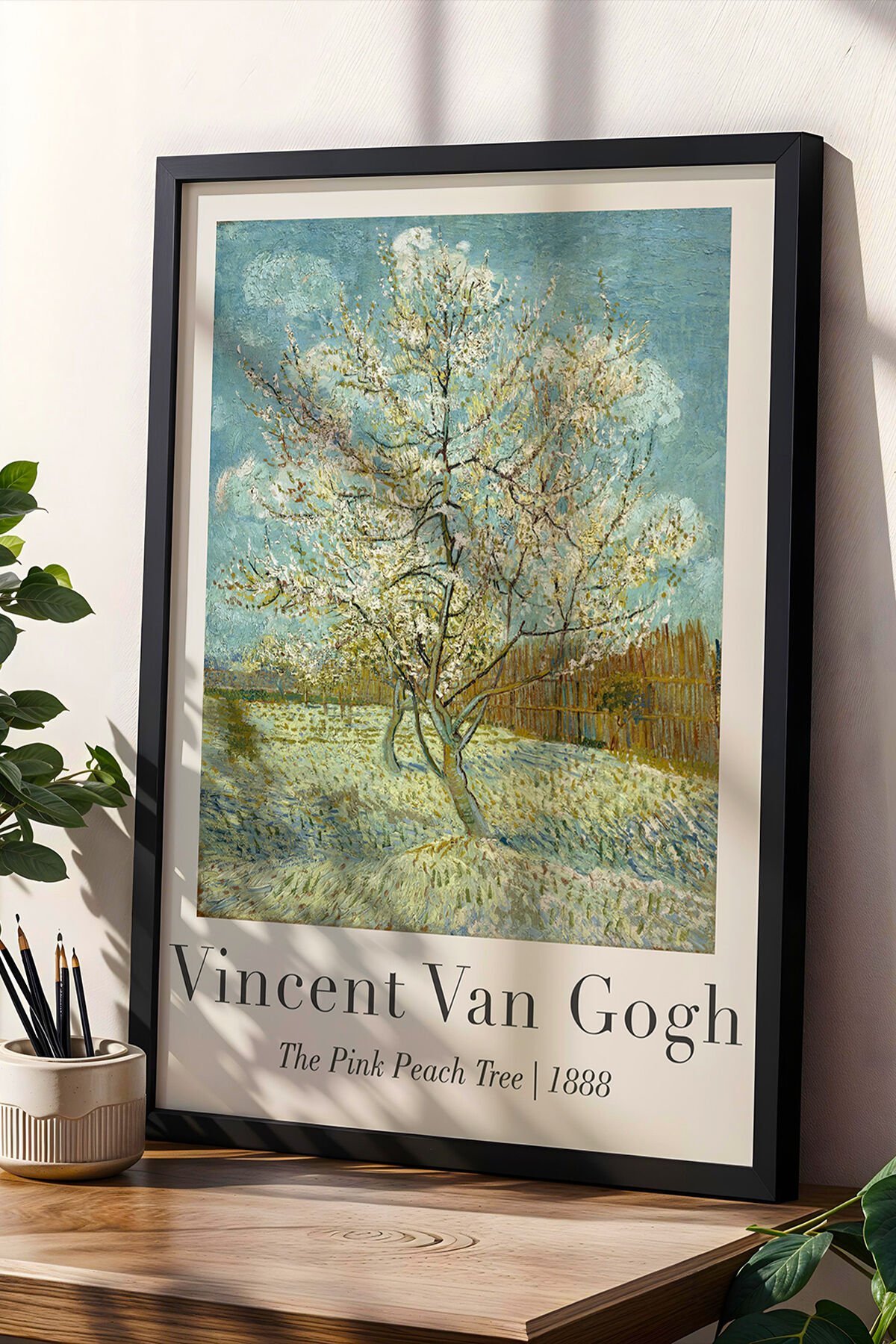 SİYAH - Vincent Van Gogh Pembe Şeftali Ağacı 1888 Vintage Ahşap Çerçeveli Duvar Tablosu