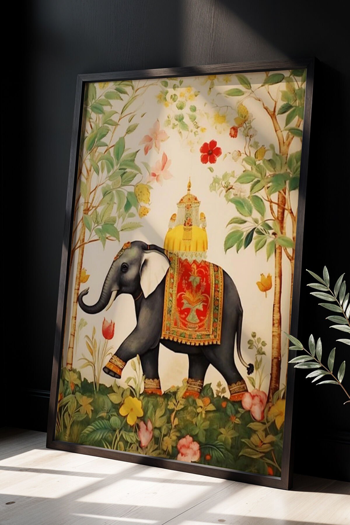 SİYAH - Vintage Fil Hint Stili Doğal Ahşap Çerçeveli Duvar Tablosu