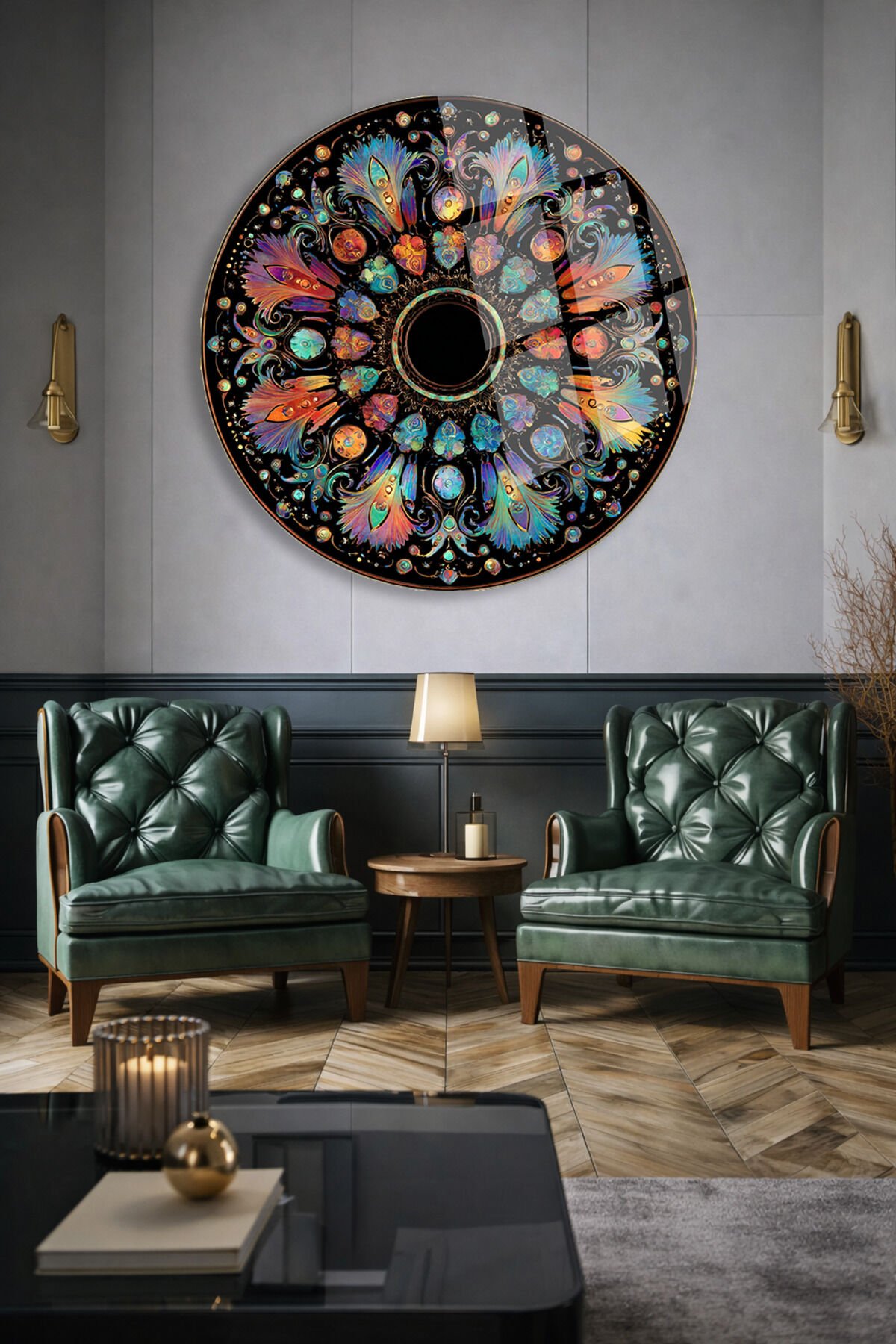 SİYAH ZEMİN MANDALA YUVARLAK KIRILMAZ CAM TABLO ULTRA CANLI RENKLER EV OFİS HEDİYESİ Çok Renkli