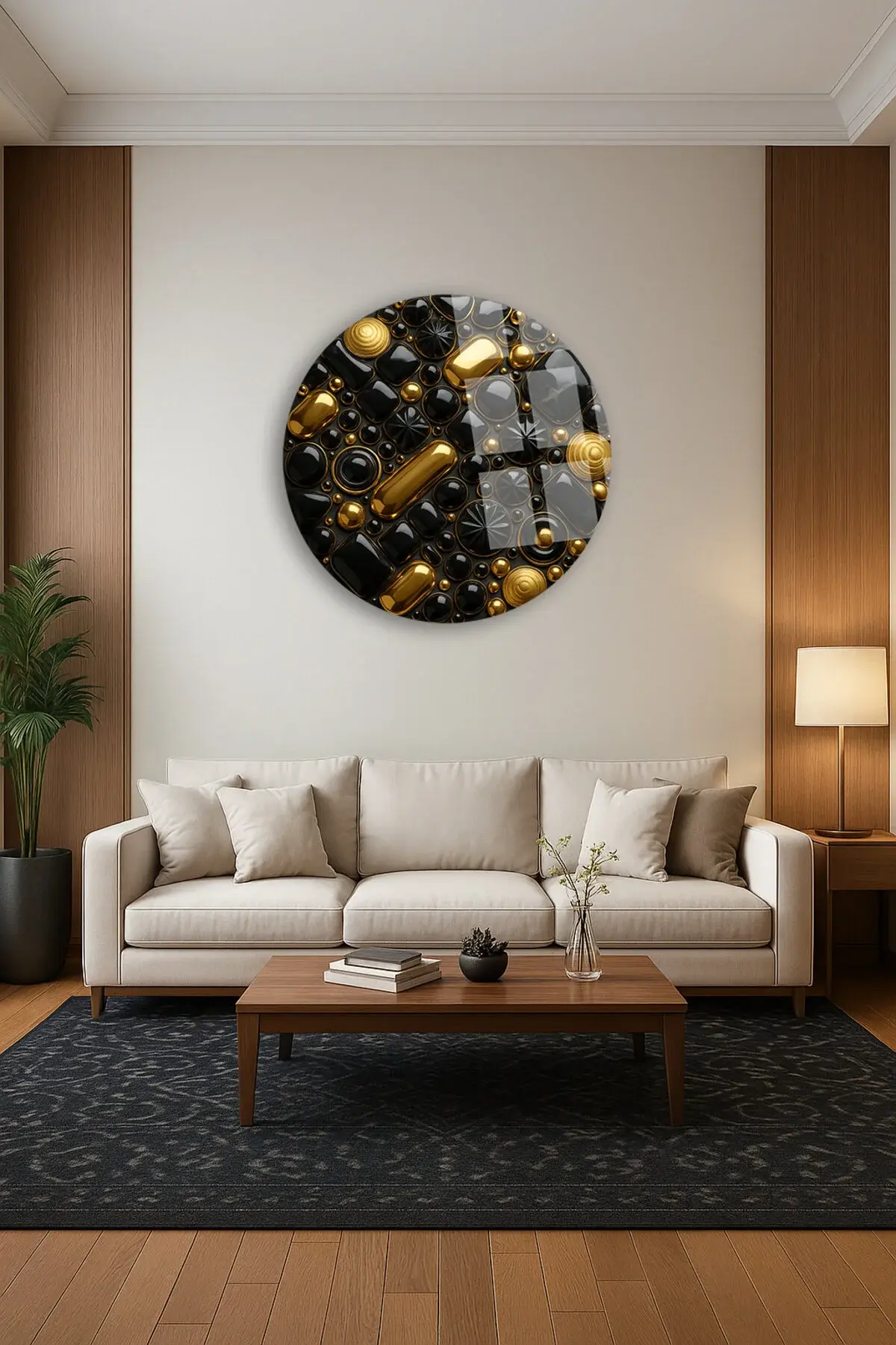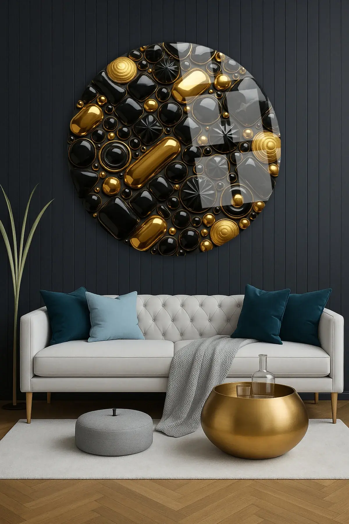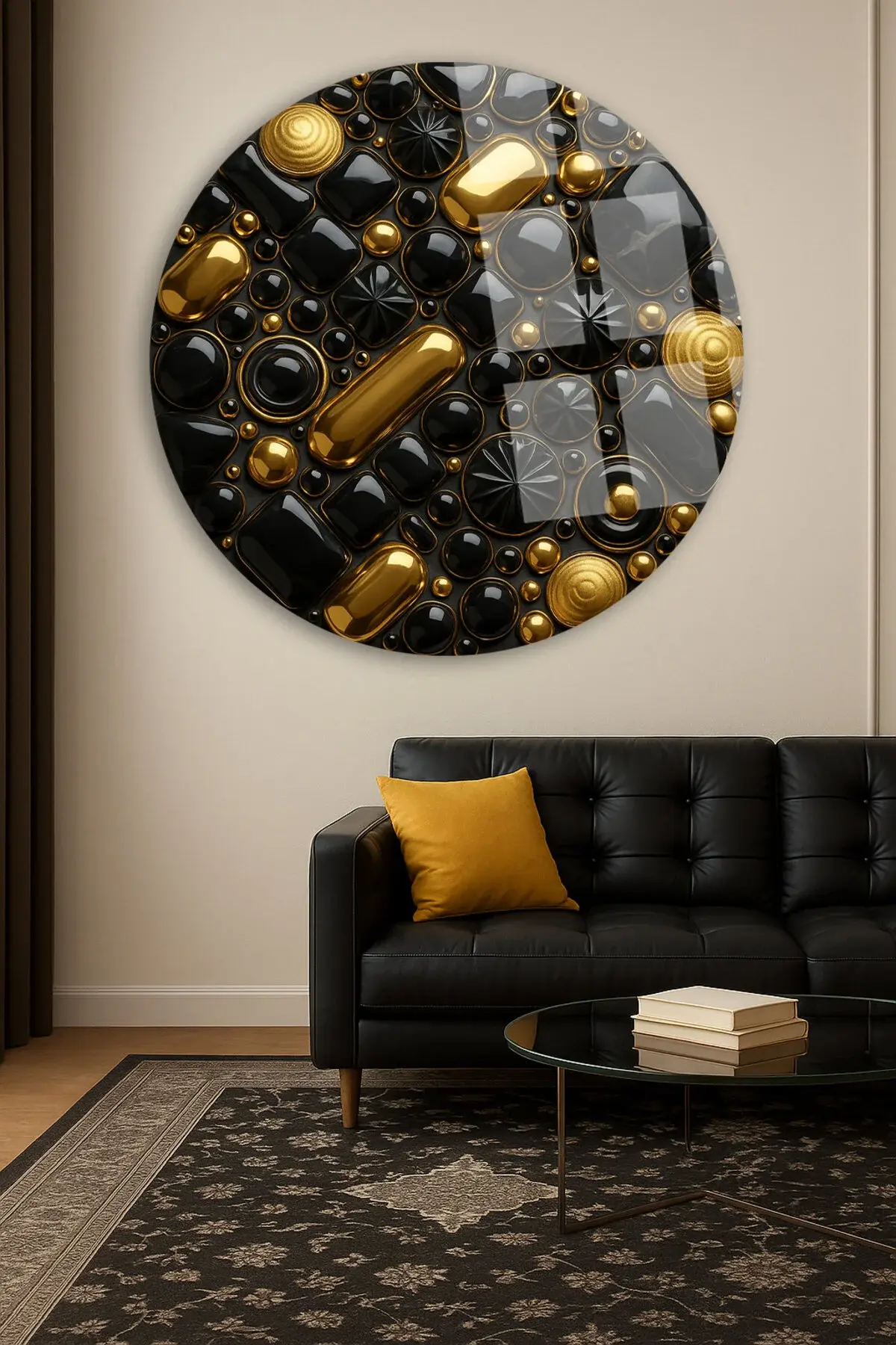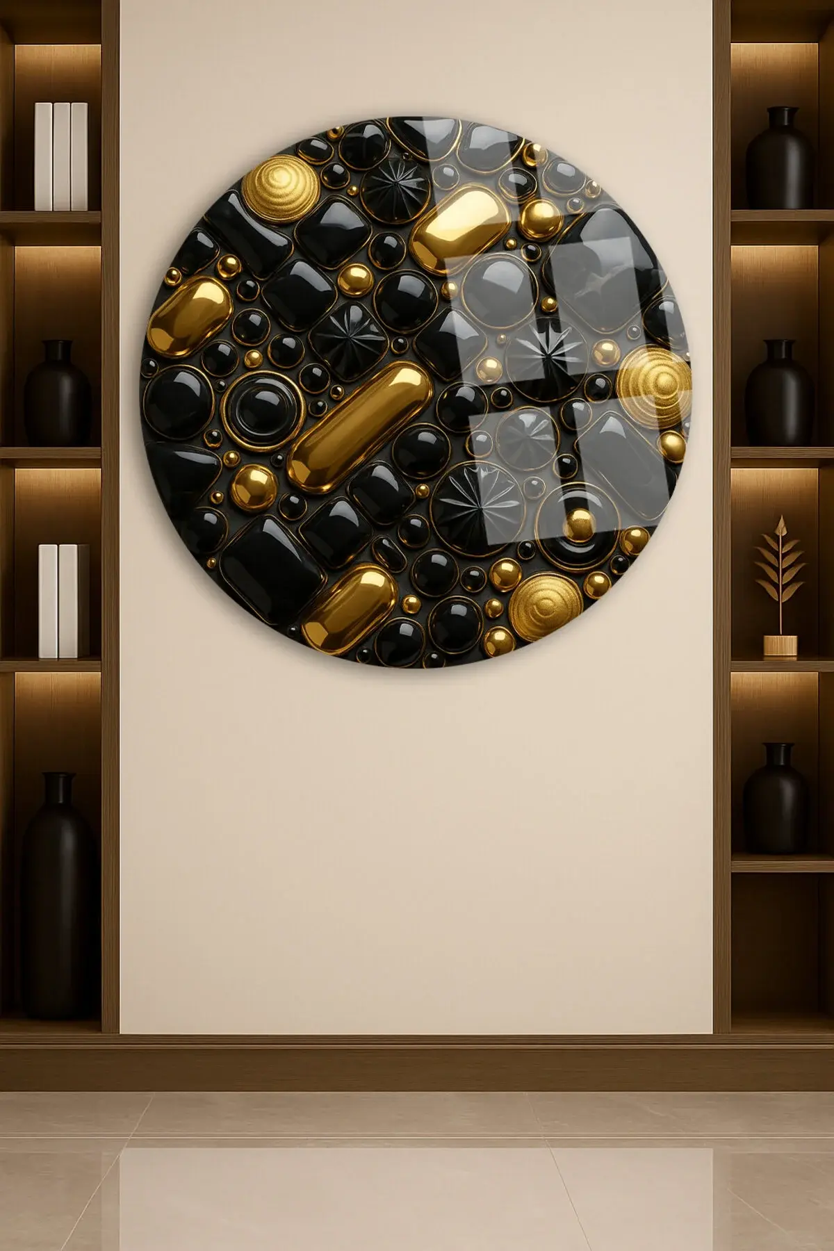 SİYAH ZÜMRÜT VE ALTIN TASARIMI MODERN TABLO KIRILMAZ LÜKS CAM TABLO YUVARLAK CAM TABLO EV HEDİYESİ Siyah