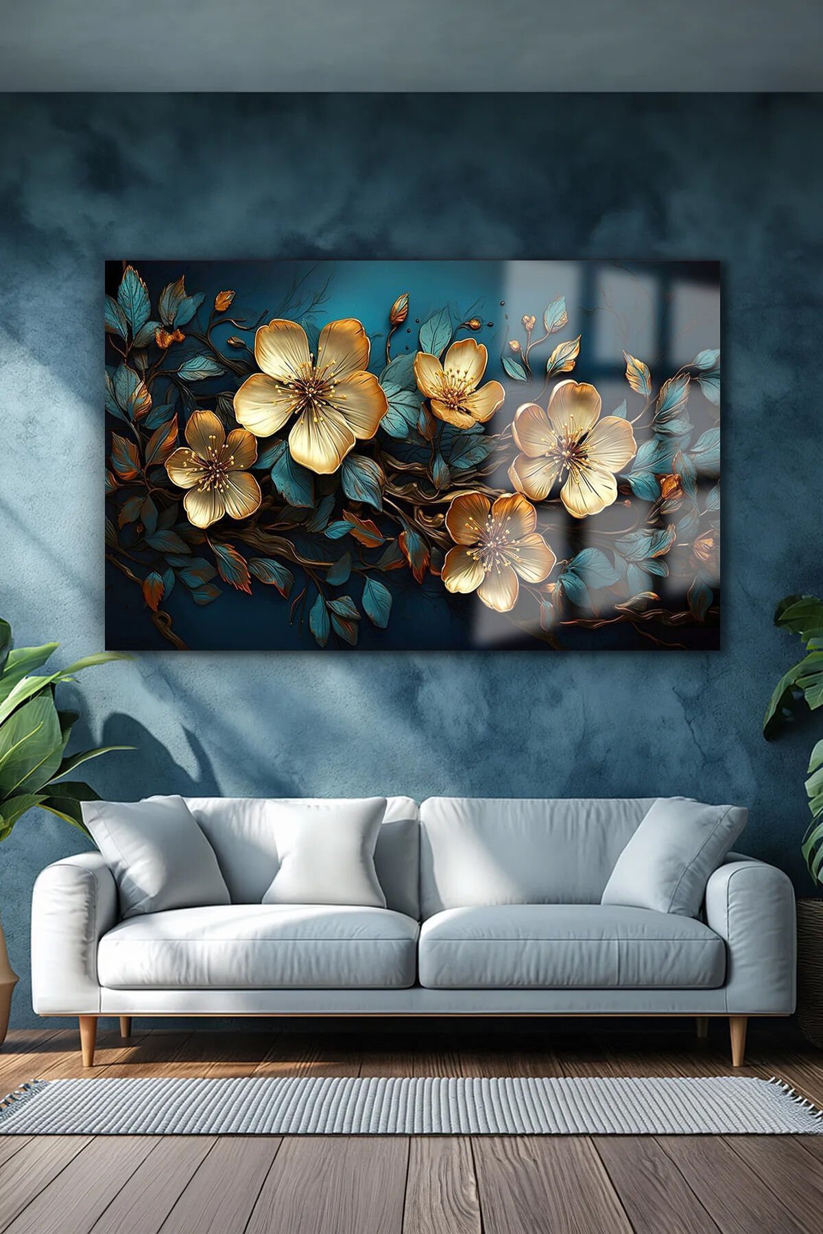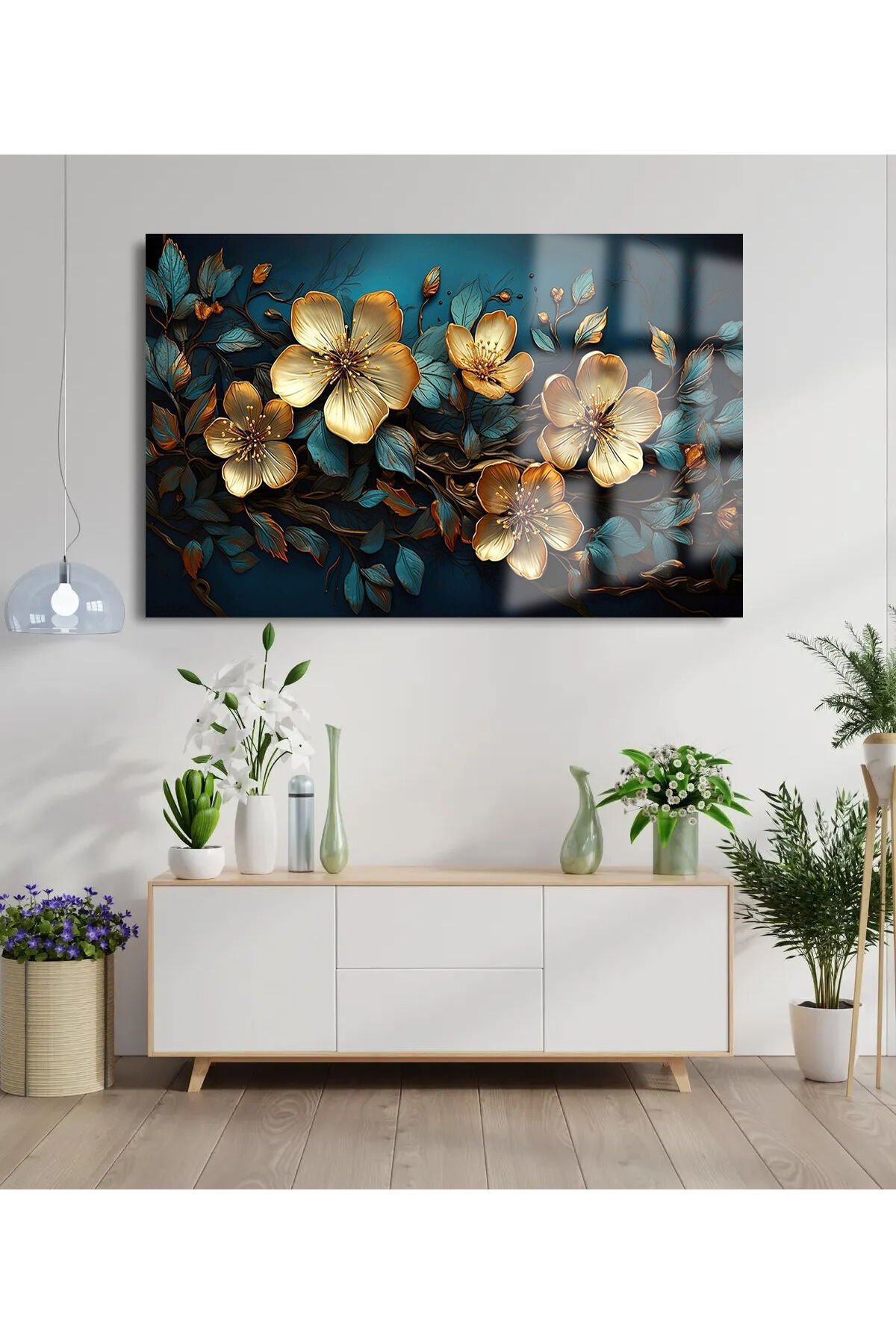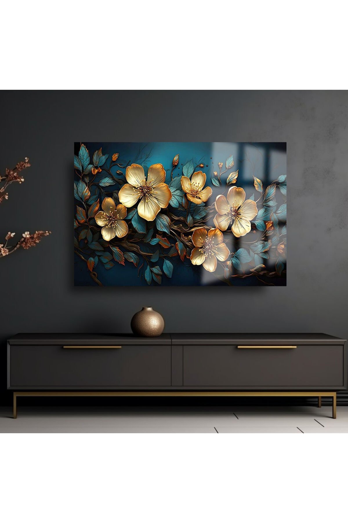 SOLMUŞ HARİKA GOLD ÇİÇEKLER YATAY CAM TABLO KIRILMAZ LÜKS CAM TABLO EV HEDİYESİ