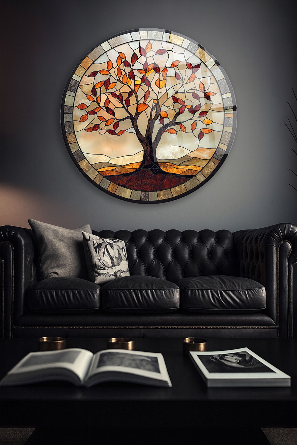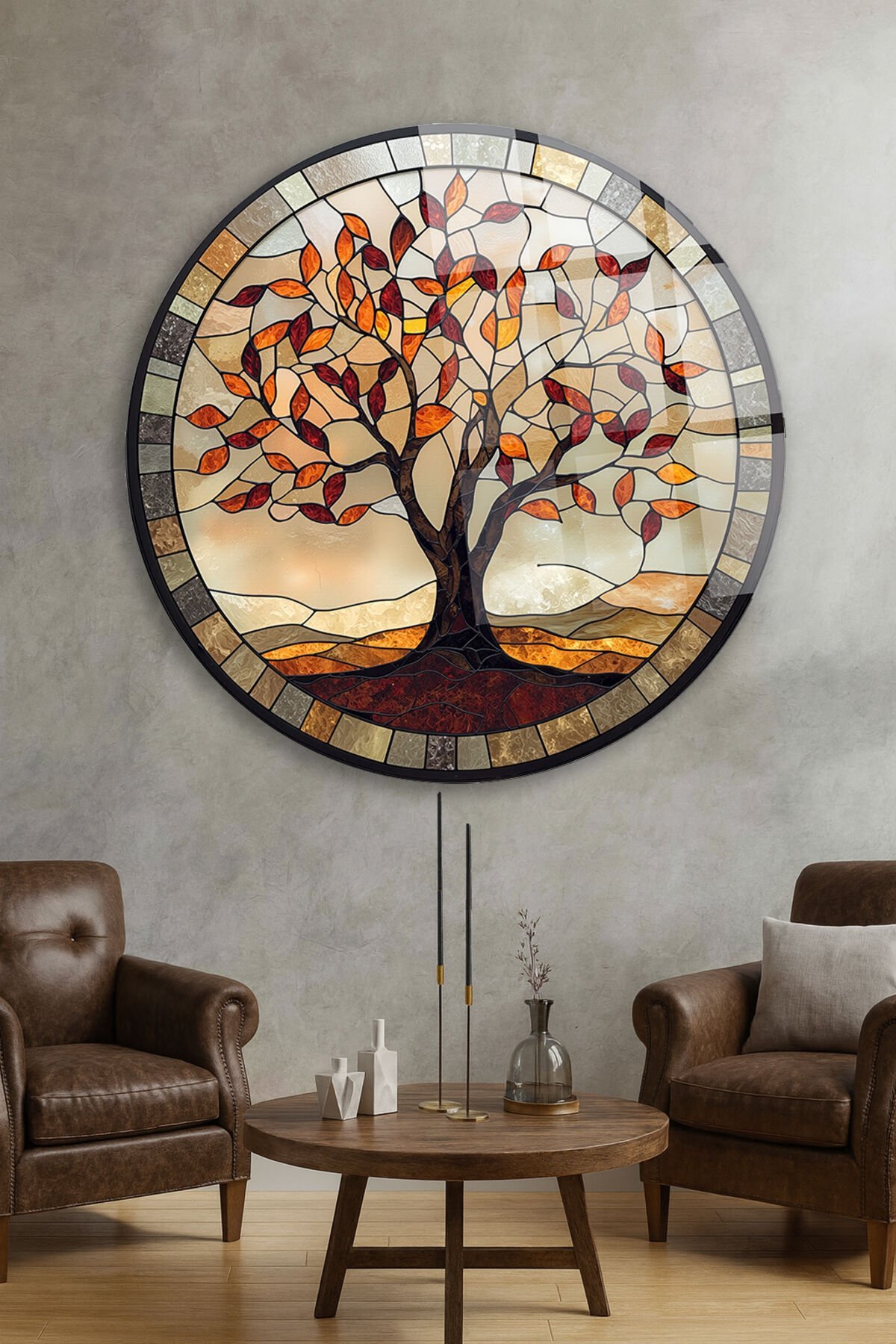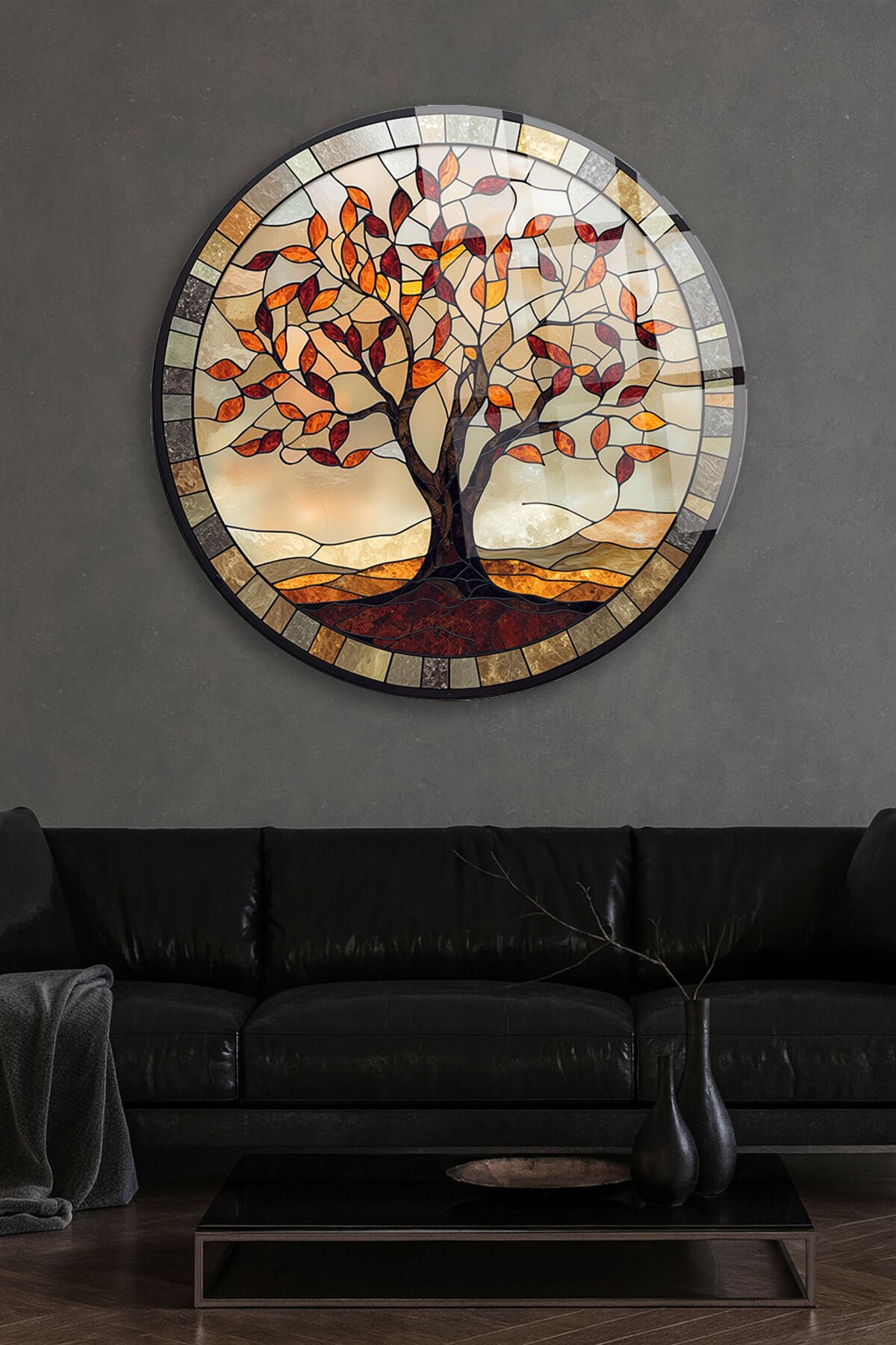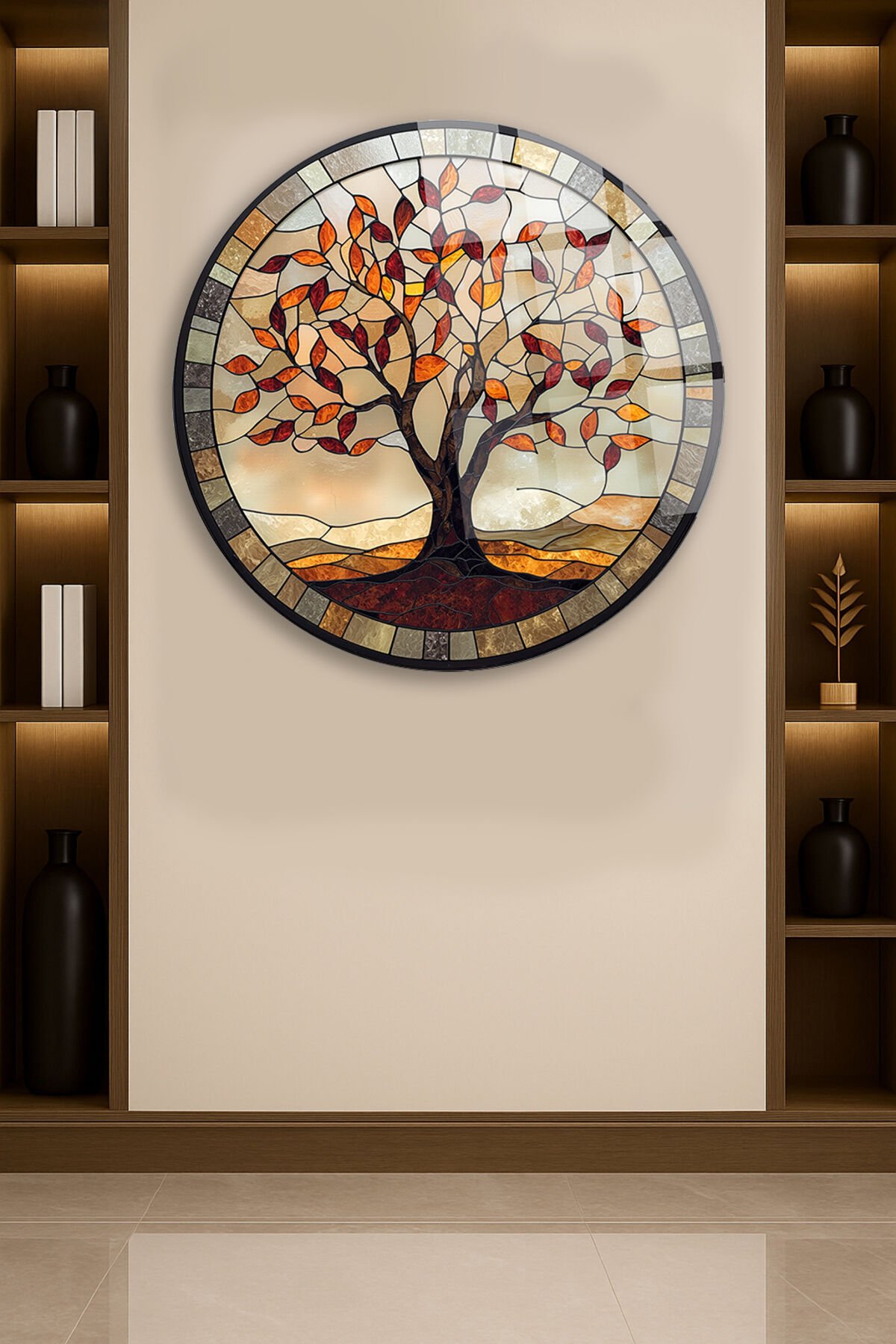 SONBAHAR RENKLİ HAYAT AĞACI DAİRE VİTRAY DESEN MODERN DUVAR SANATI KIRILMAZ LÜKS CAM TABLO Turuncu