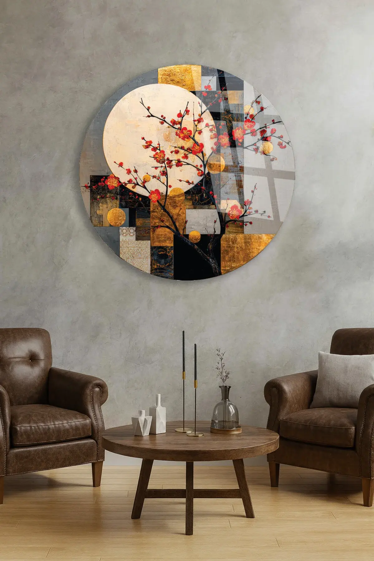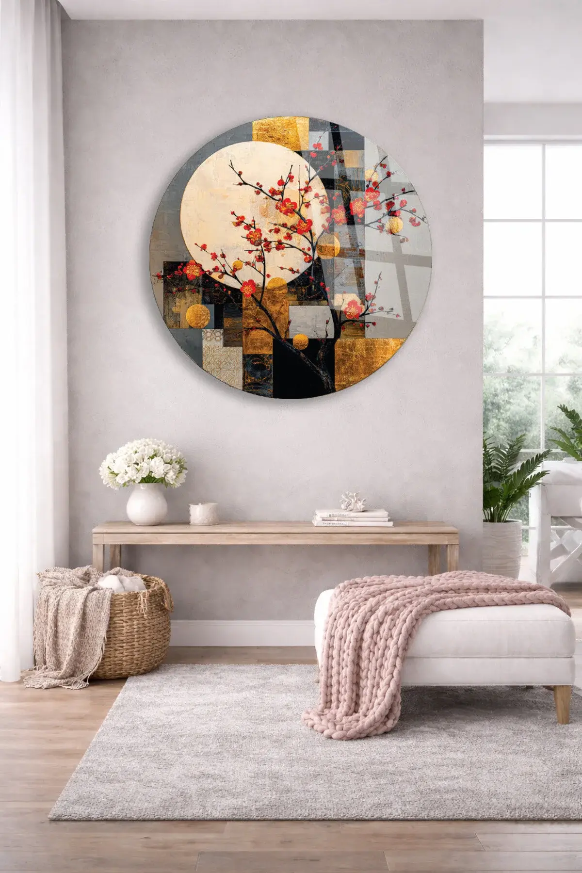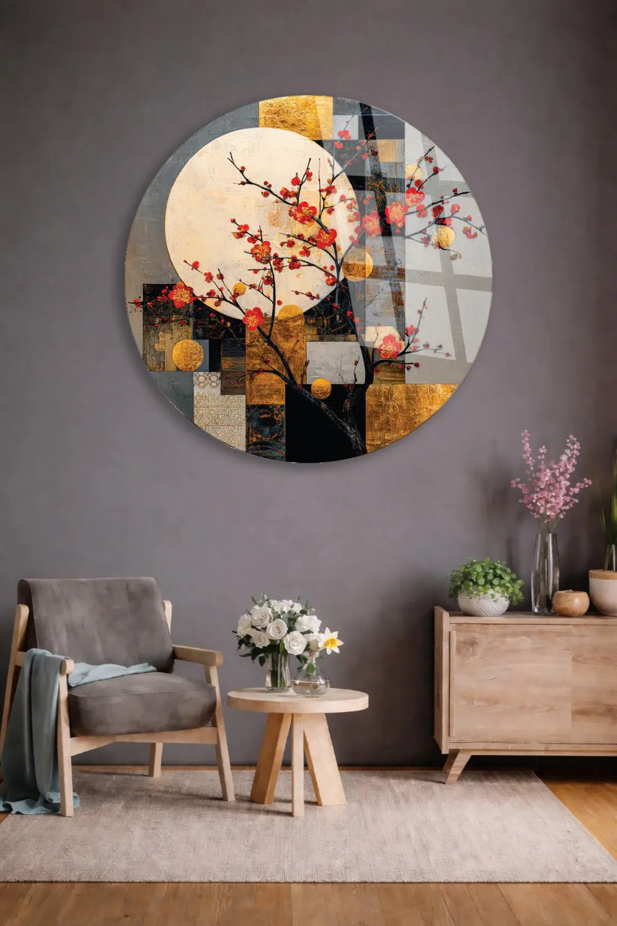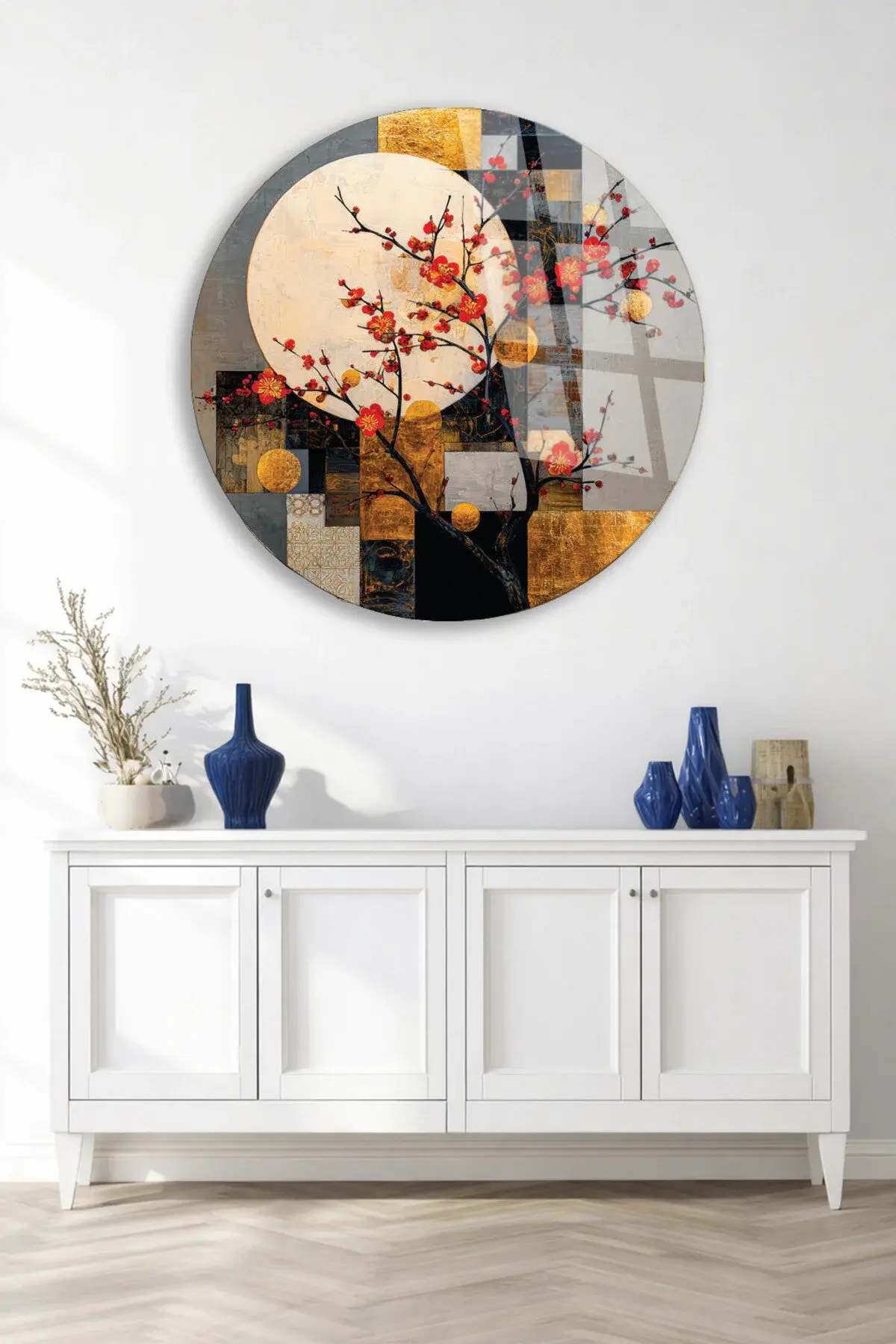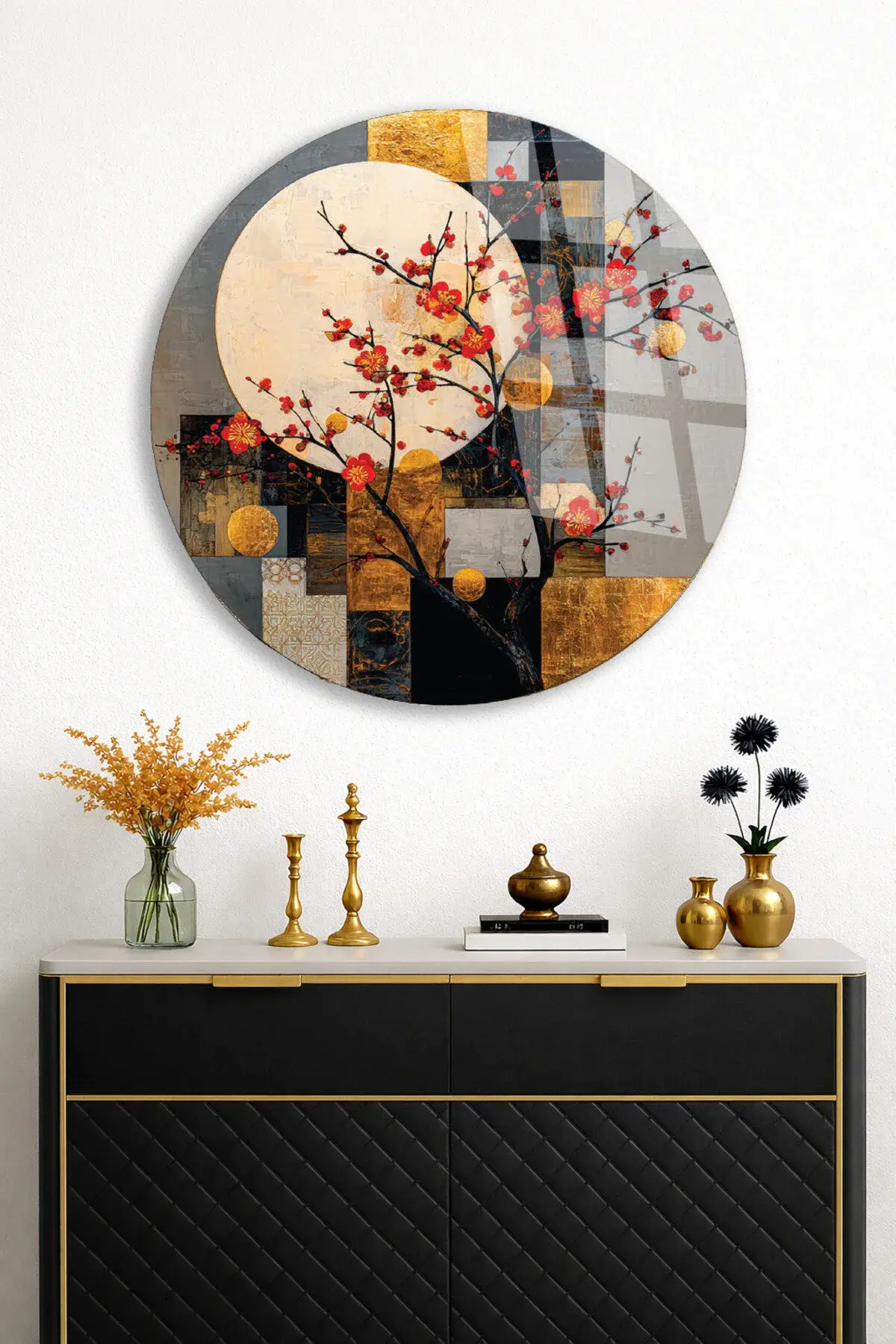 SOYUT AY VE KIRMIZI ÇİÇEKLER SANATSAL DUVAR DEKORU KIRILMAZ CAM TABLO Çok Renkli