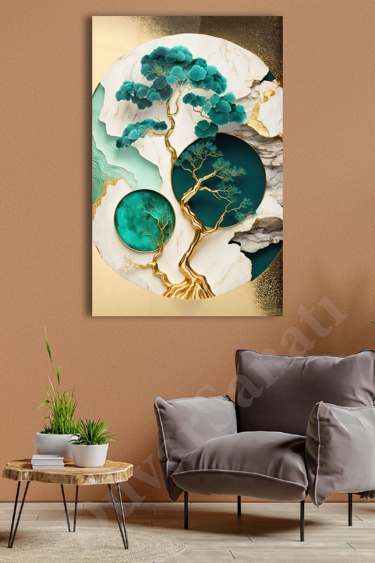 Soyut Bonsai Ağaç Cam Tablo Yeşil Gold Ev Ofis Salon Hediyelik Büyük Tablo Yeşil Gold