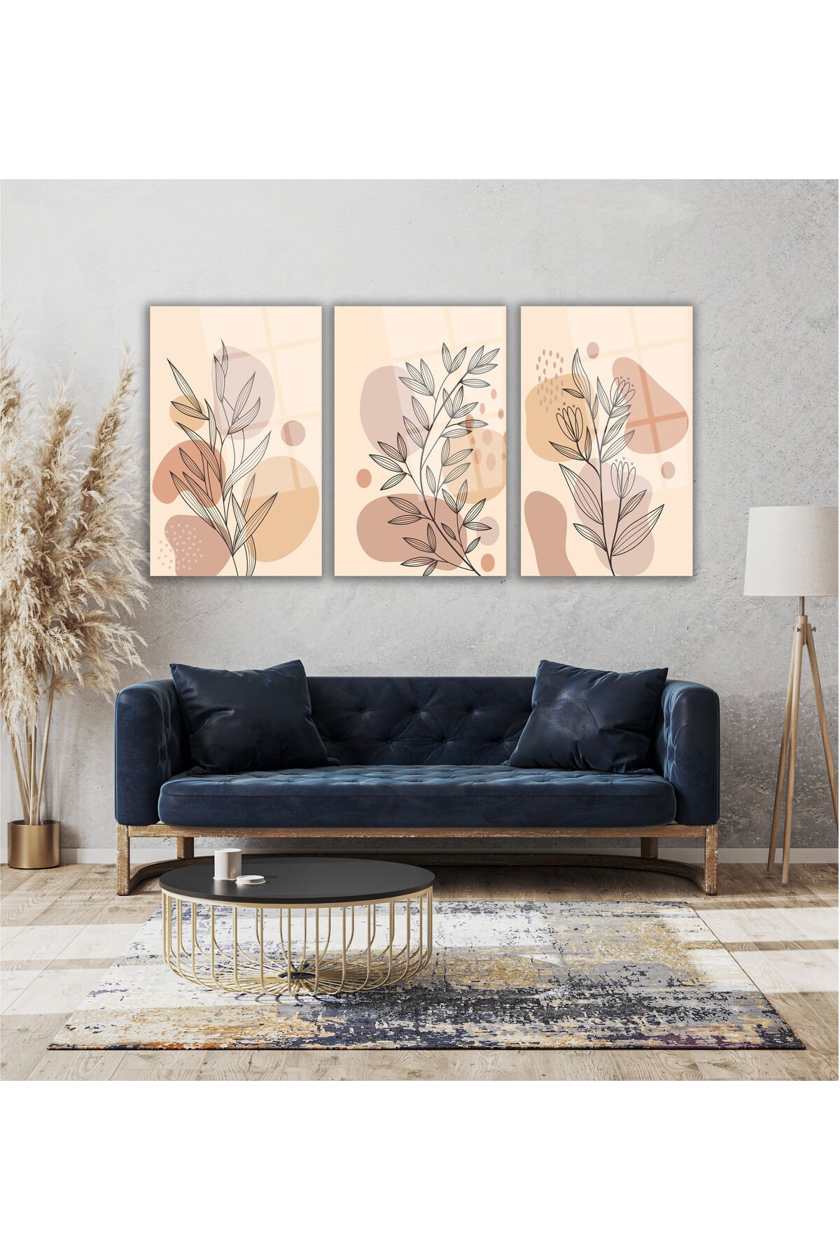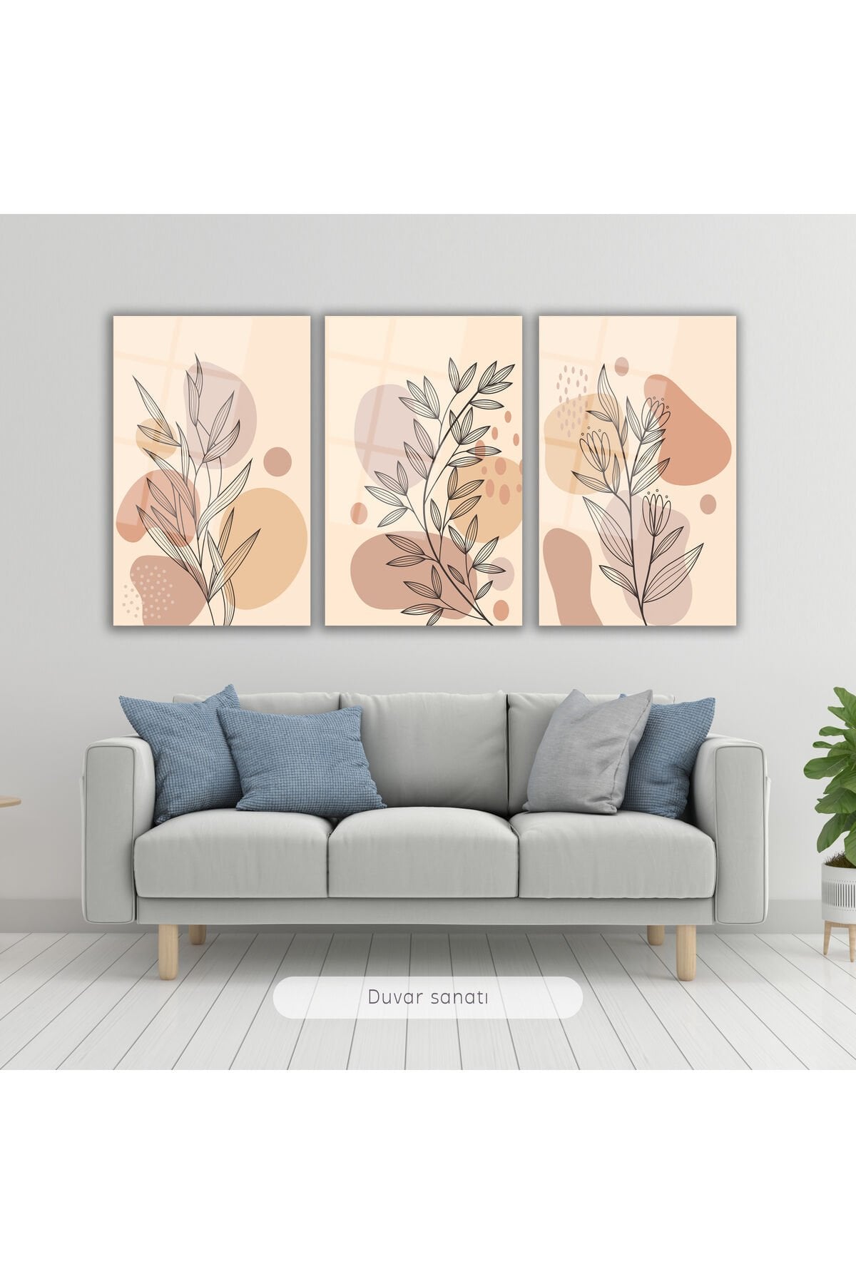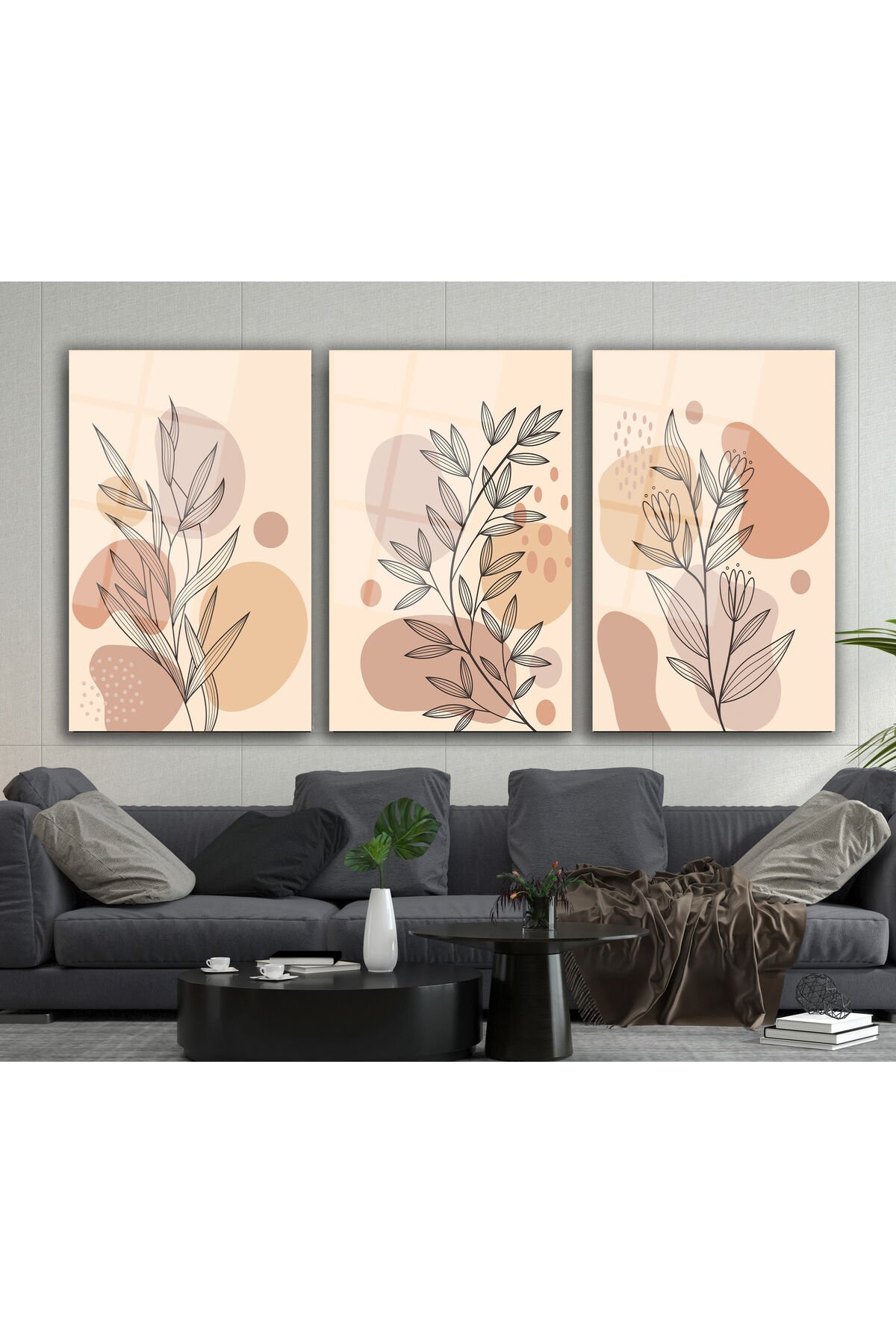 Soyut Çiçekler Üçlü Set Cam Tablo, Modern Ev Ofis Salon Duvar Dekoru Hediyelik Büyük Tablo Dekor Krem