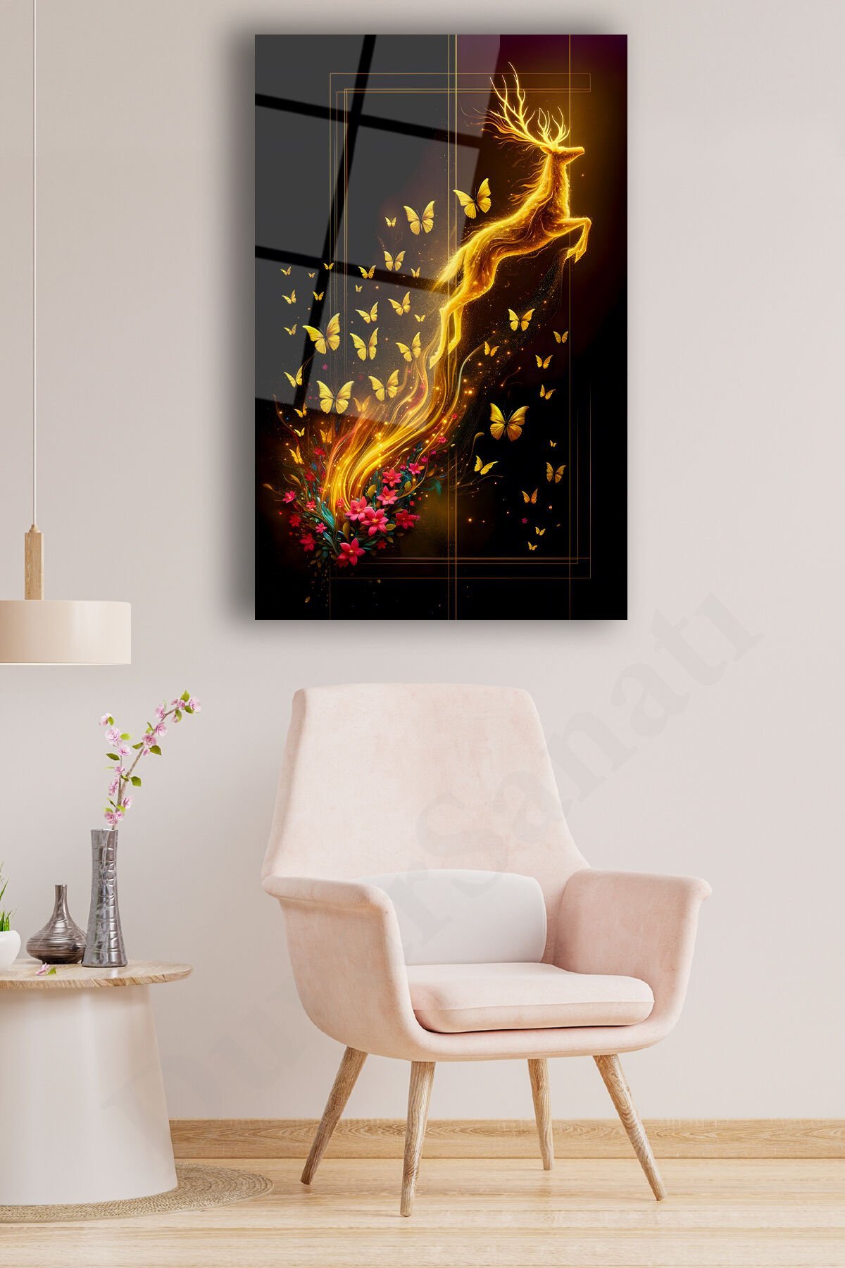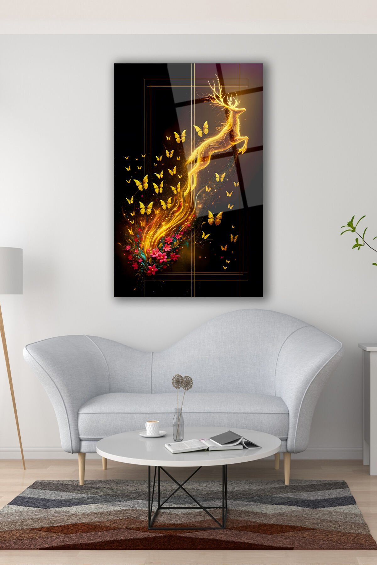 Soyut Geyik ve Kelebekler Dikey Cam Tablo, Modern Ev Ofis Salon Duvar Dekoru, Hediyelik Büyük Tablo Kahverengi