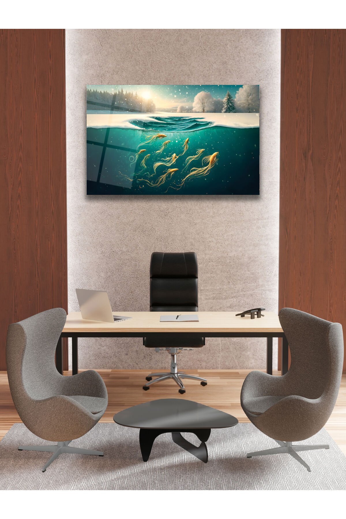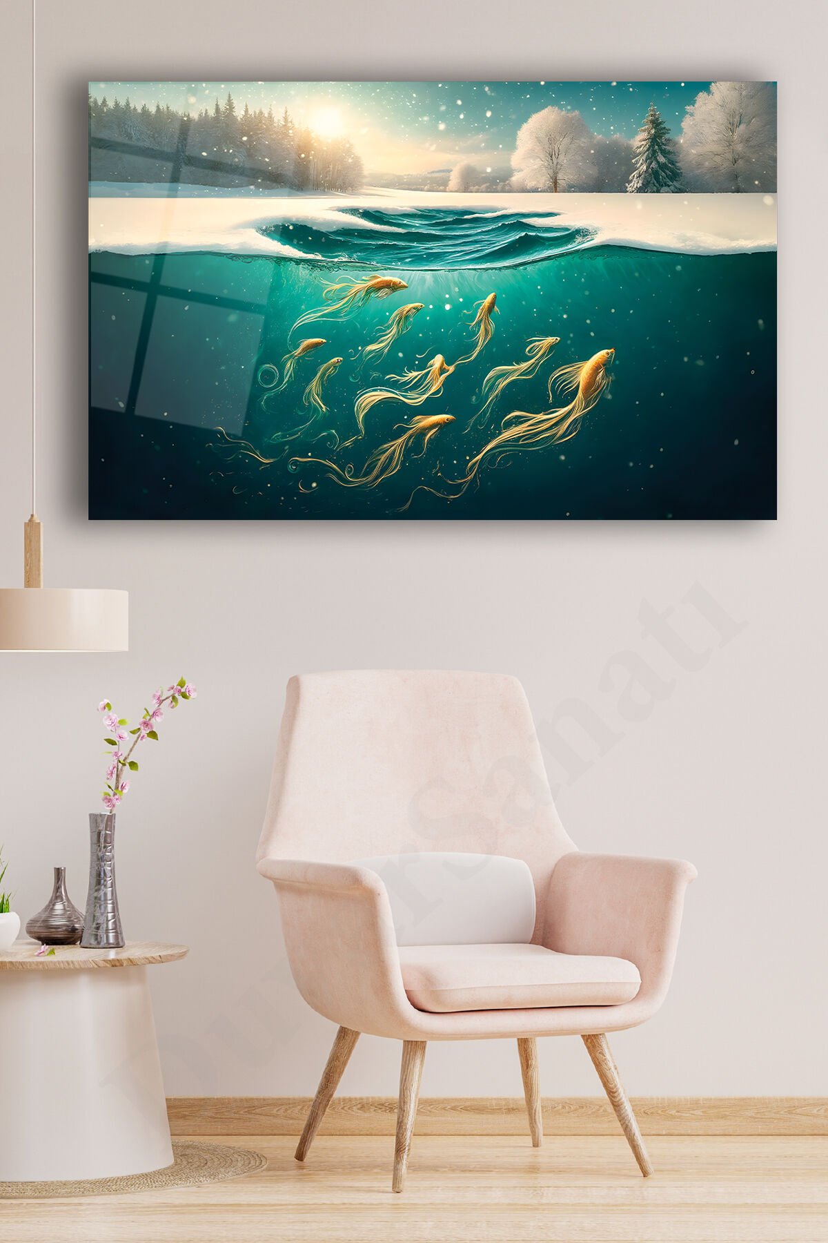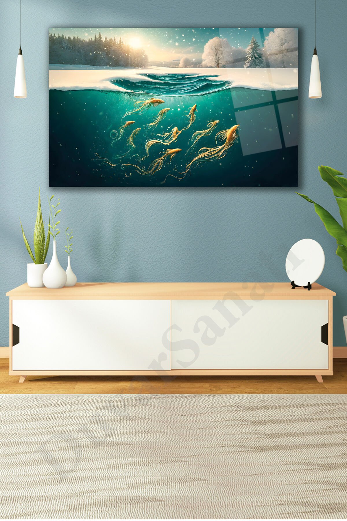 Soyut Gold Balıklar Cam Tablo, Modern Ev Ofis Salon Duvar Dekoru, Hediyelik Tablo Dekor Turkuaz