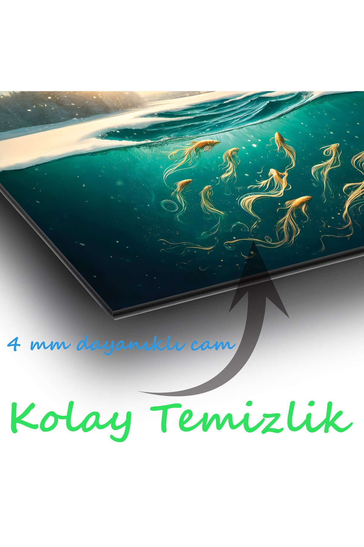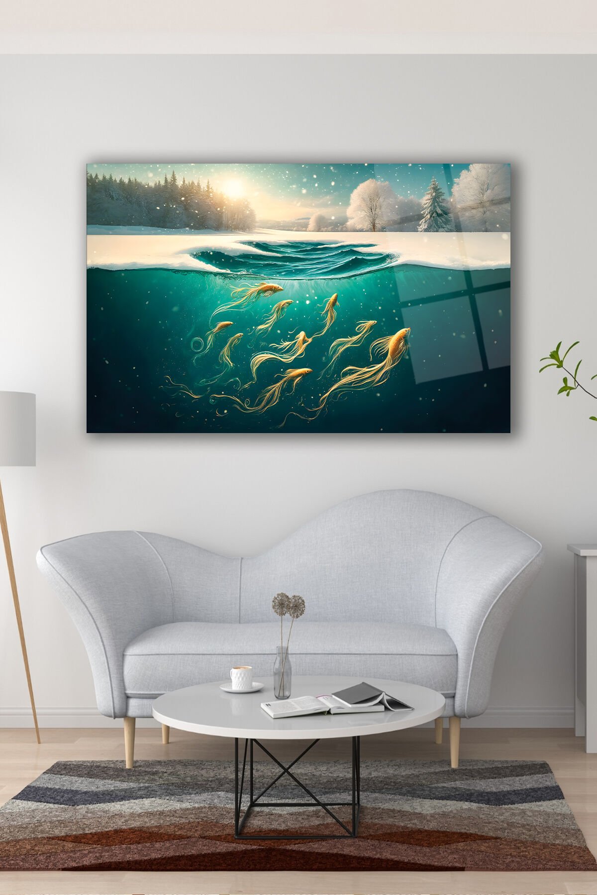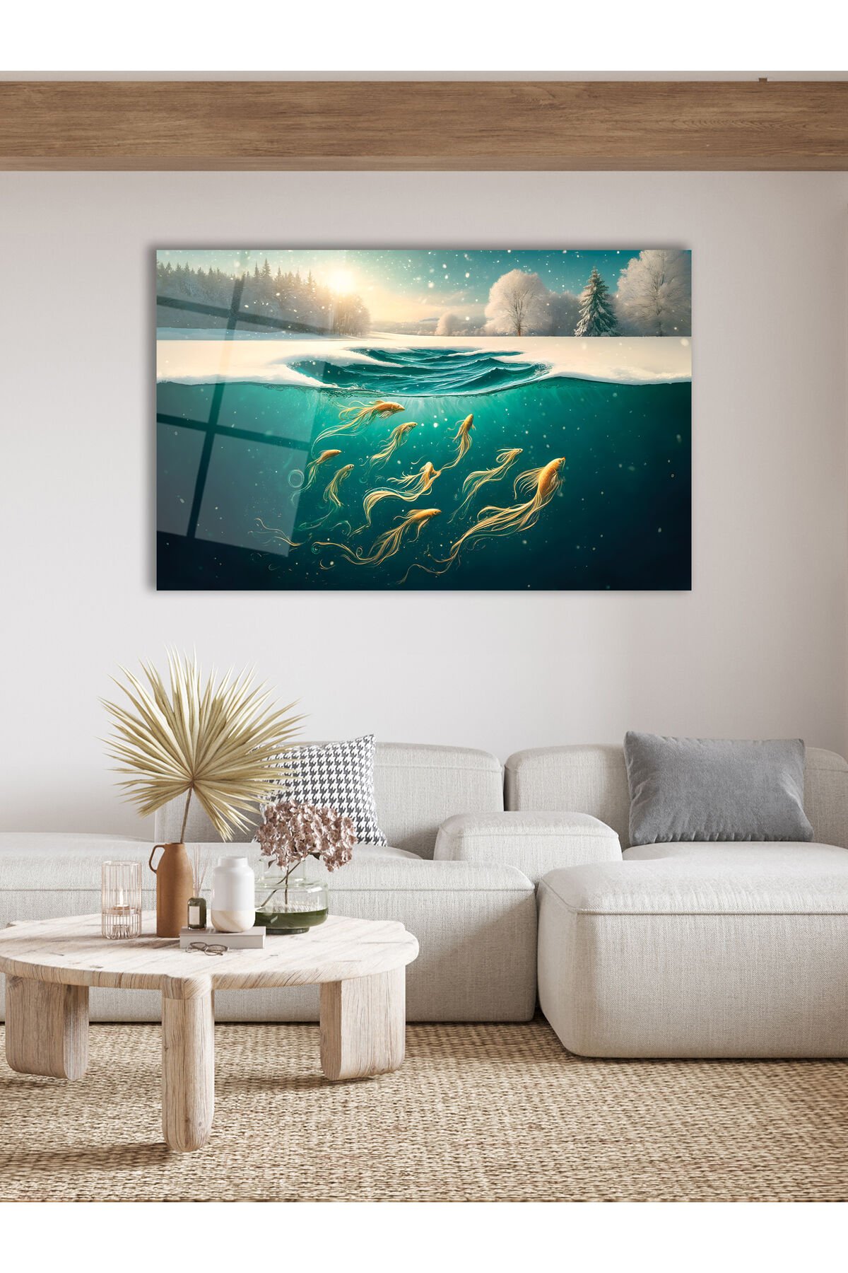 Soyut Gold Balıklar Cam Tablo, Modern Ev Ofis Salon Duvar Dekoru, Hediyelik Tablo Dekor Turkuaz