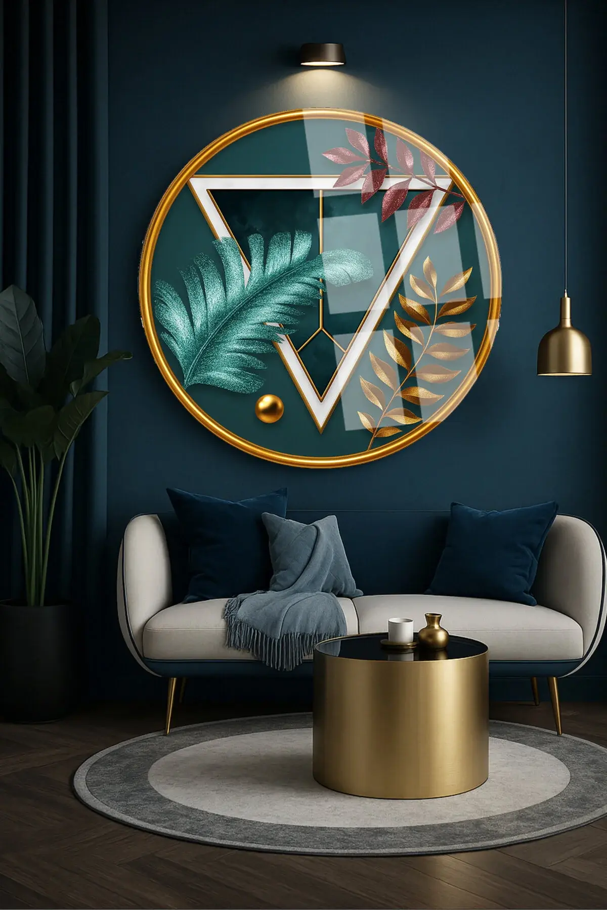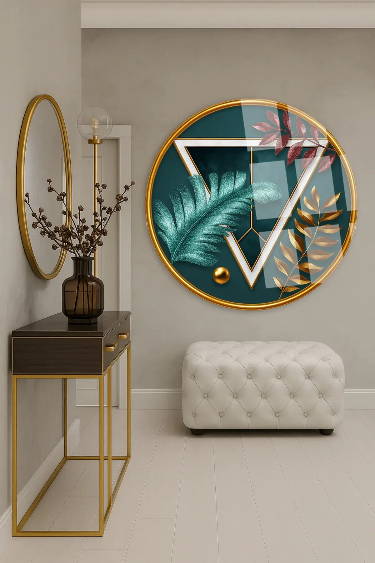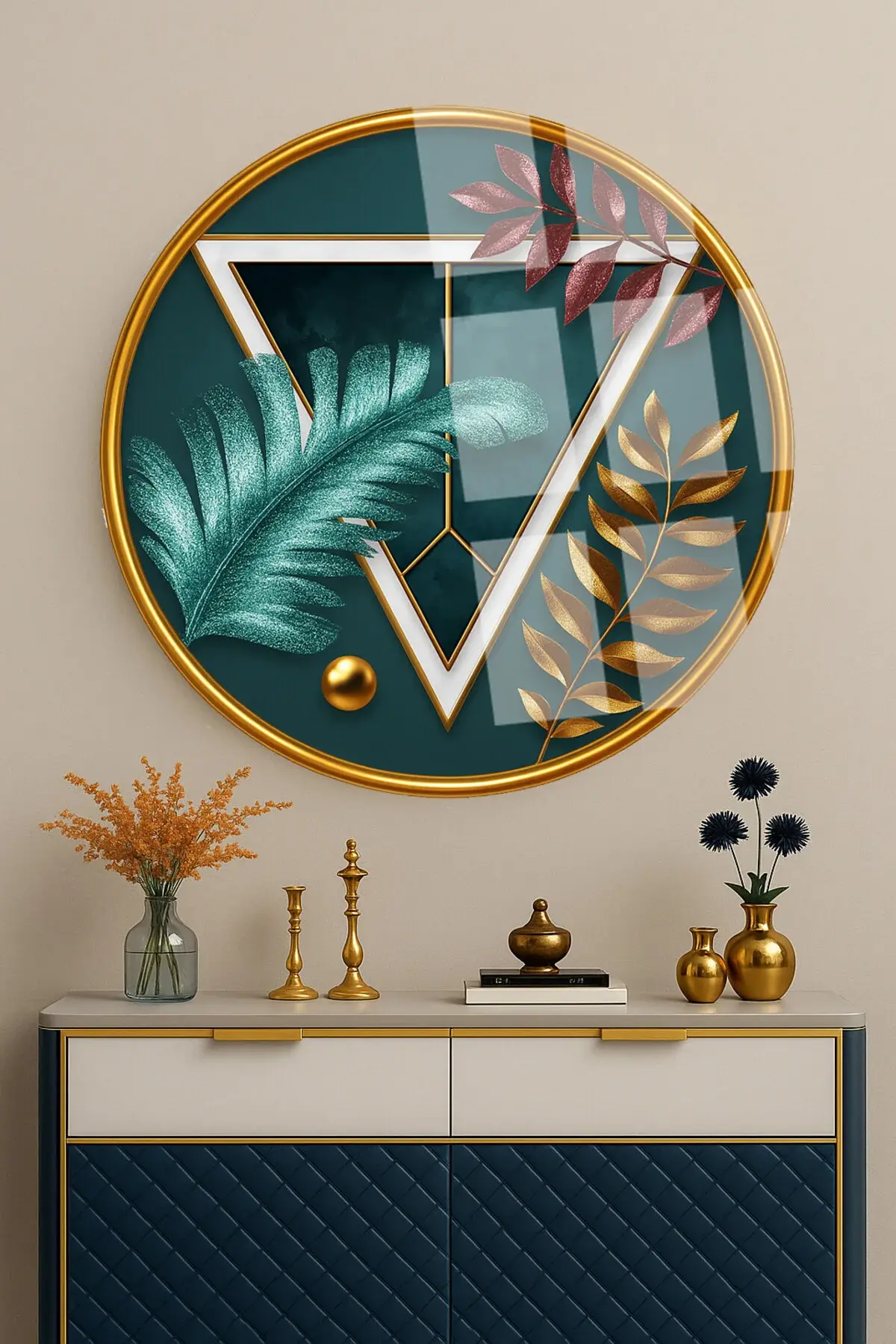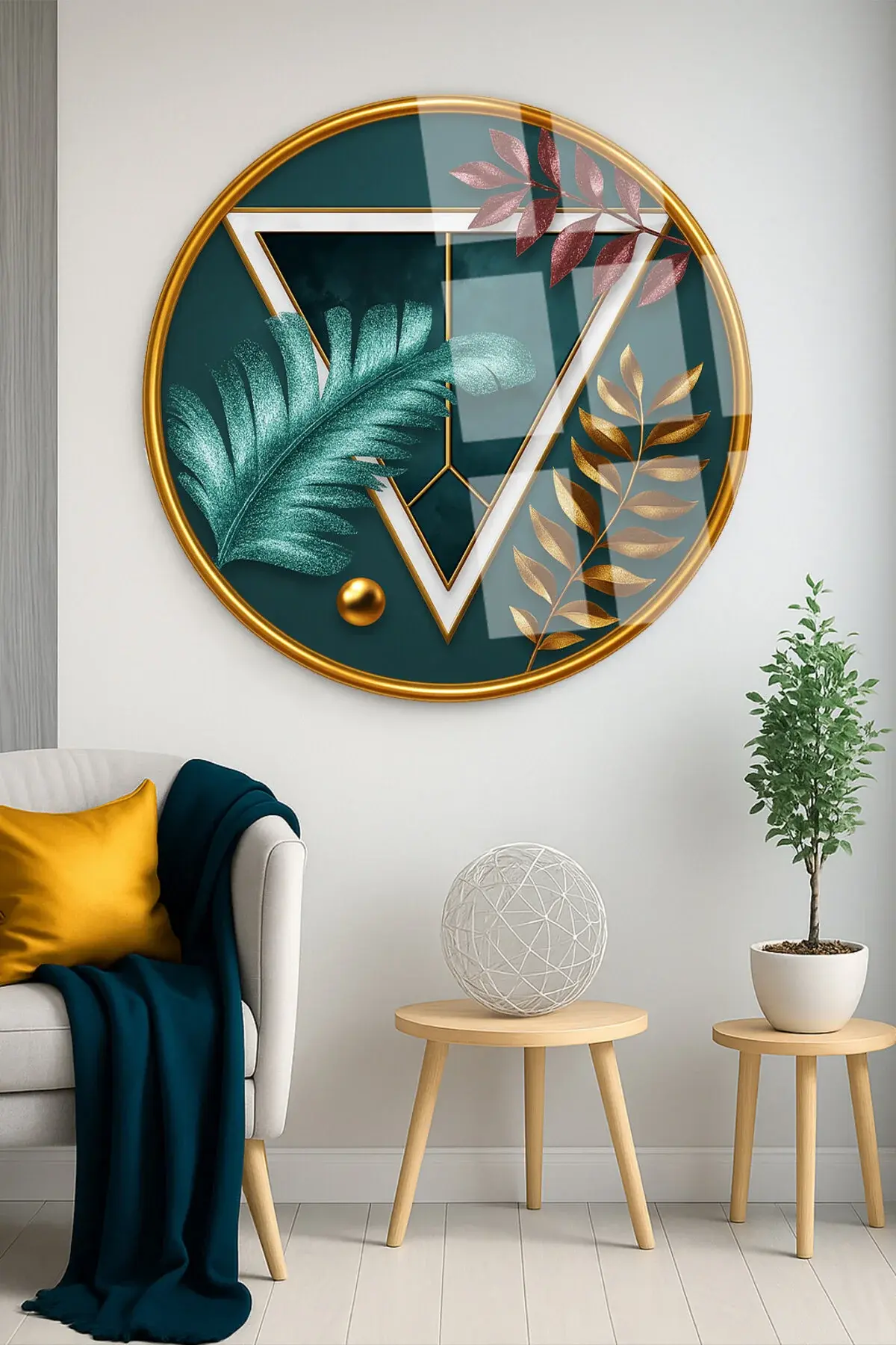 SOYUT YAPRAK VE GEOMETRİK ÇALIŞMA YUVARLAK KIRILMAZ MODERN CAM TABLO EV HEDİYESİ LÜKS ODA TABLOSU