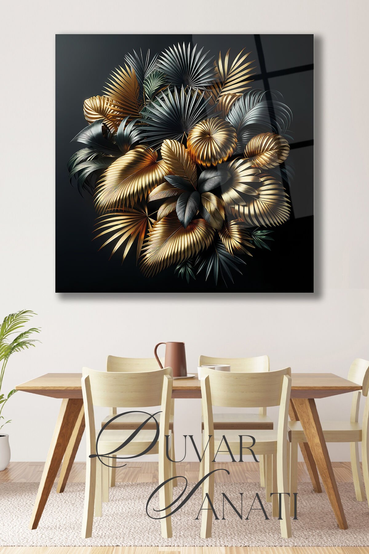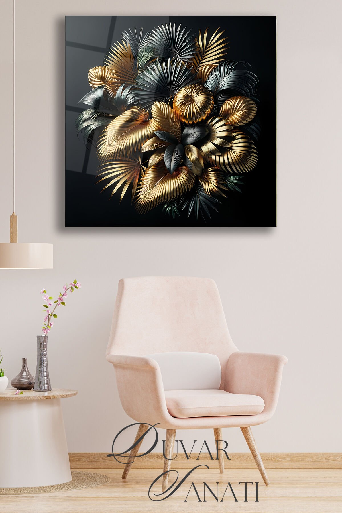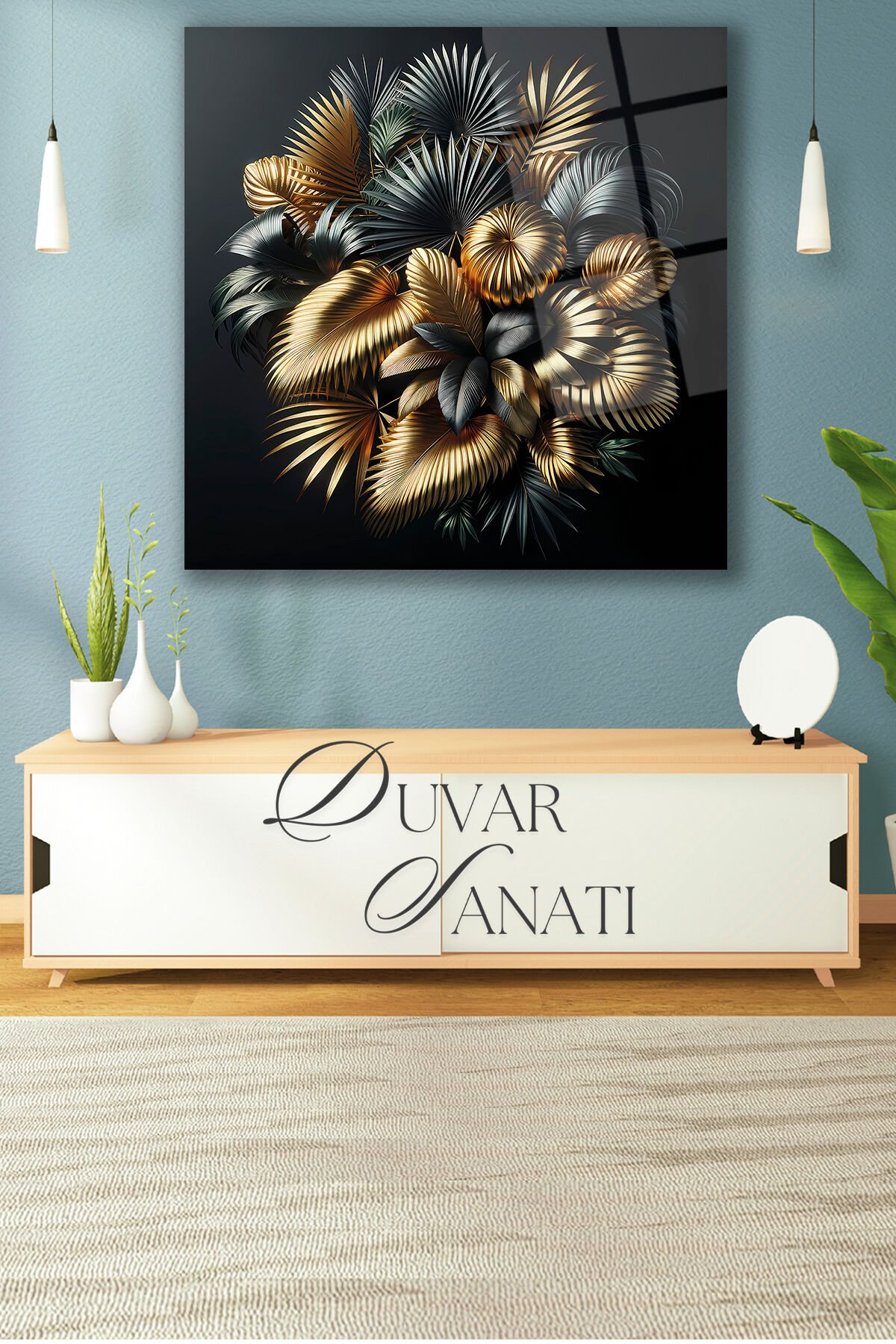 Soyut Yapraklar Modern Kare Cam Tablo Ev Ofis Salon Hediyelik Büyük Tablo Dekor Siyah Gold
