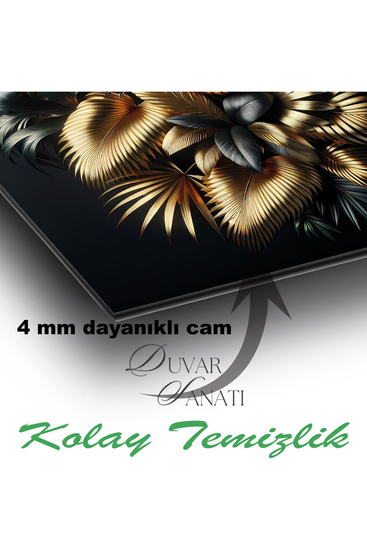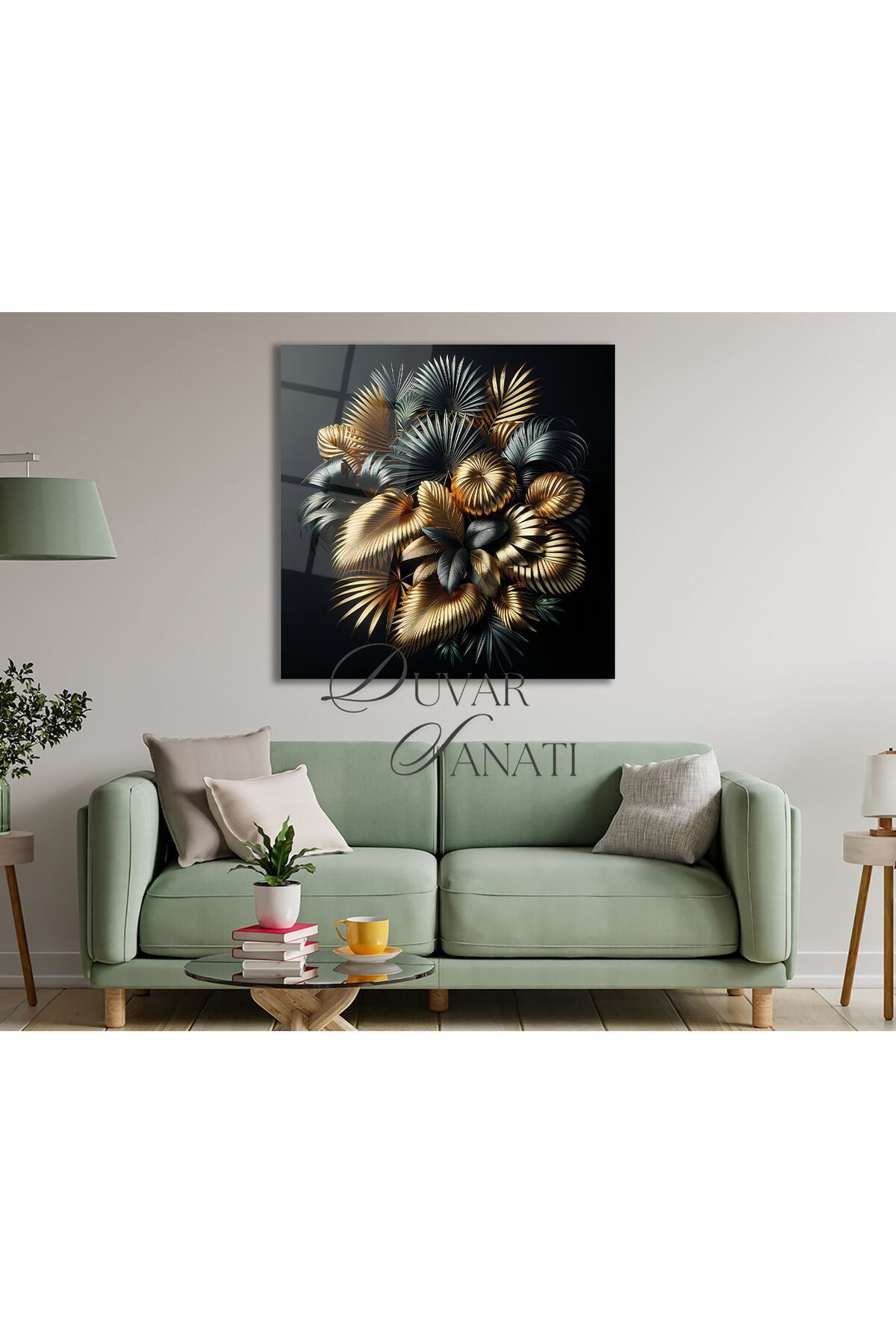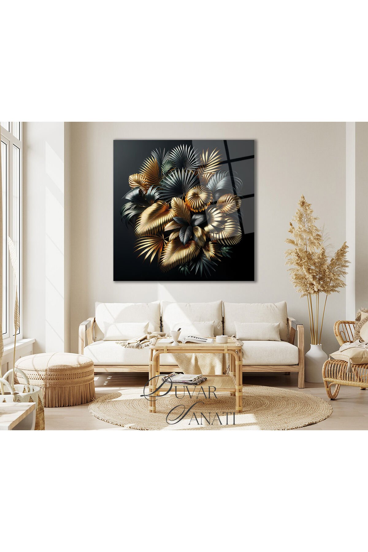 Soyut Yapraklar Modern Kare Cam Tablo Ev Ofis Salon Hediyelik Büyük Tablo Dekor Siyah Gold