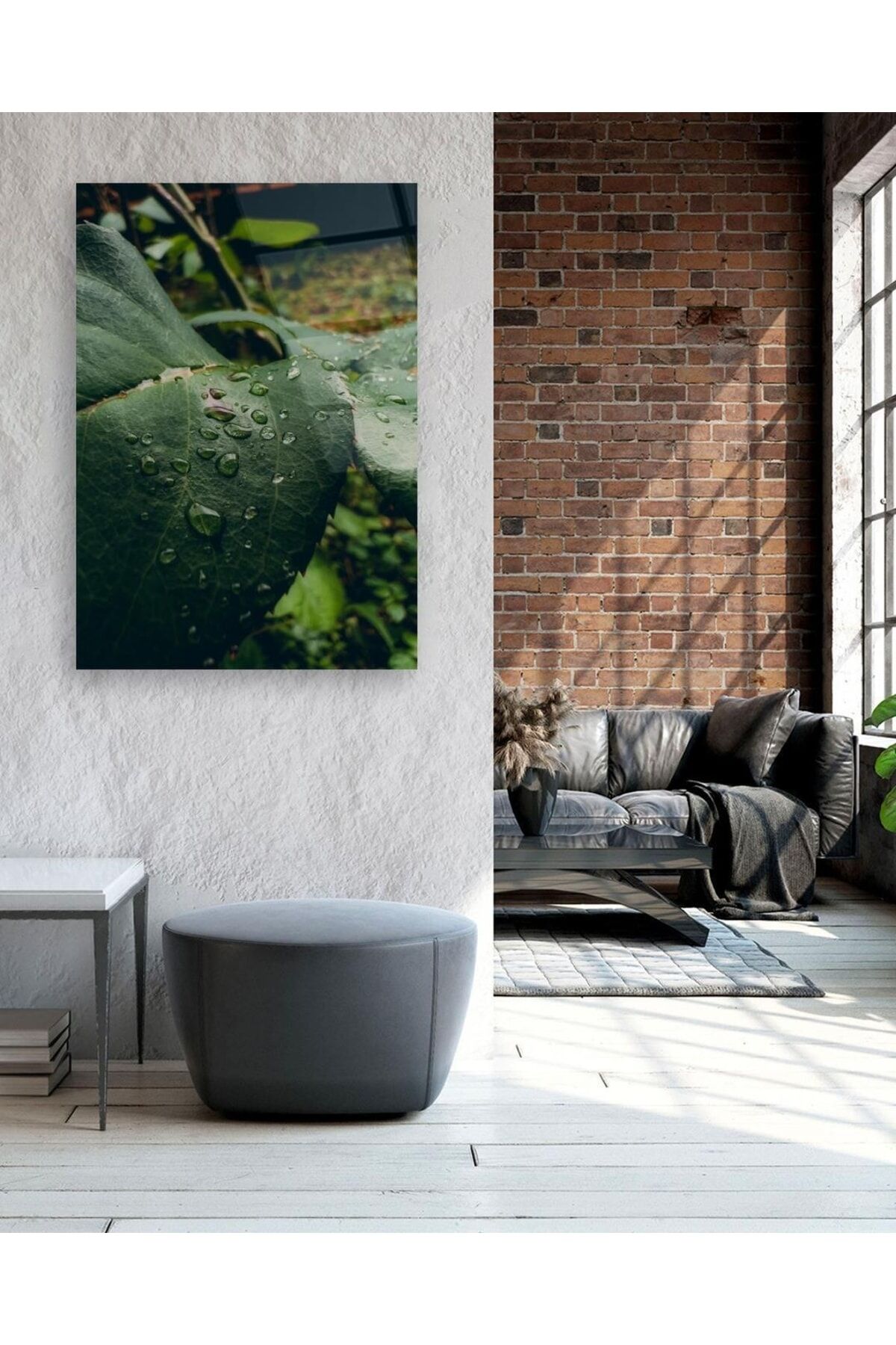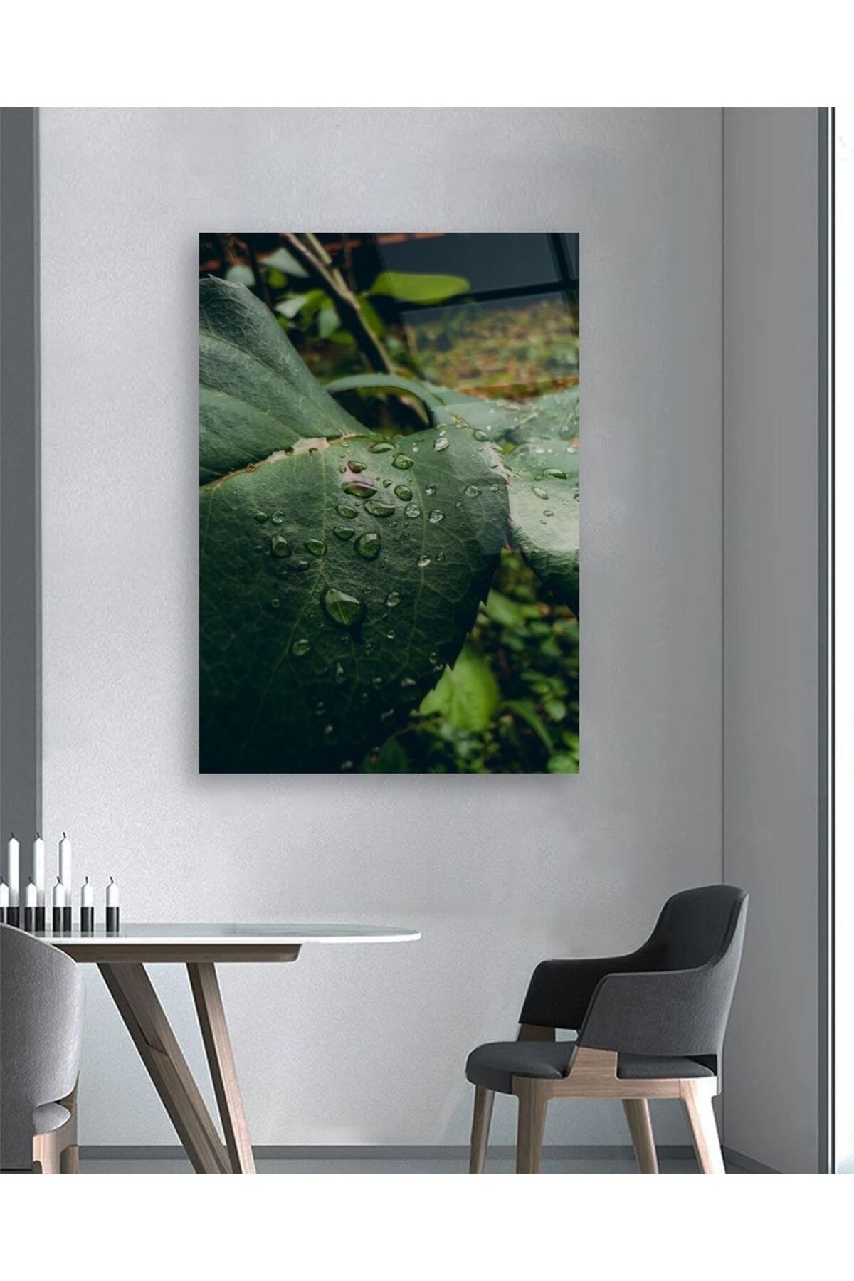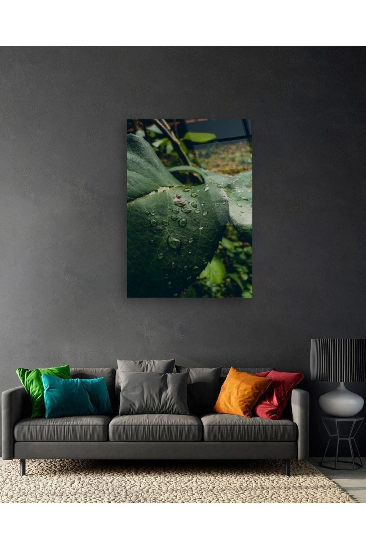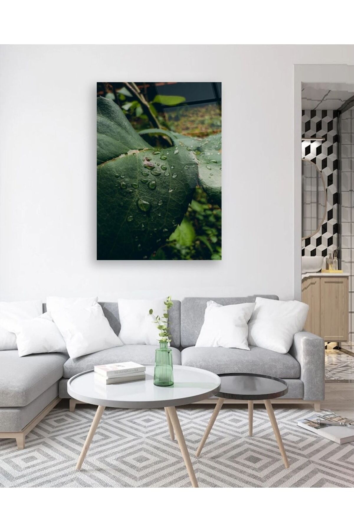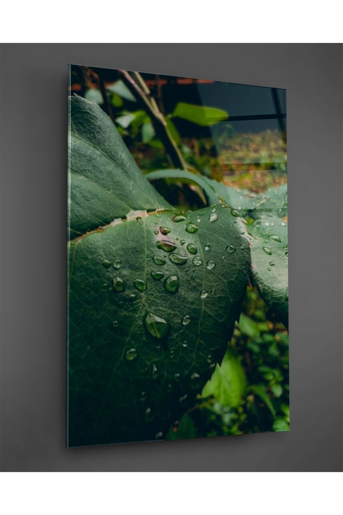 Su Damlalı Yeşil Yaprak Dikey Cam Tablo Renkli
