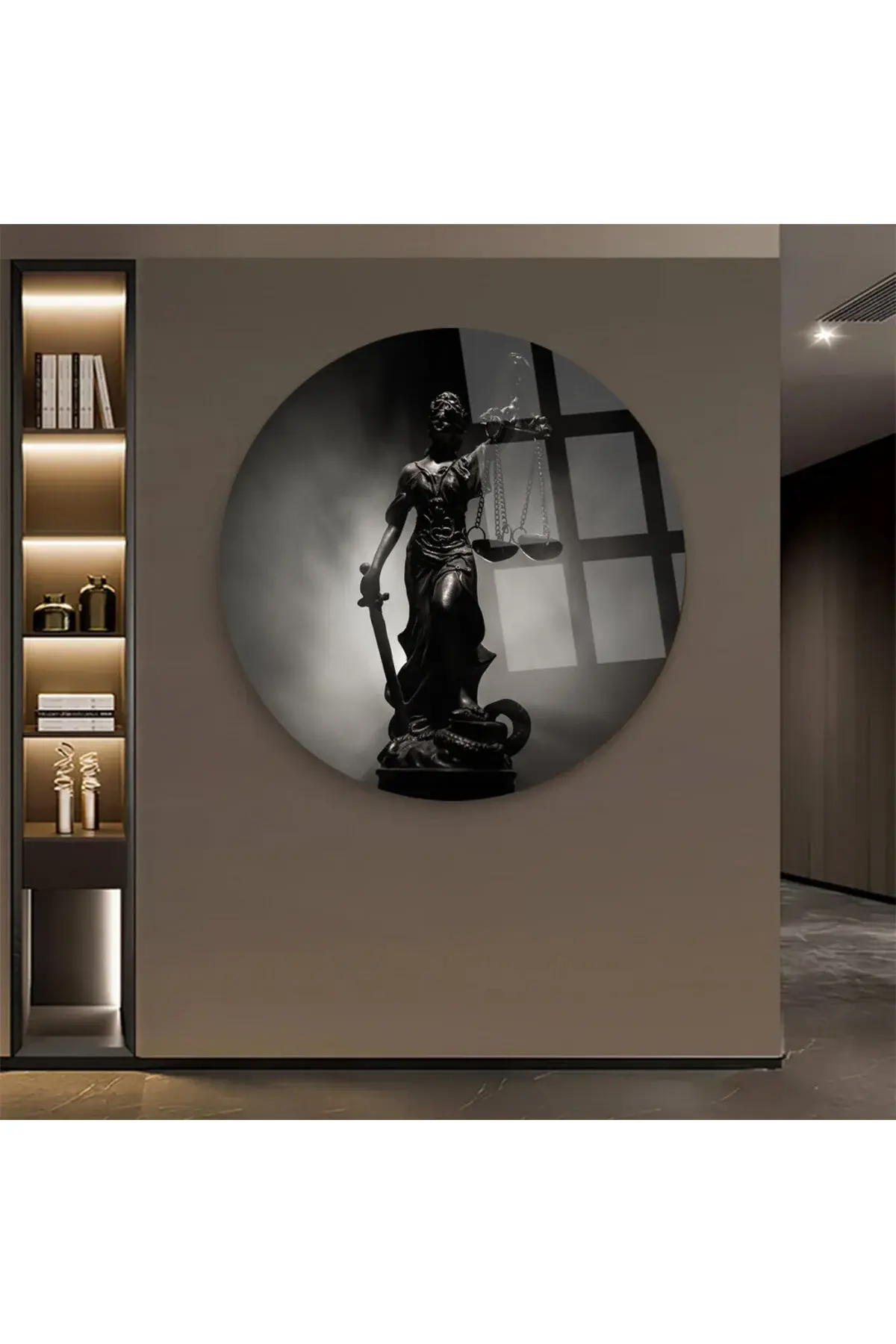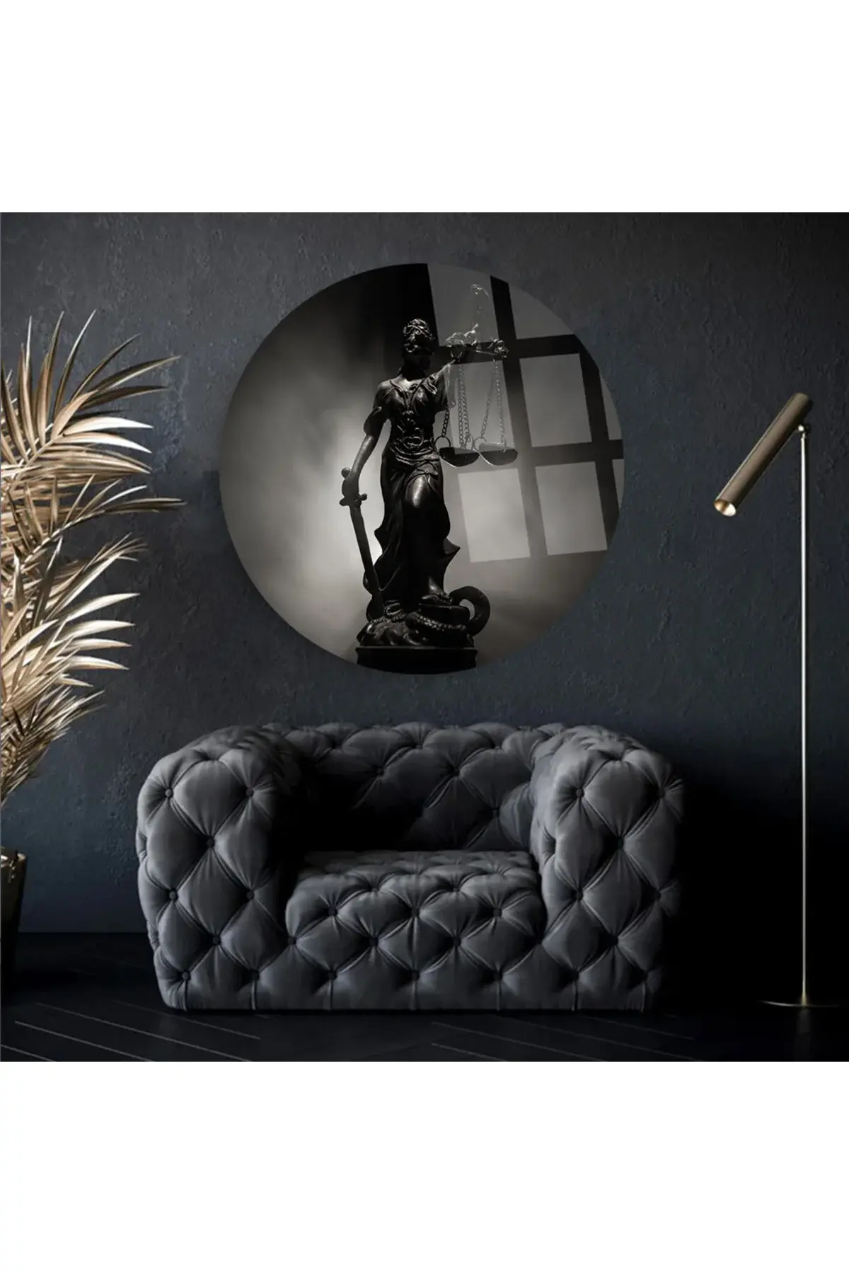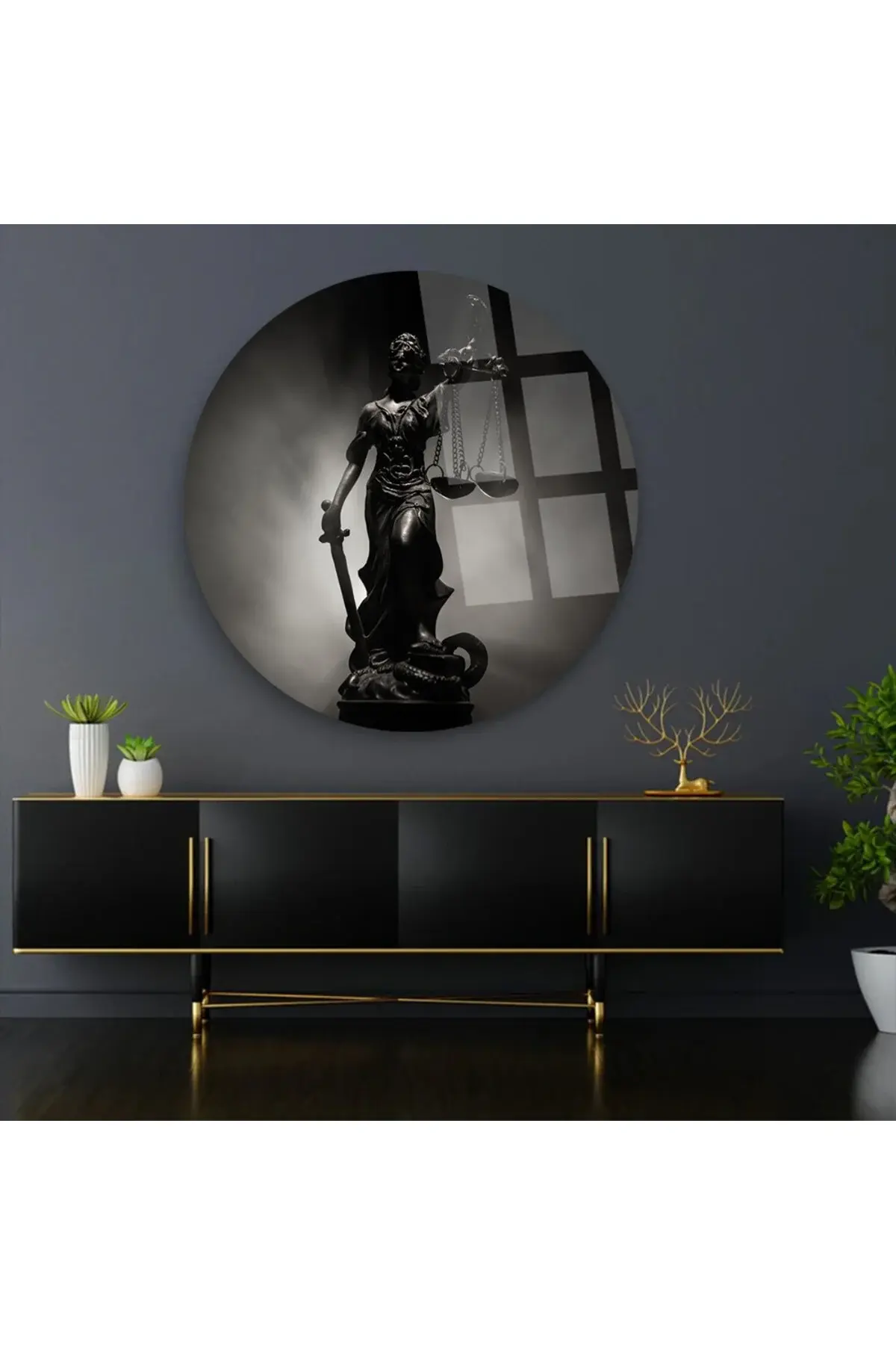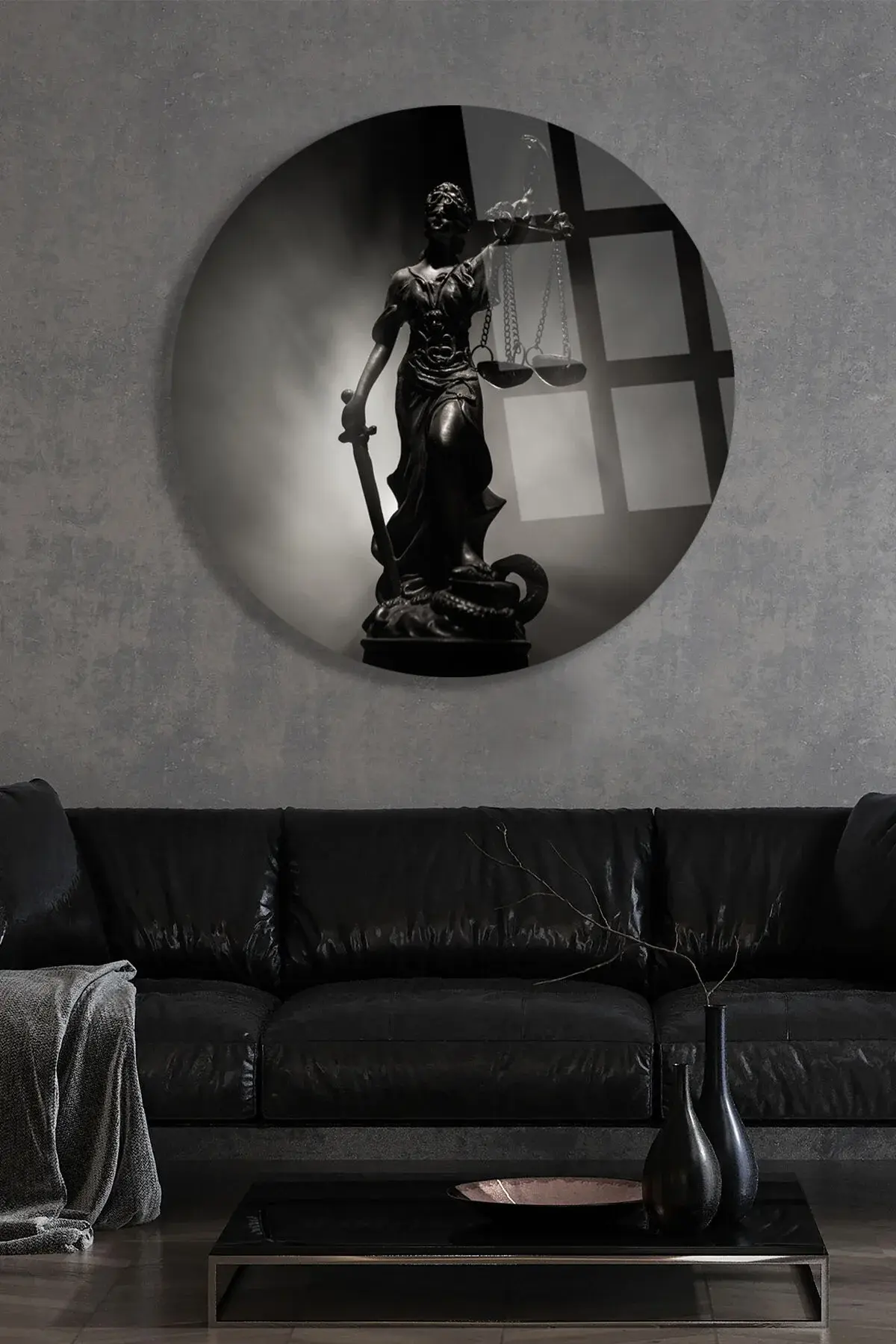 THEMİS HEYKELİ AVUKATLIK TABLOSU YUVARLAK ŞIK VE LÜKS KIRILMAZ MODERN CAM TABLO EV HEDİYESİ TABLO Siyah