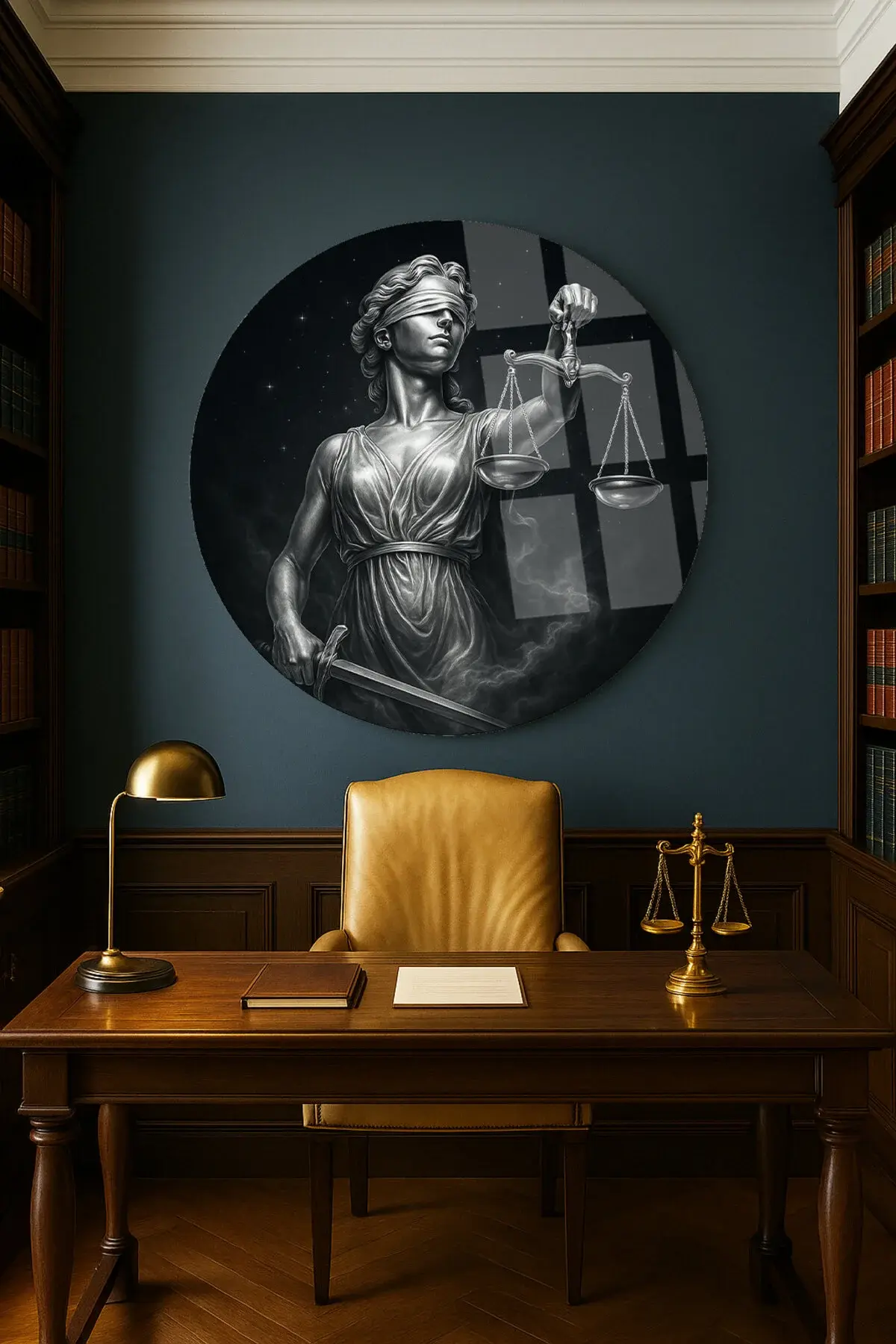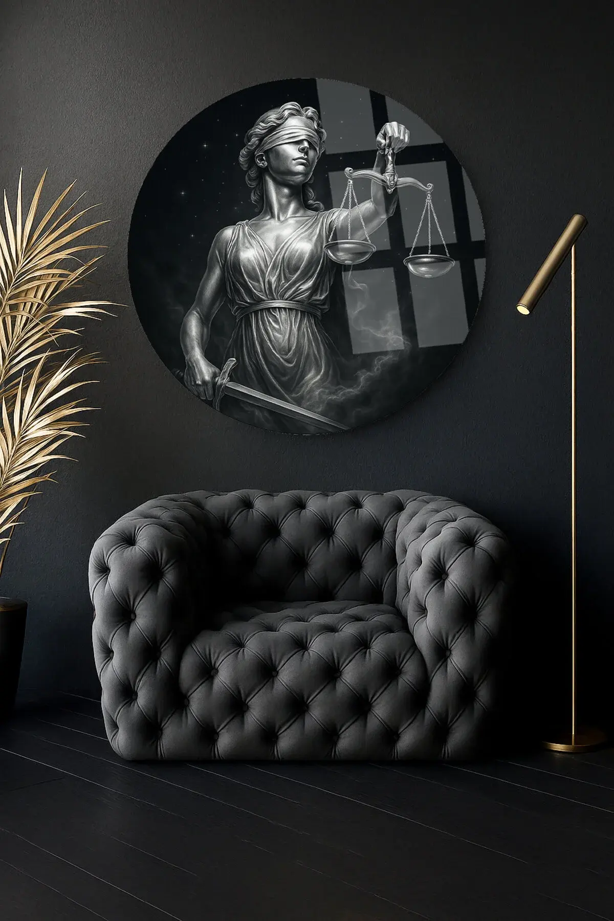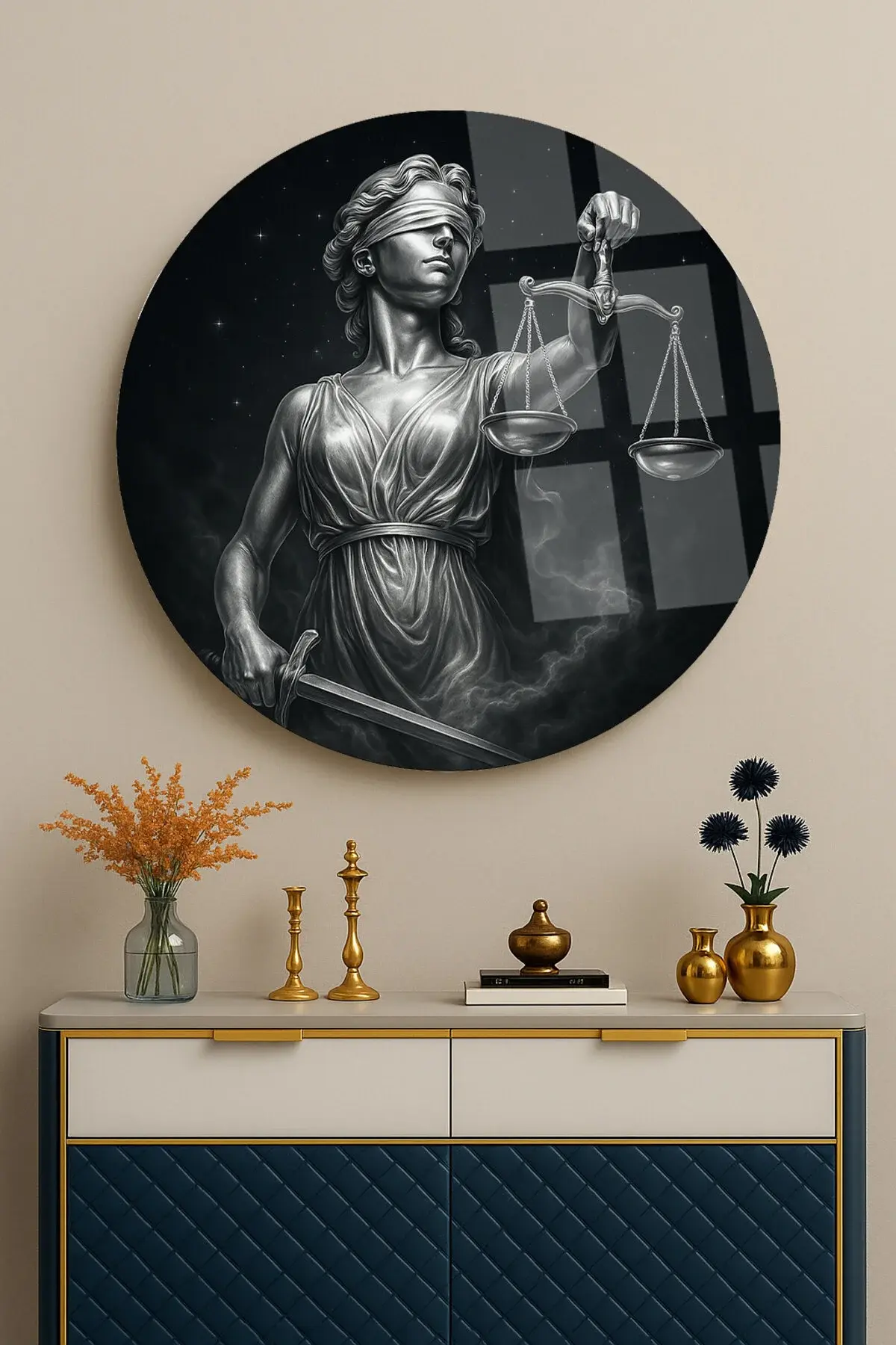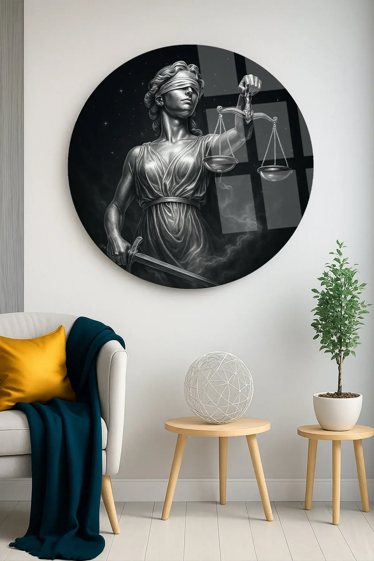 THEMİS HEYKELİ GÜMÜŞ TASARIMI AVUKAT TABLOSU MODERN YUVARLAK KIRILMAZ CAM TABLO LÜKS HEDİYE TABLO