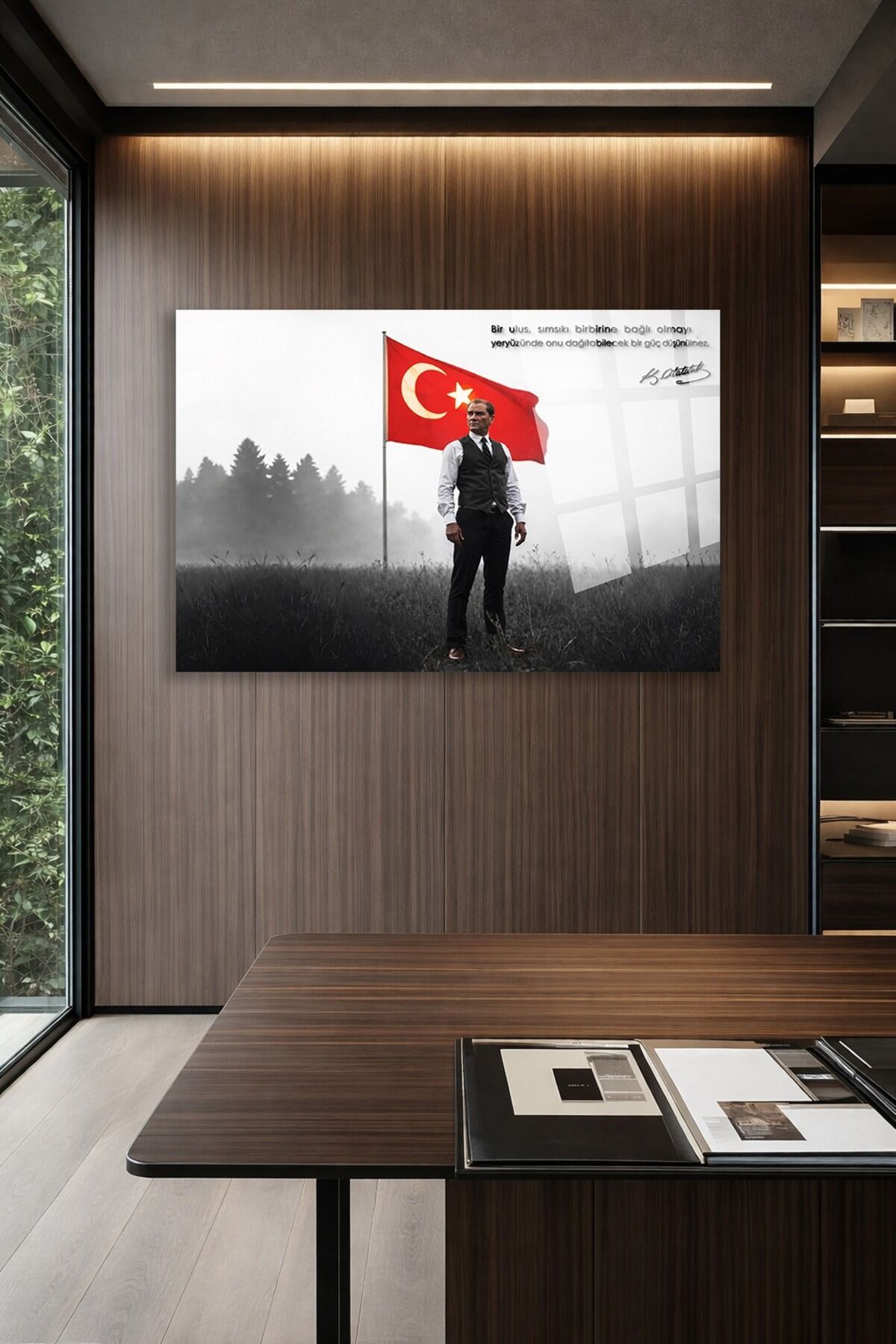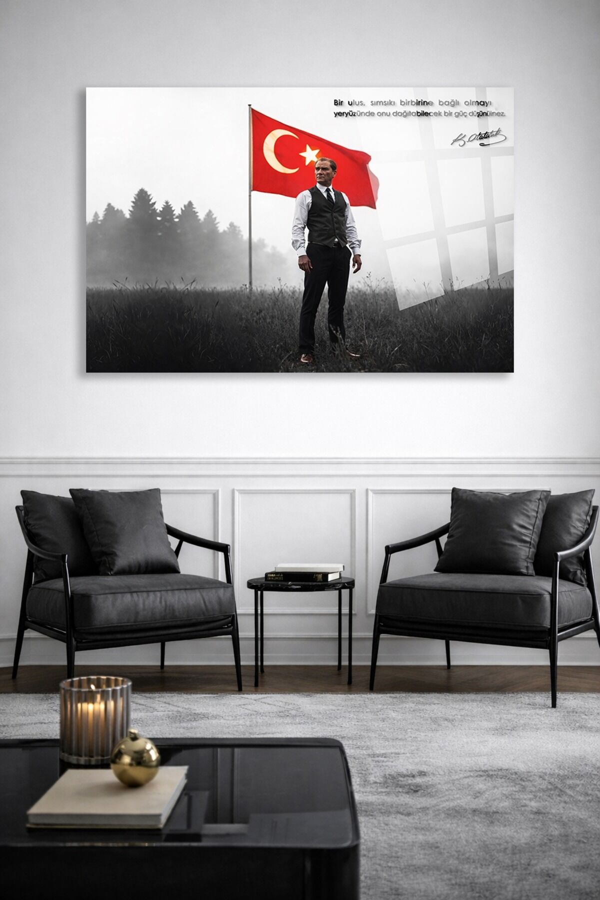TÜRK BAYRAĞI ÖNÜNDE ATATÜRK KIRILMAZ CAM TABLO ULTRA CANLI RENKLER EV OFİS SALON HEDİYESİ Çok Renkli