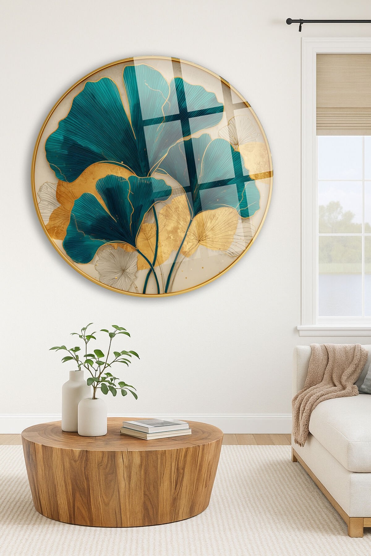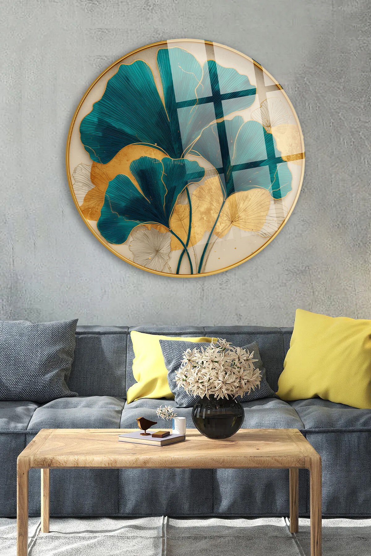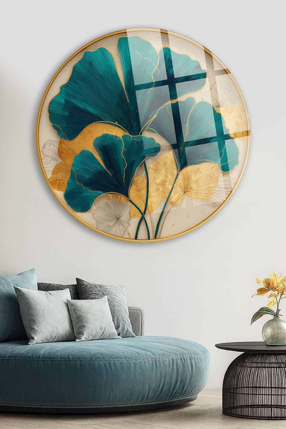 TURKUAZ ALTIN GİNKGO YAPRAK DESENİ MODERN SANAT KIRILMAZ LÜKS CAM TABLO Turkuaz