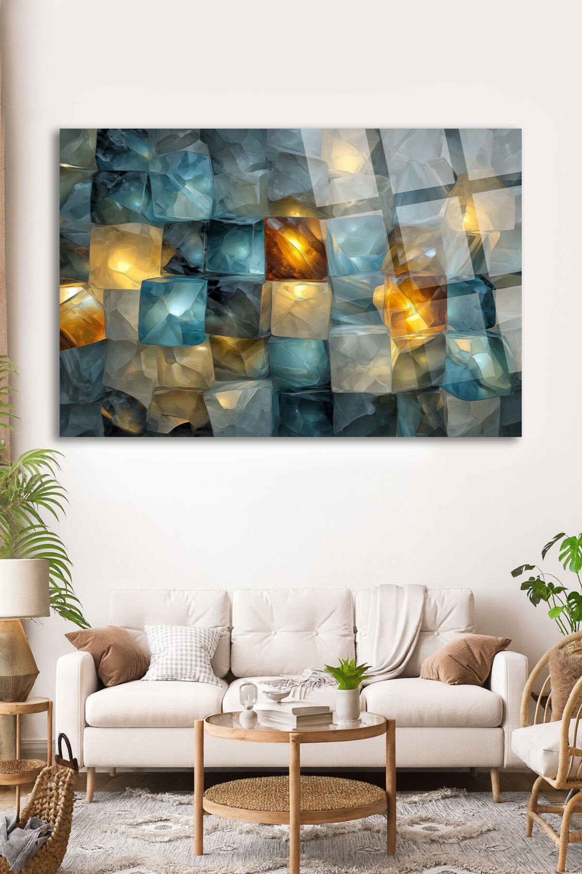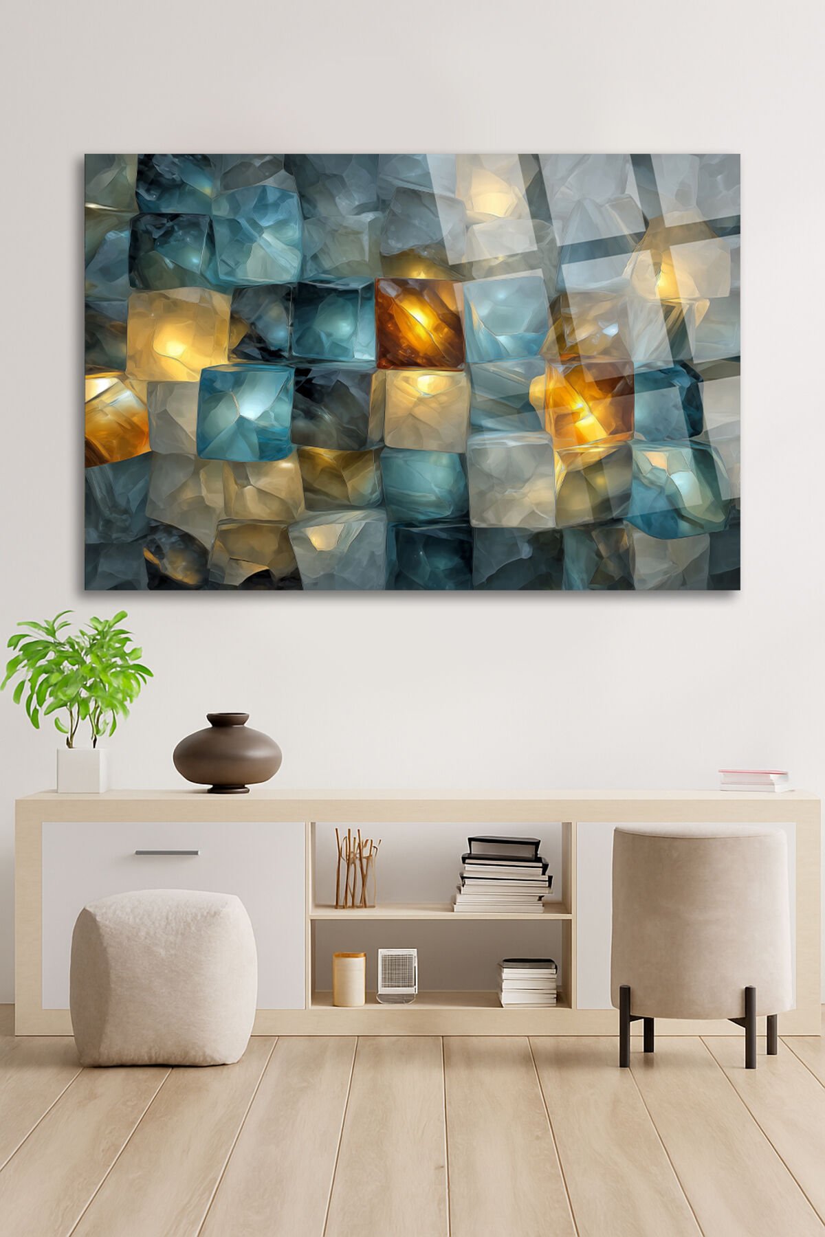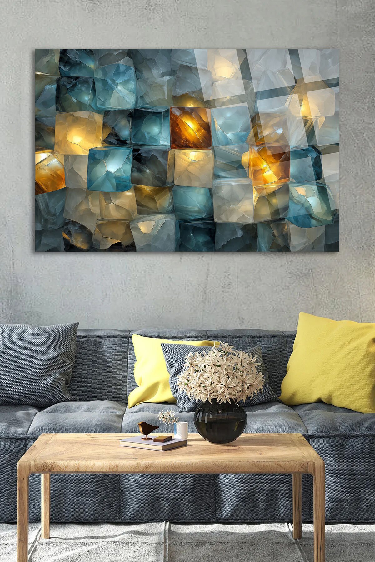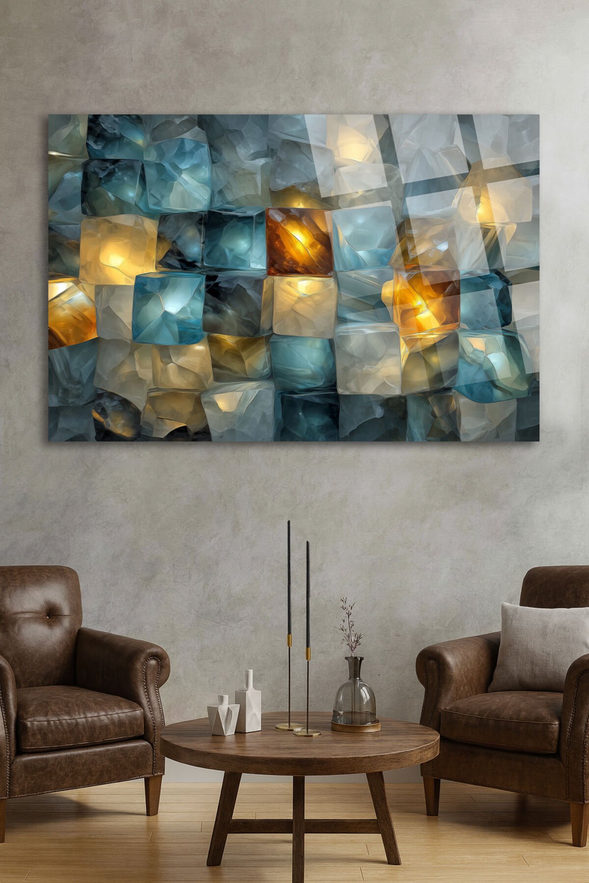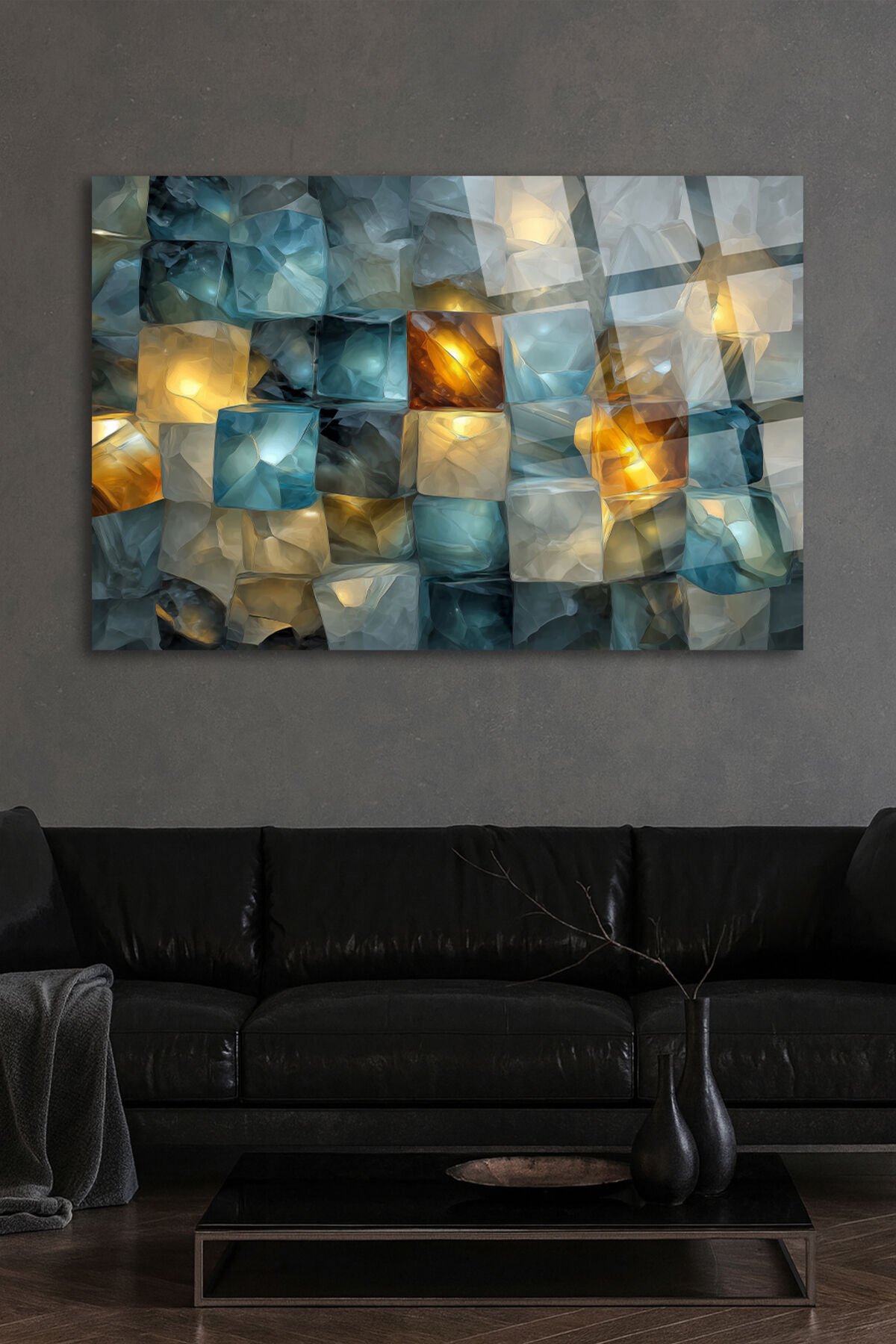 TURKUAZ VE ALTIN IŞIK YANSIMALARIYLA KRİSTAL MOZAİK SANATSAL DUVAR TABLOSU KIRILMAZ LÜKS CAM TABLO Turkuaz