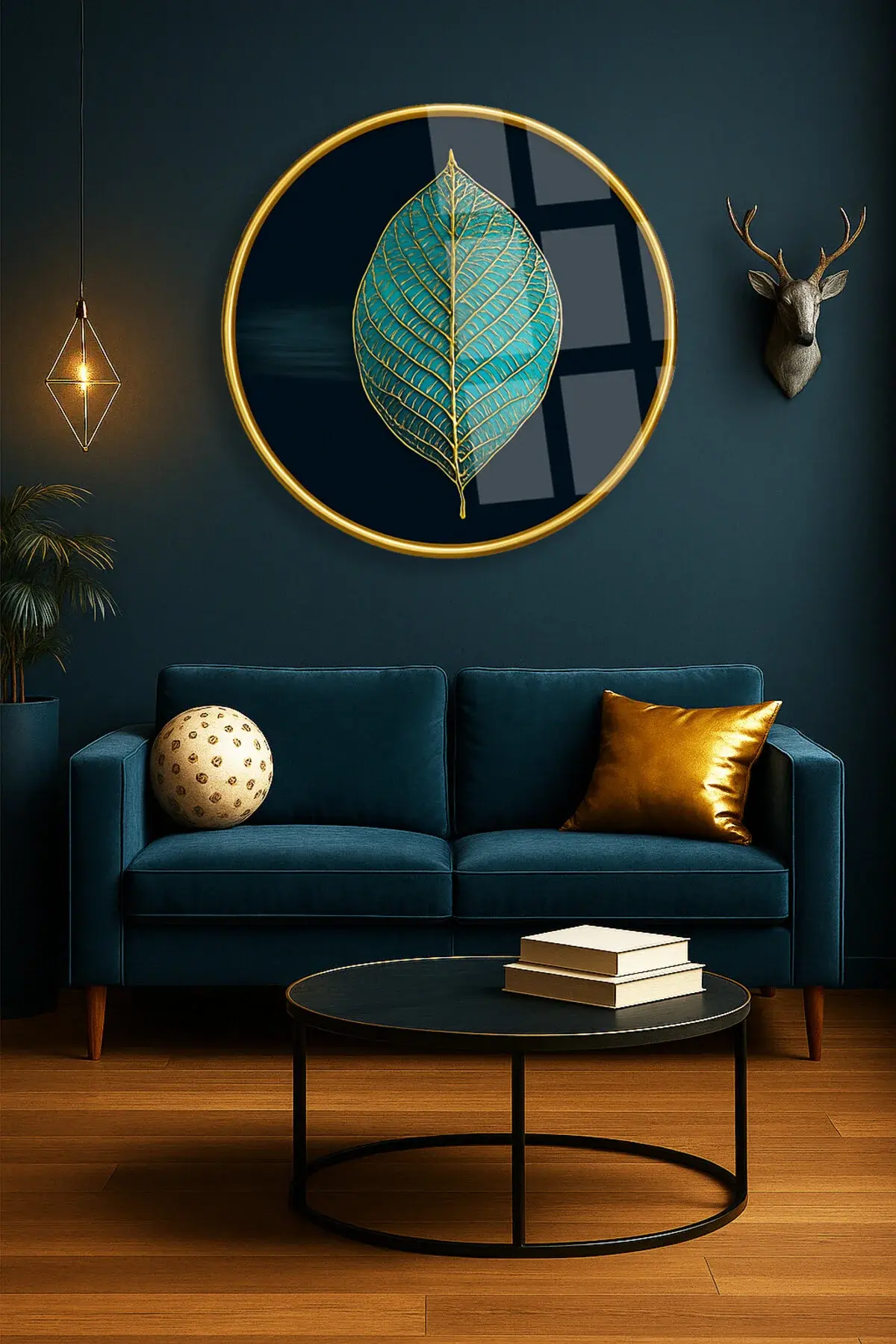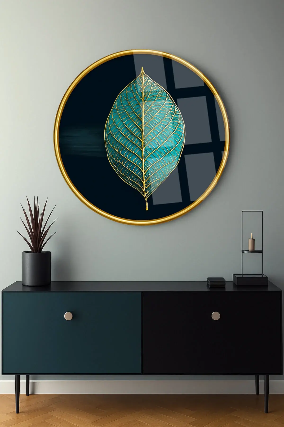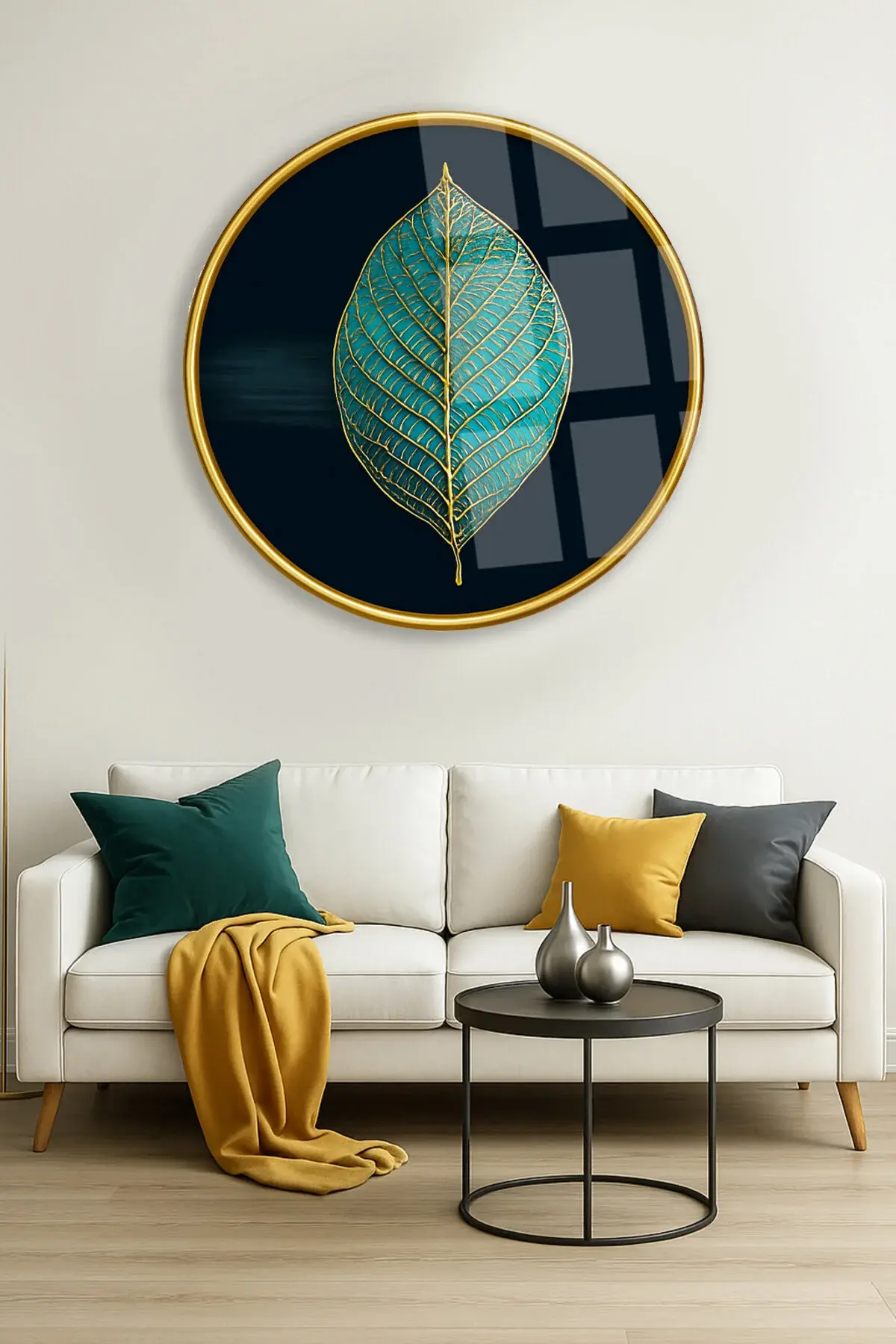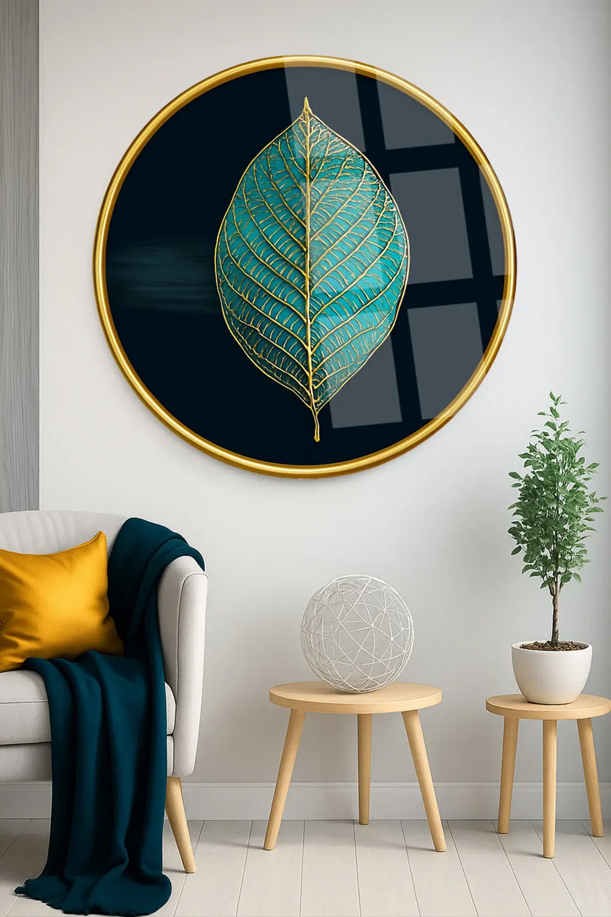 TURKUAZ YAPRAK TASARIMI YUVARLAK KIRILMAZ MODERN CAM TABLO EV HEDİYESİ LÜKS ODA TABLOSU Turkuaz